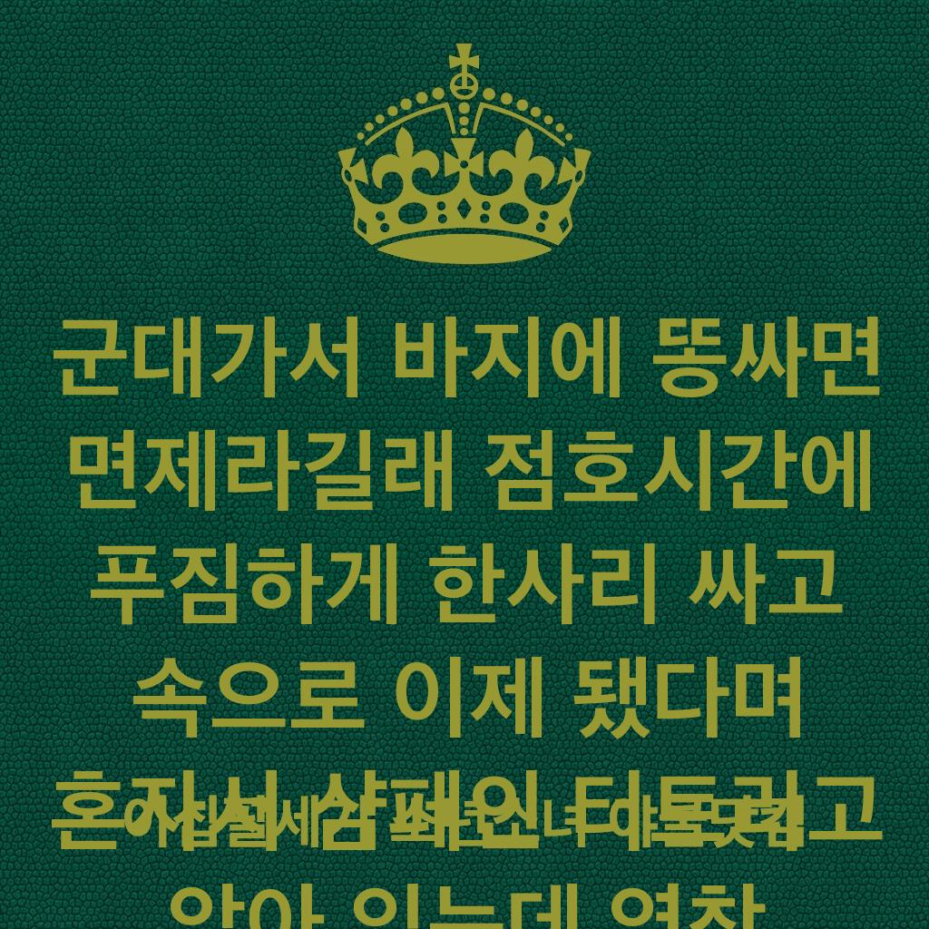 군대가서 바지에 똥싸면 면제라길래 점호시간에 푸짐하게 한사리 싸고 속으로 이제 됐다며 혼자서 샴페인 터트리고 앉아 있는데 영창 독방에서
