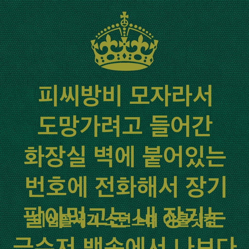 피씨방비 모자라서 도망가려고 들어간 화장실 벽에 붙어있는 번호에 전화해서 장기 팔아먹고는 내 장기는 금수저 뱃속에서 나보다 더 잘먹고 잘살거라는 사실에 부러워서 자살할 새끼