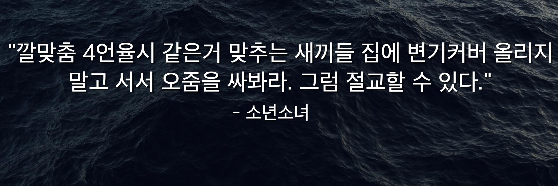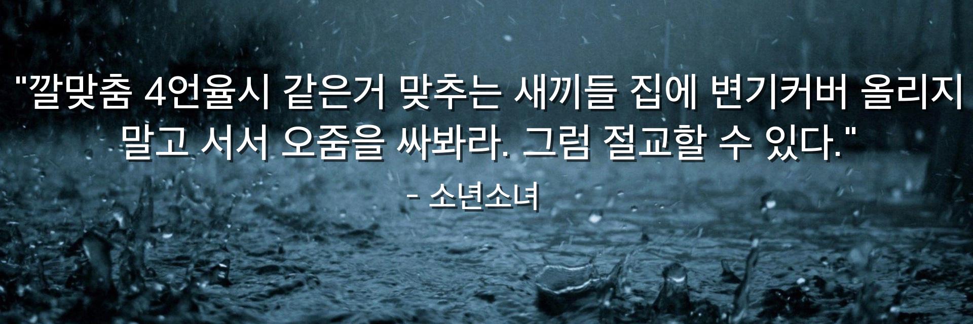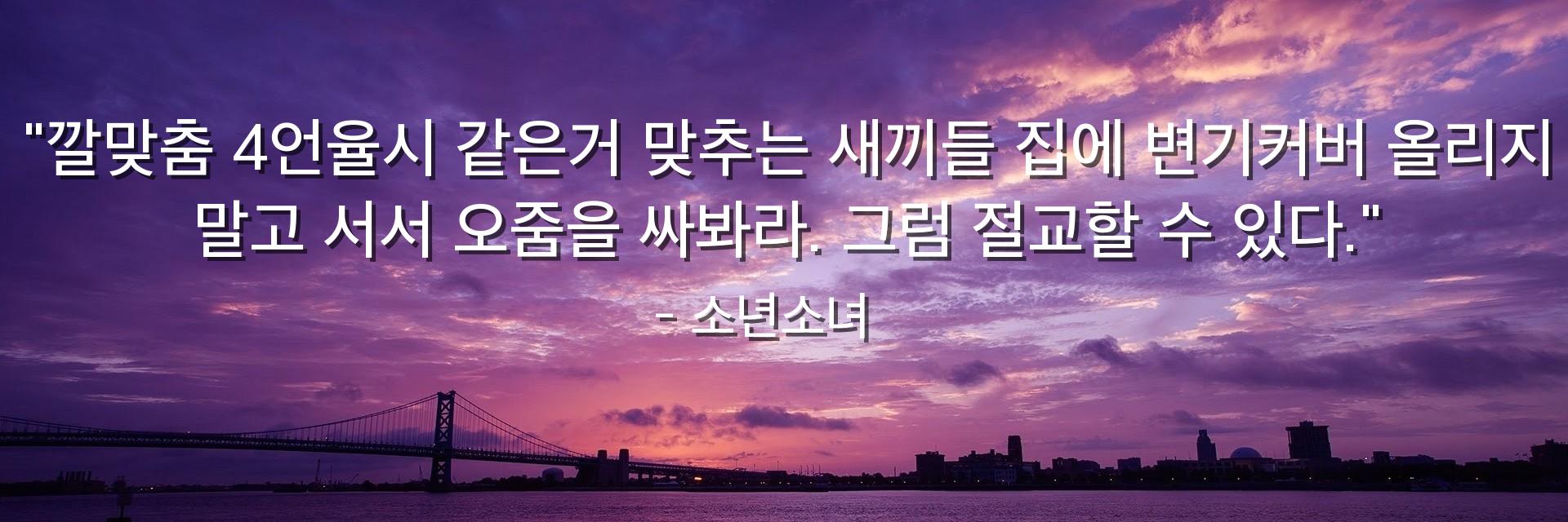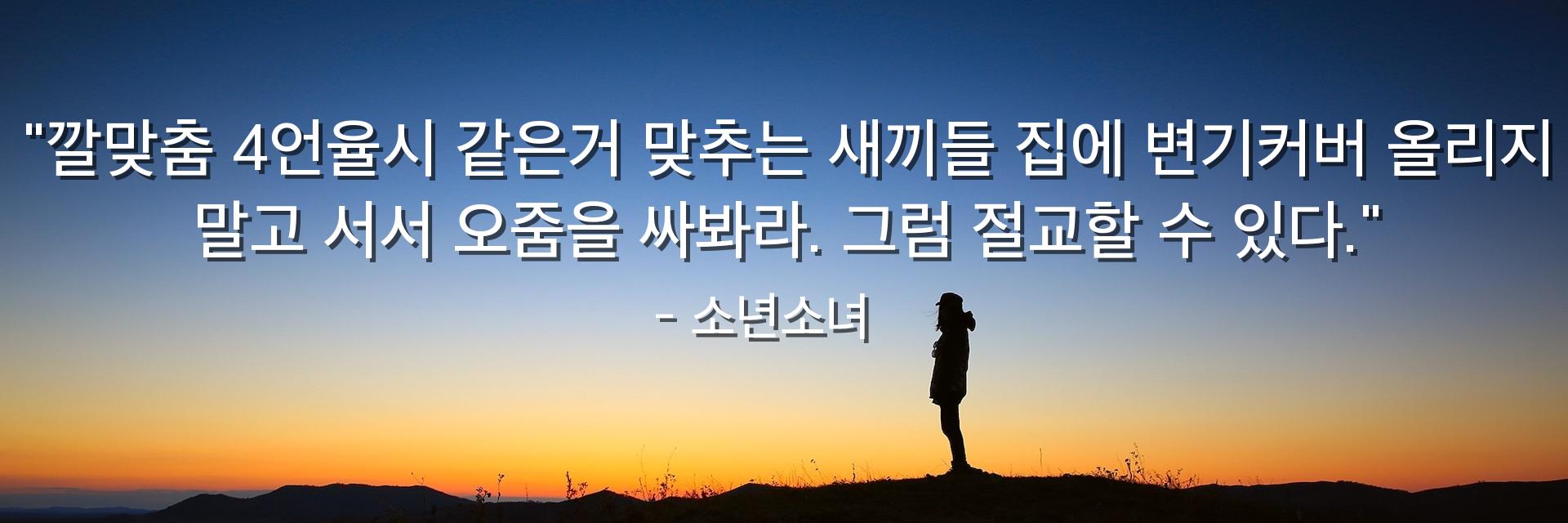 "깔맞춤 4언율시 같은거 맞추는 새끼들 집에 변기커버 올리지 말고 서서 오줌을 싸봐라. 그럼 절교할 수 있다."