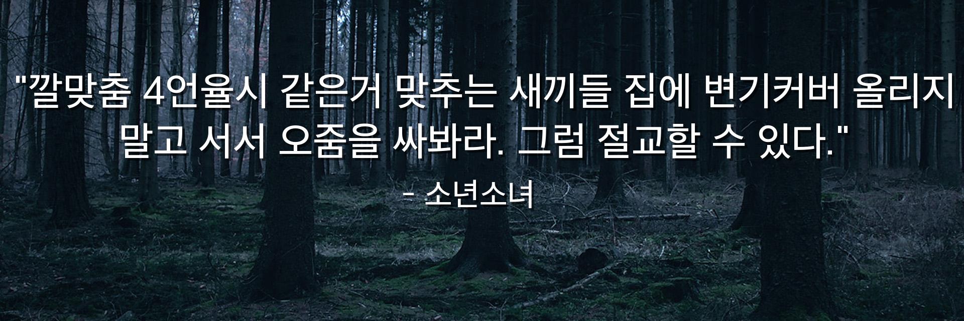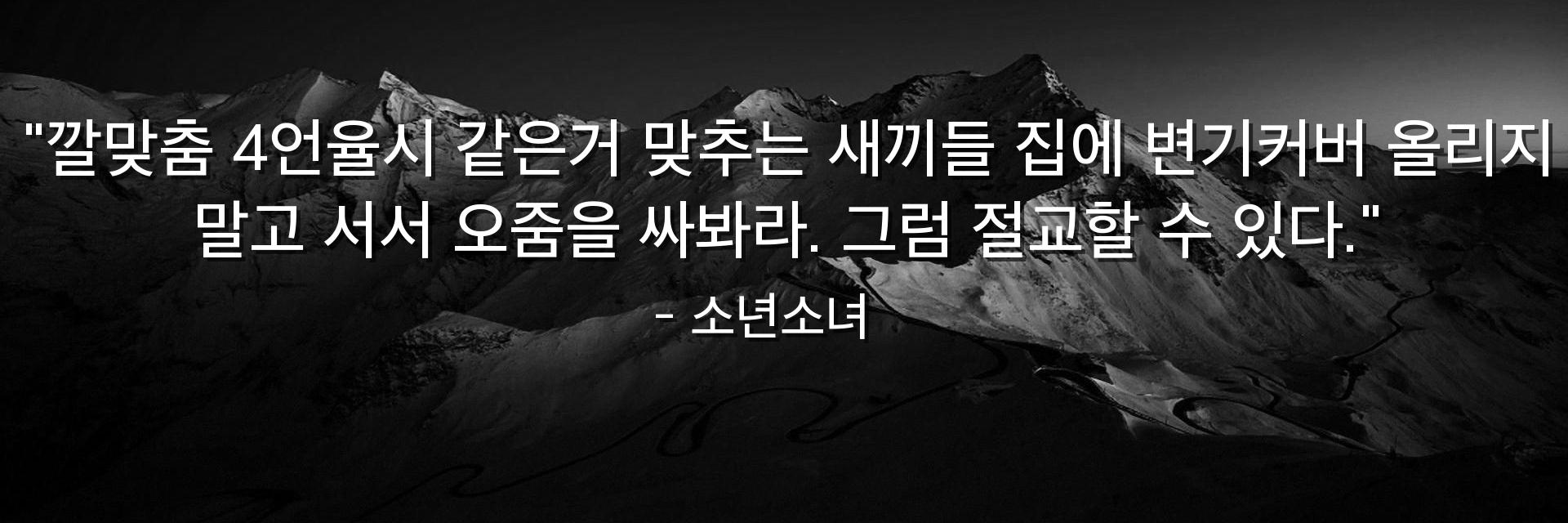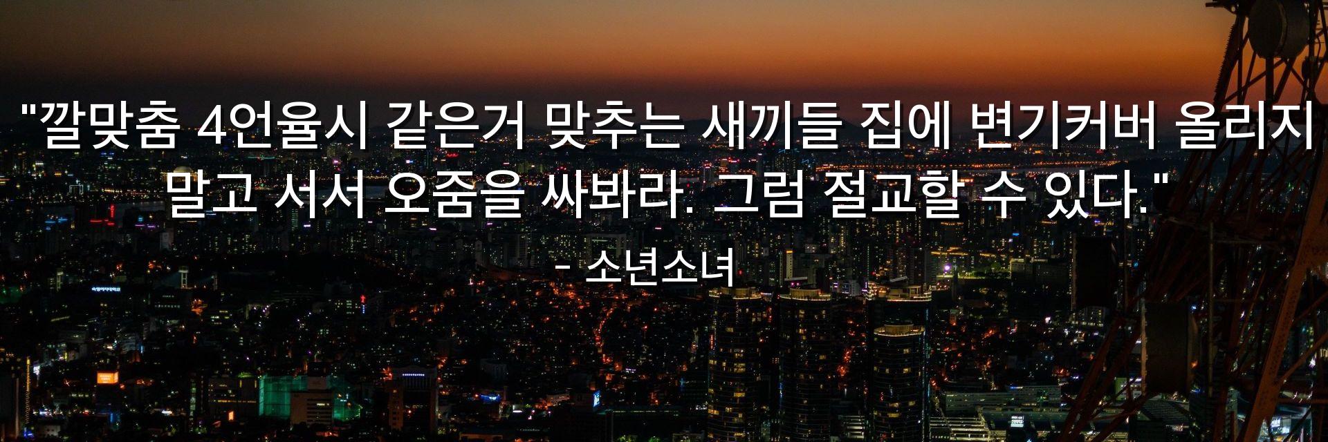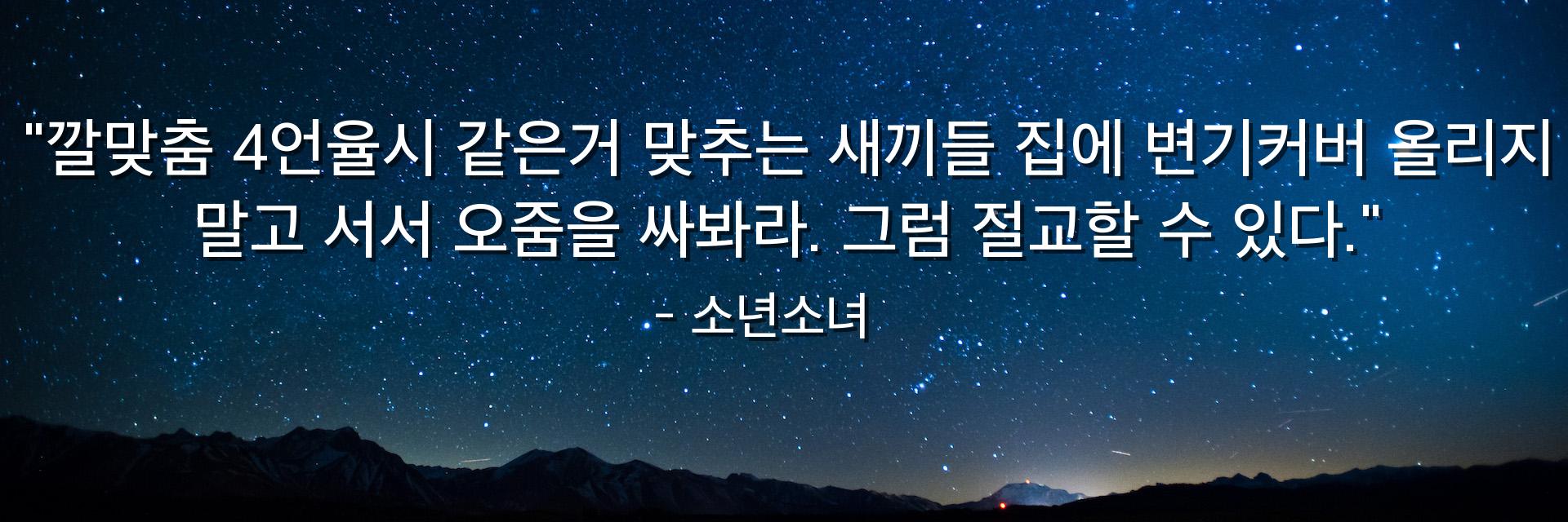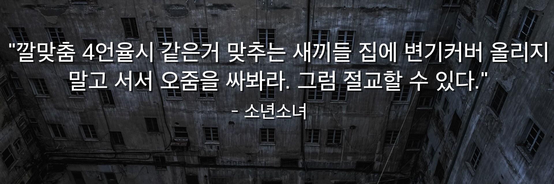 "깔맞춤 4언율시 같은거 맞추는 새끼들 집에 변기커버 올리지 말고 서서 오줌을 싸봐라. 그럼 절교할 수 있다."