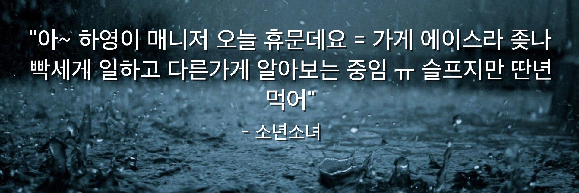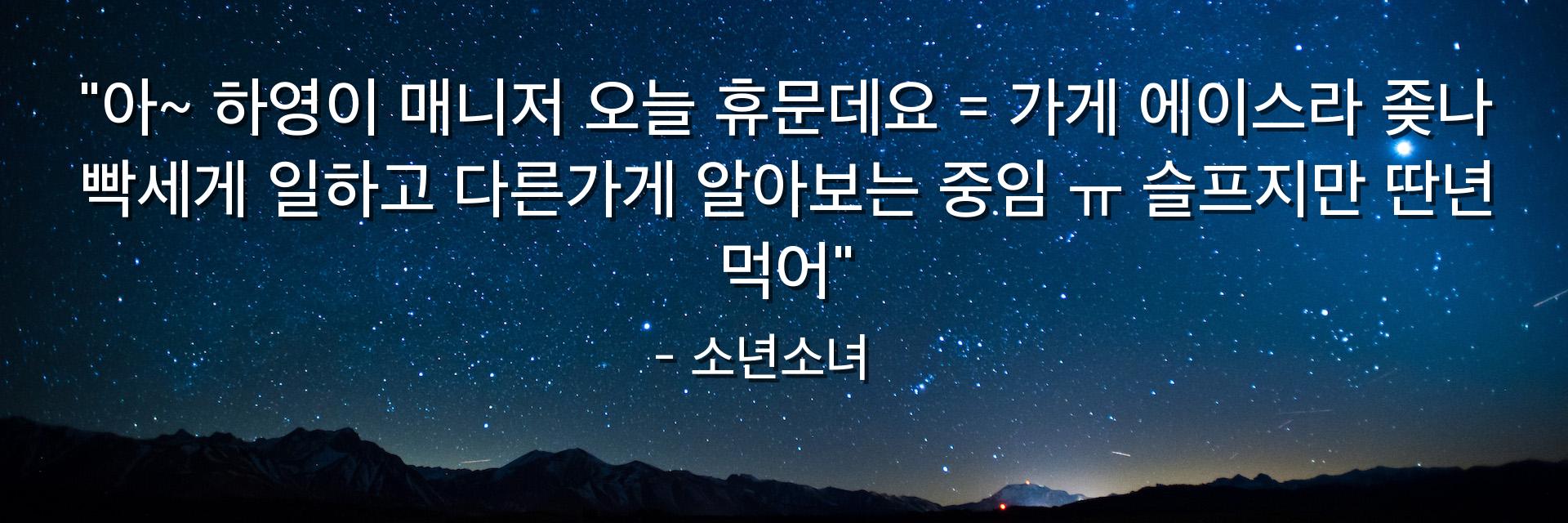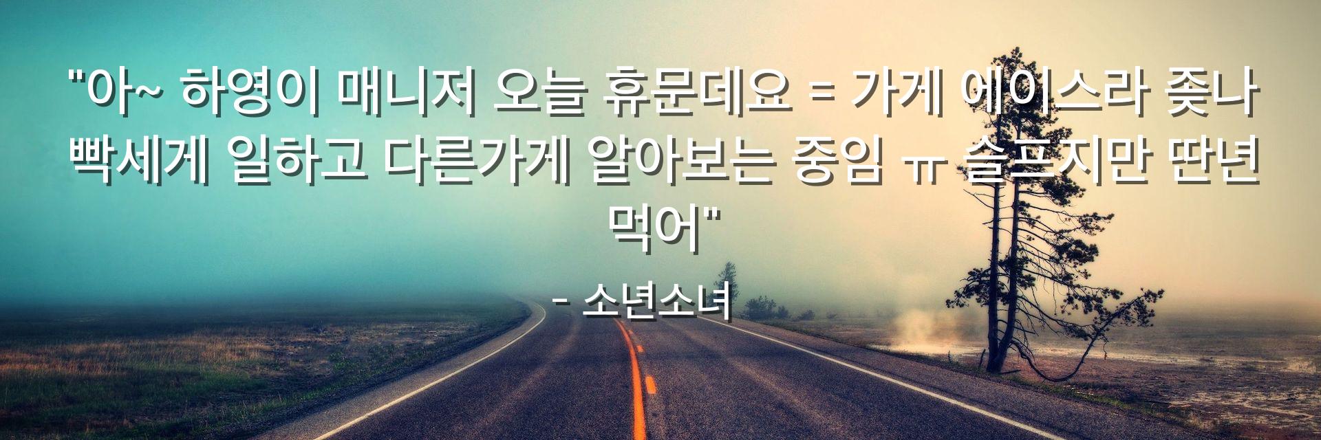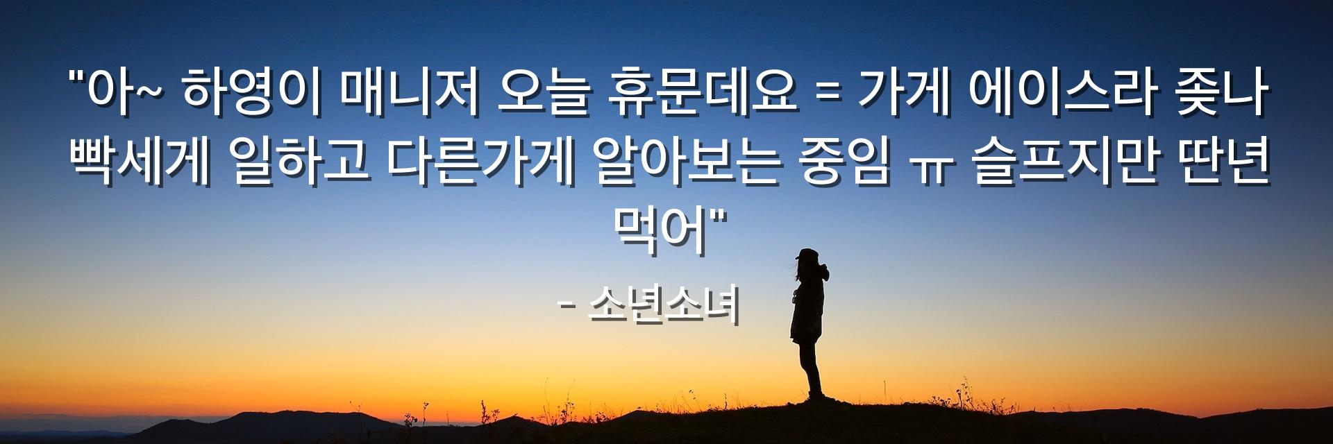 "아~ 하영이 매니저 오늘 휴문데요 = 가게 에이스라 좆나 빡세게 일하고 다른가게 알아보는 중임 ㅠ 슬프지만 딴년 먹어"