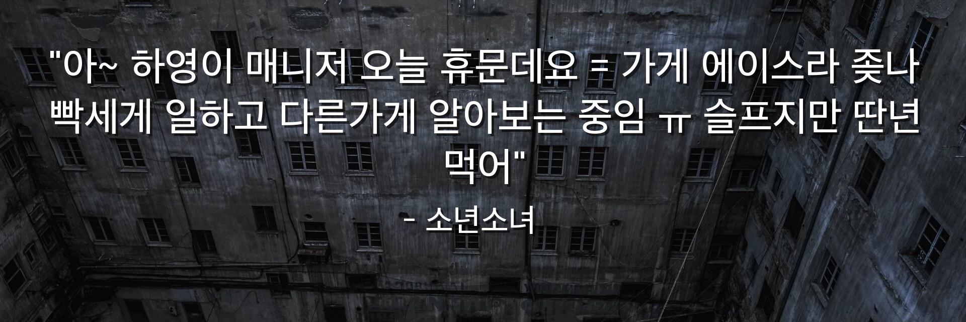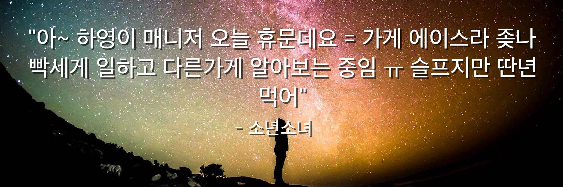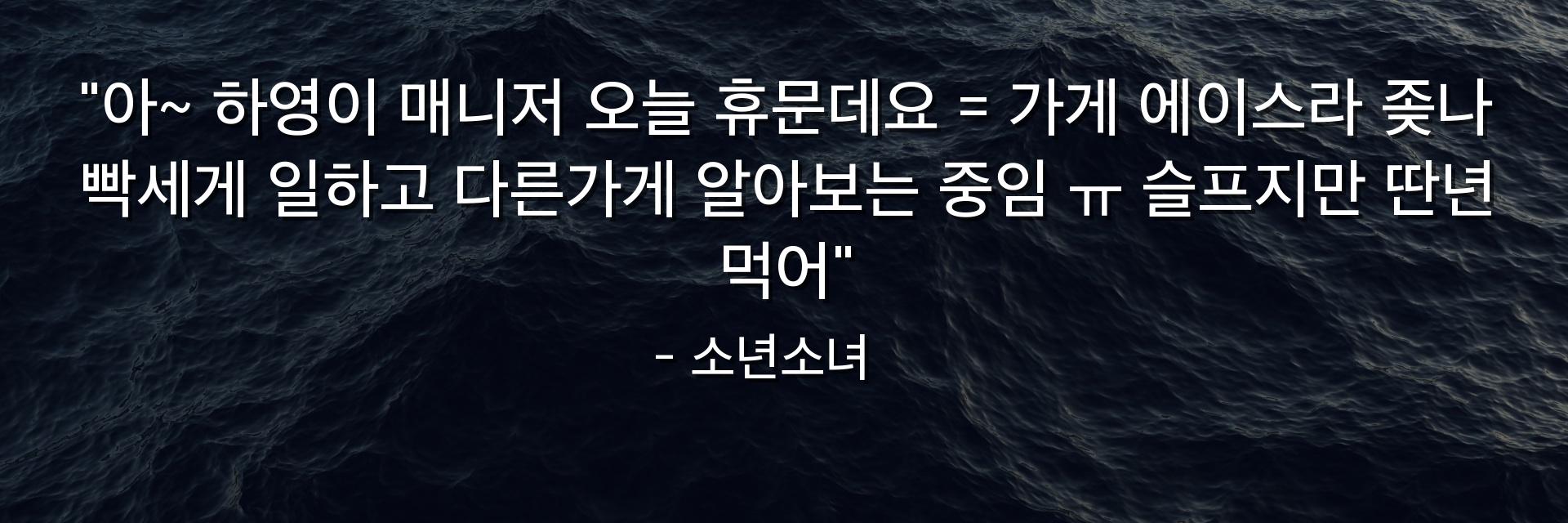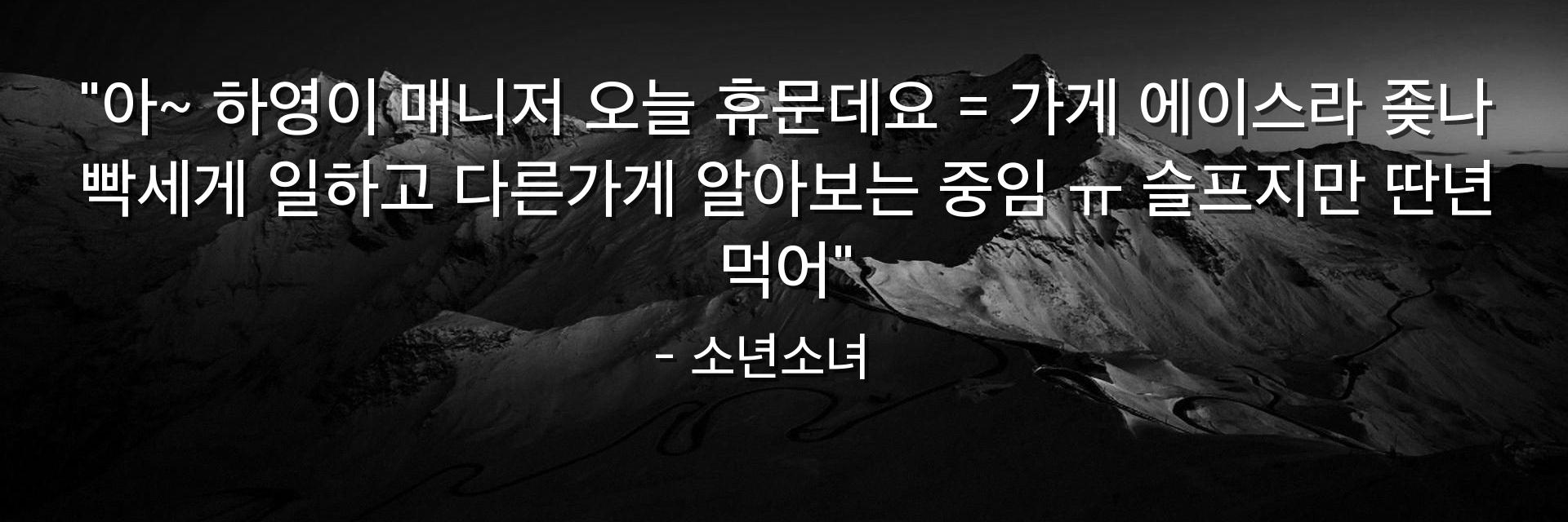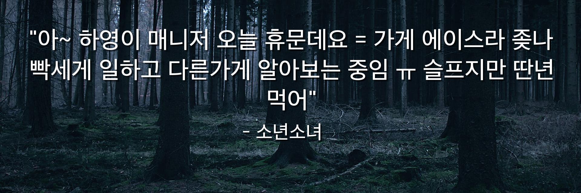 "아~ 하영이 매니저 오늘 휴문데요 = 가게 에이스라 좆나 빡세게 일하고 다른가게 알아보는 중임 ㅠ 슬프지만 딴년 먹어"