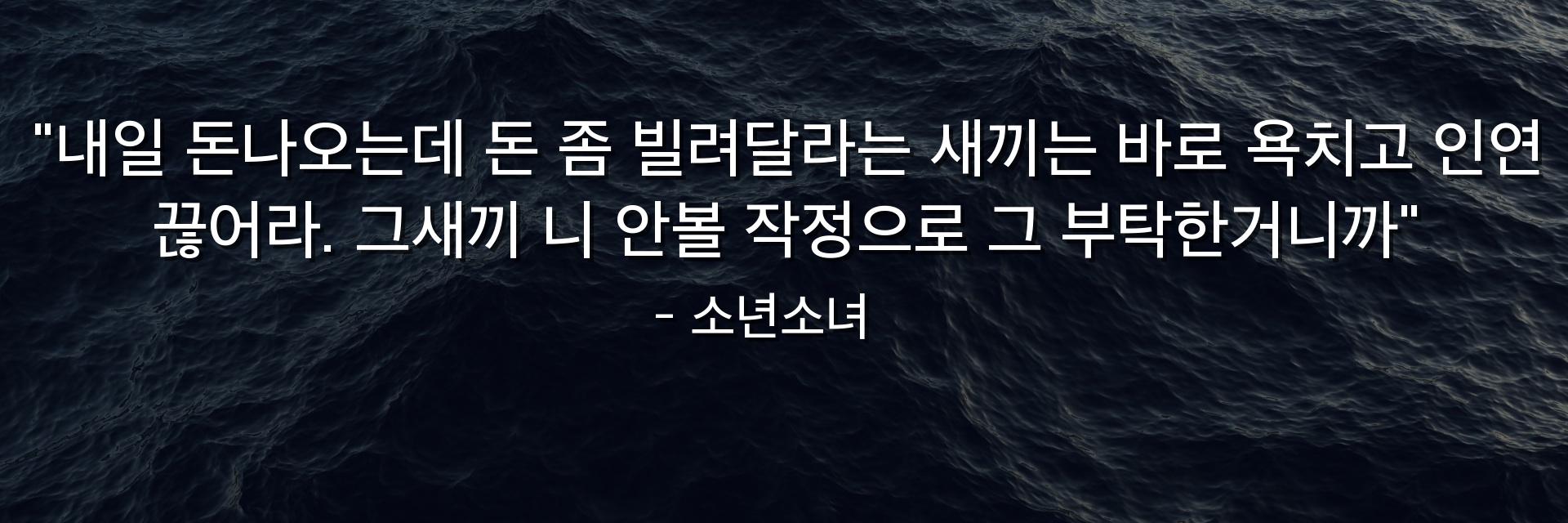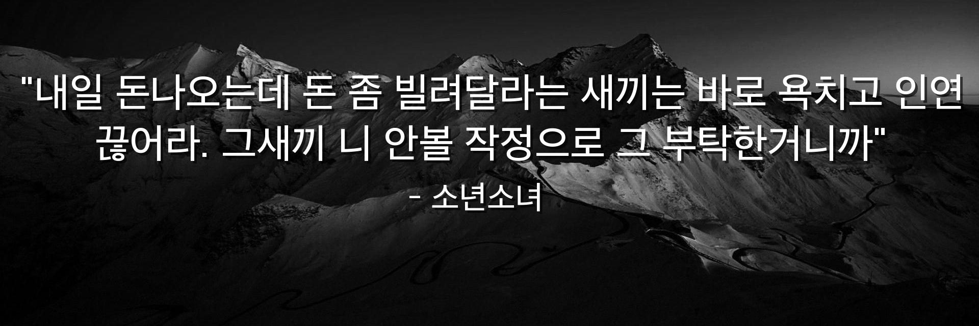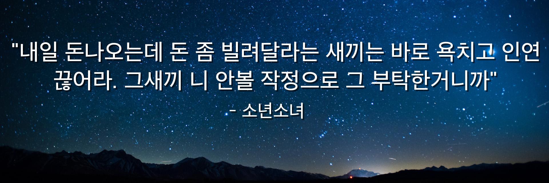 "내일 돈나오는데 돈 좀 빌려달라는 새끼는 바로 욕치고 인연 끊어라. 그새끼 니 안볼 작정으로 그 부탁한거니까"