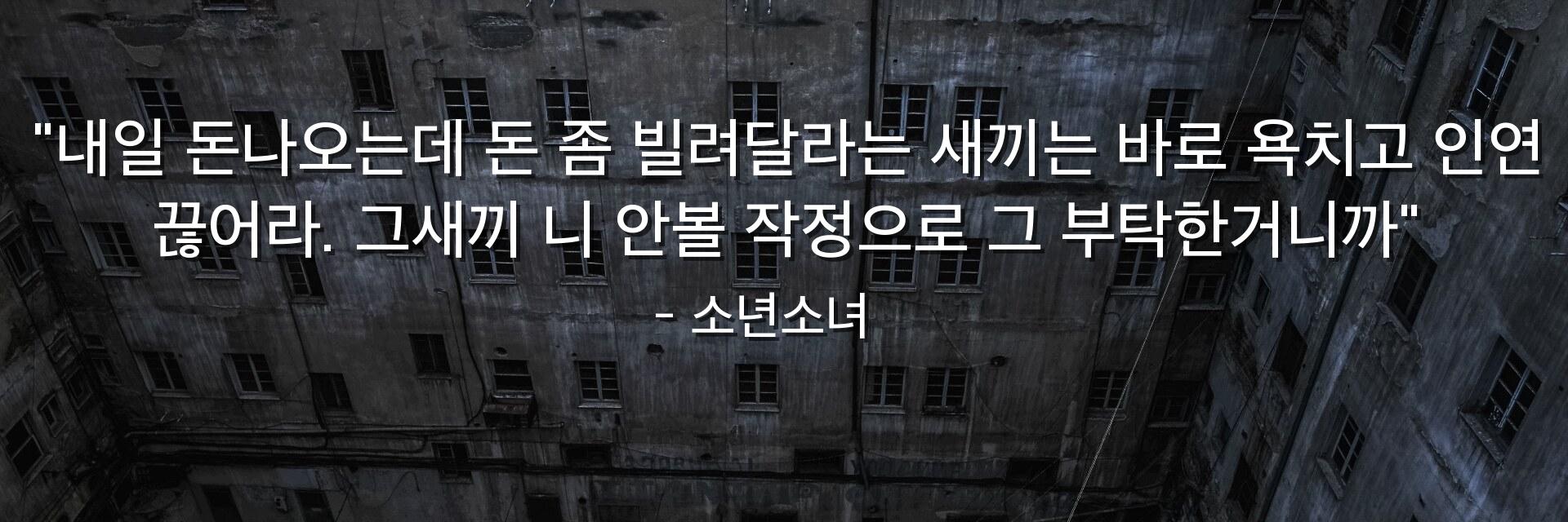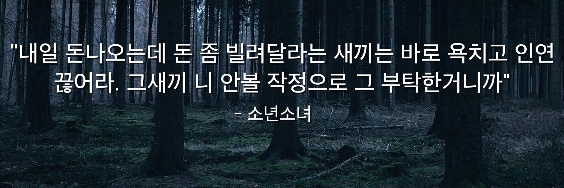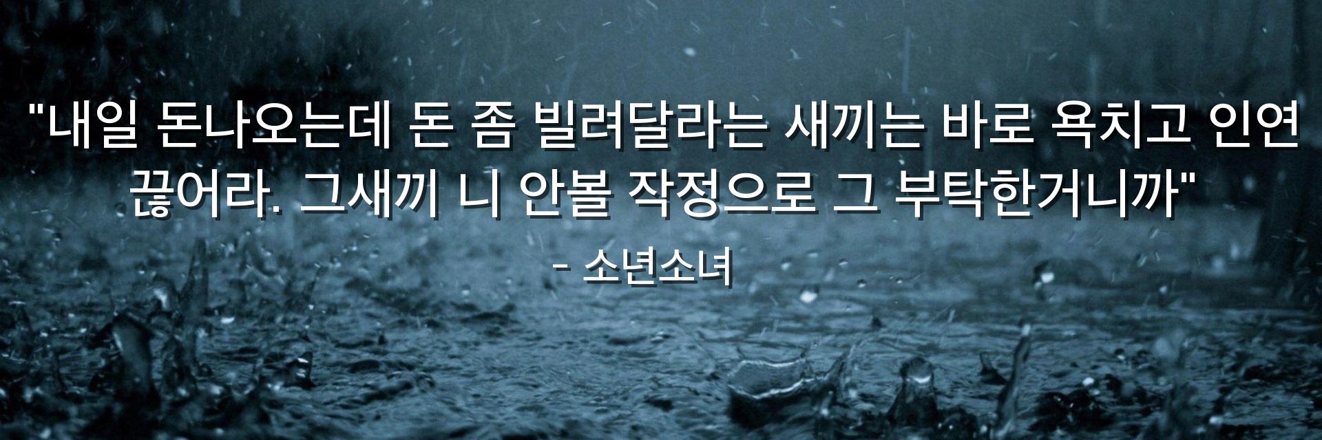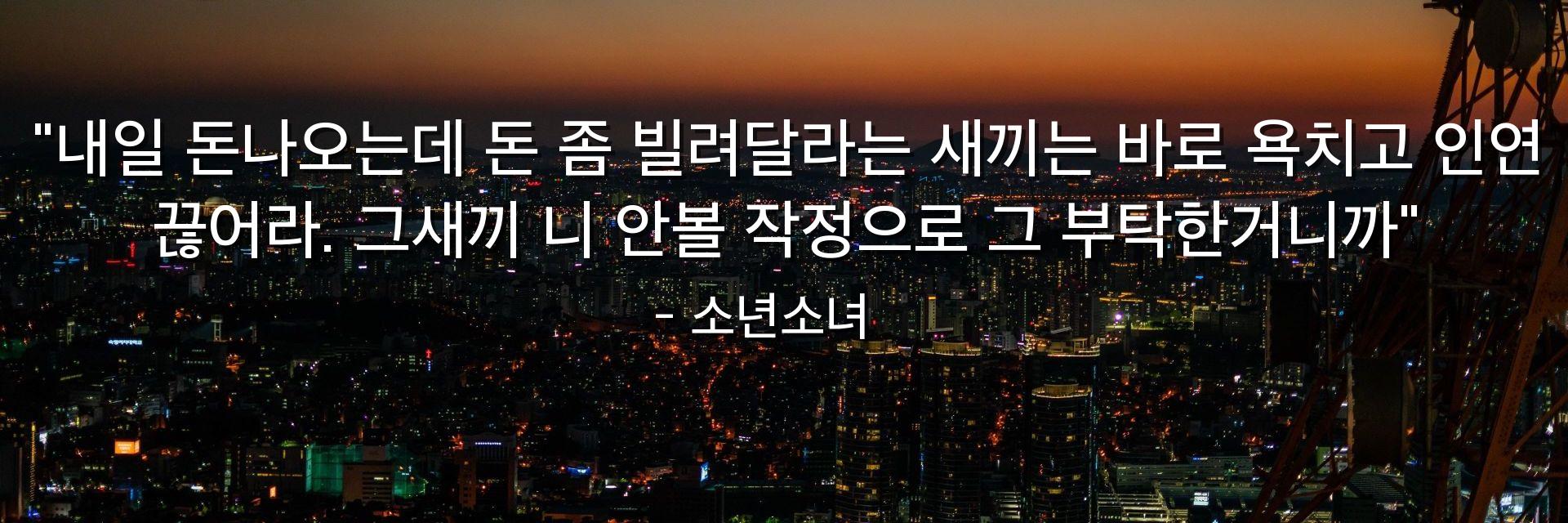 "내일 돈나오는데 돈 좀 빌려달라는 새끼는 바로 욕치고 인연 끊어라. 그새끼 니 안볼 작정으로 그 부탁한거니까"