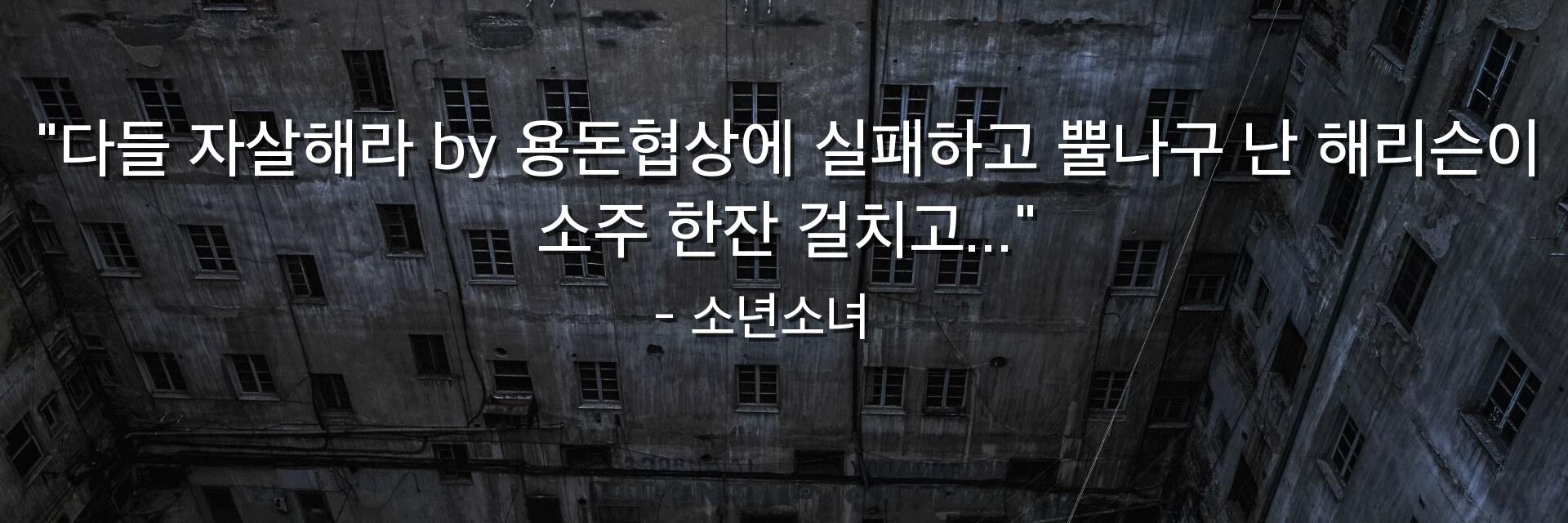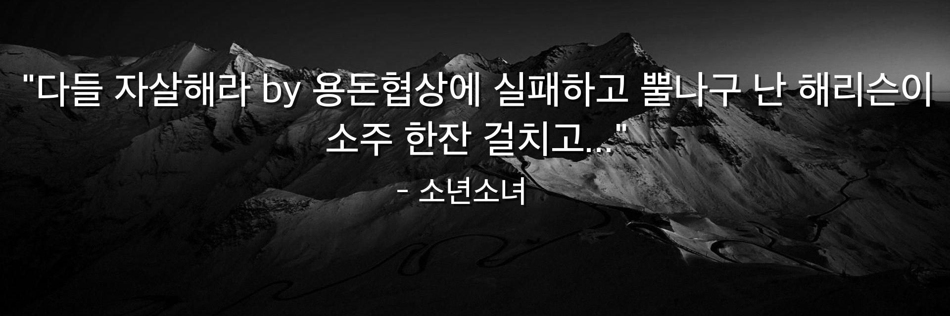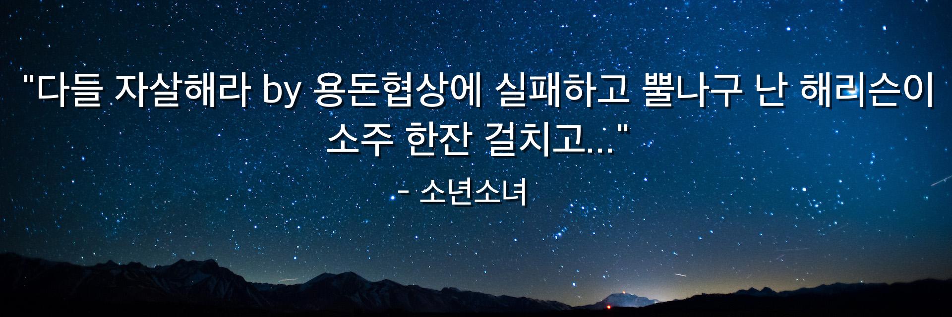 "다들 자살해라 by 용돈협상에 실패하고 뿔나구 난 해리슨이 소주 한잔 걸치고..."