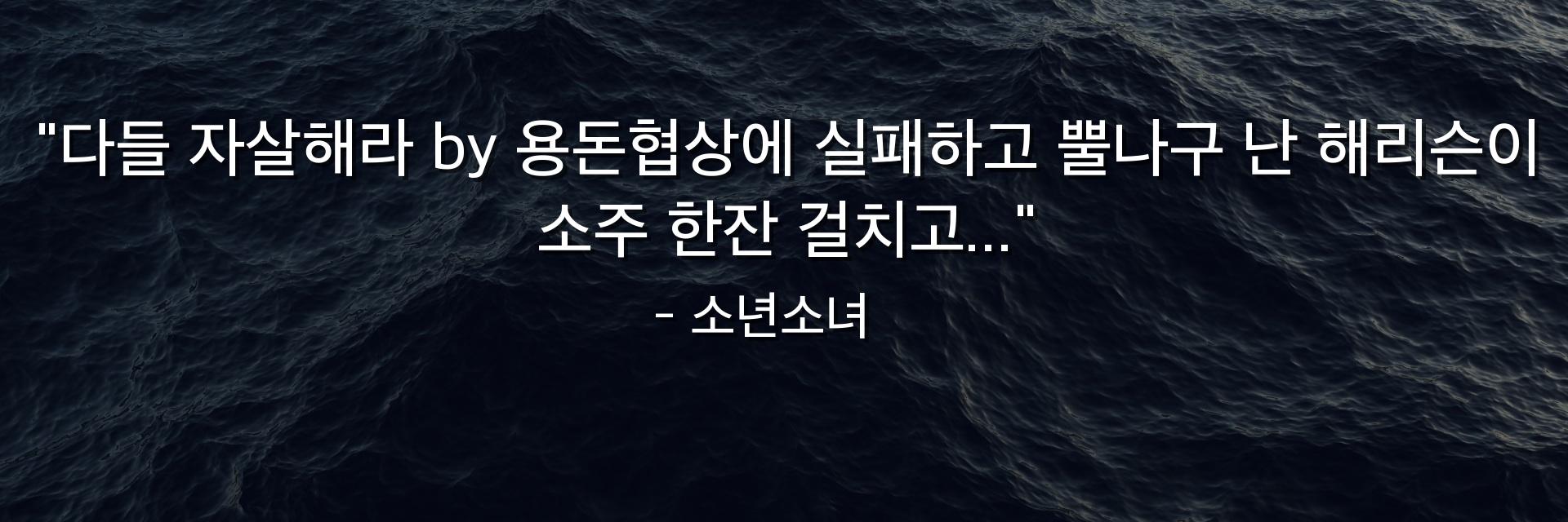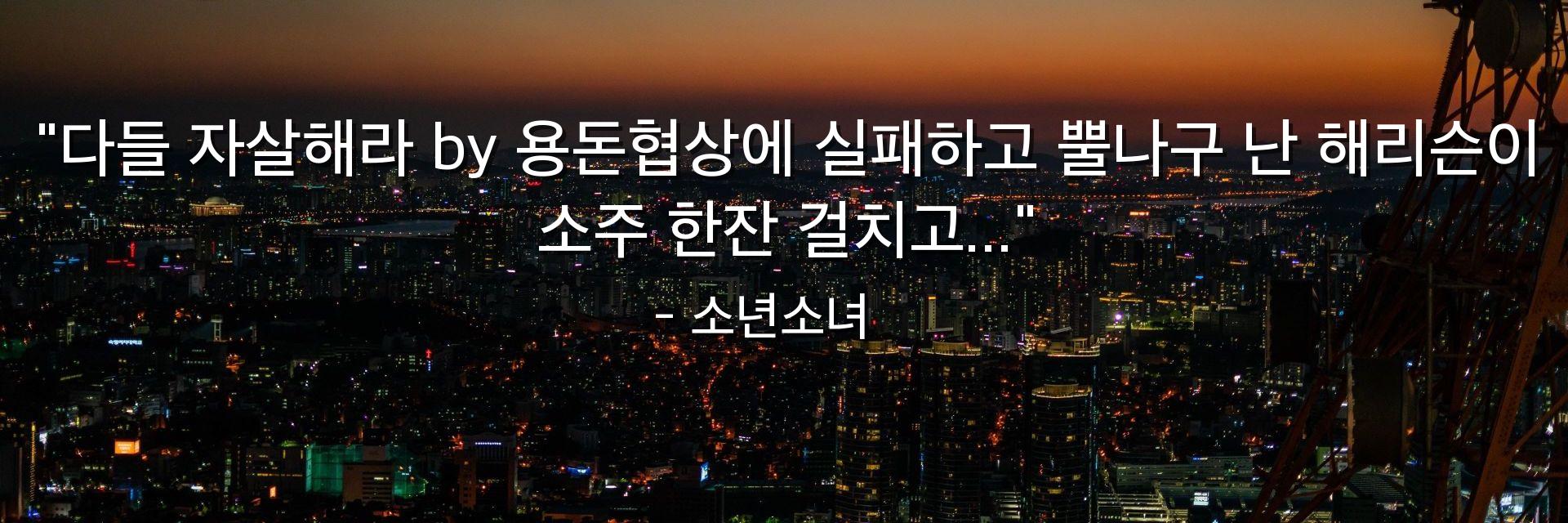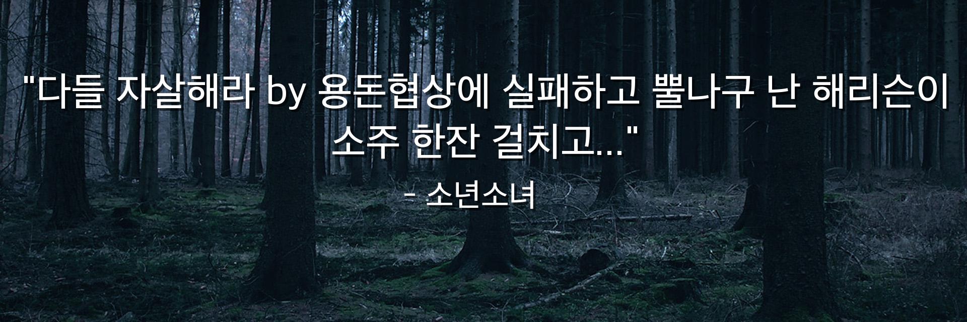 "다들 자살해라 by 용돈협상에 실패하고 뿔나구 난 해리슨이 소주 한잔 걸치고..."