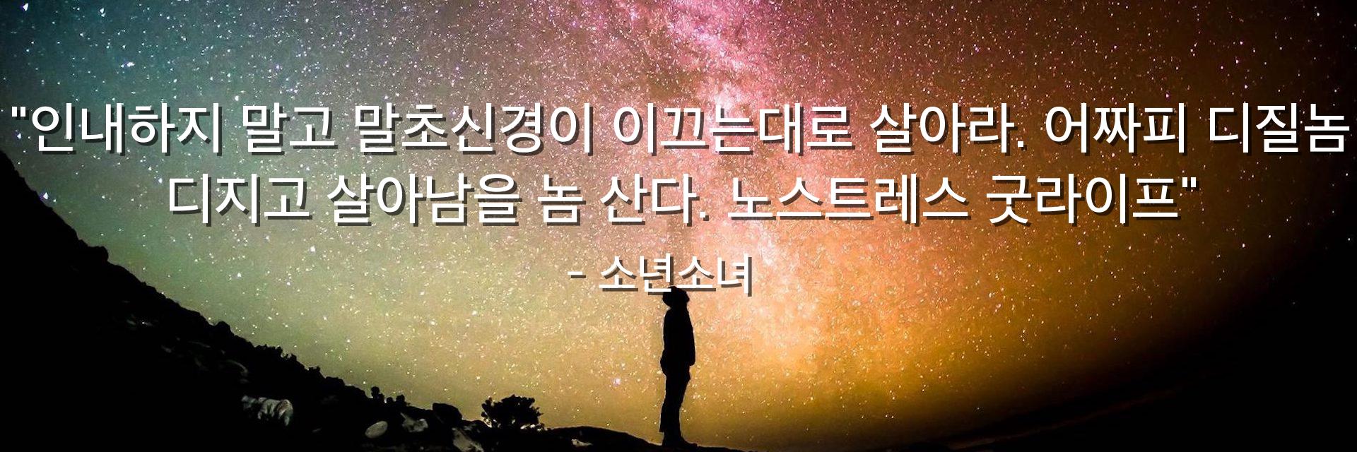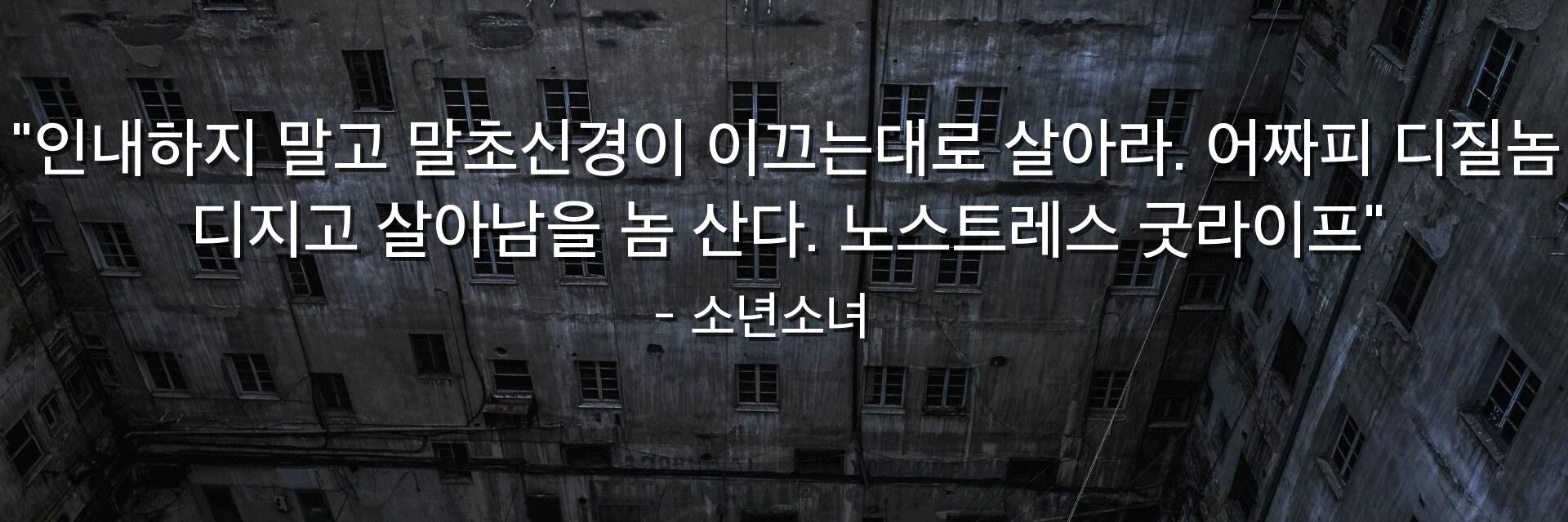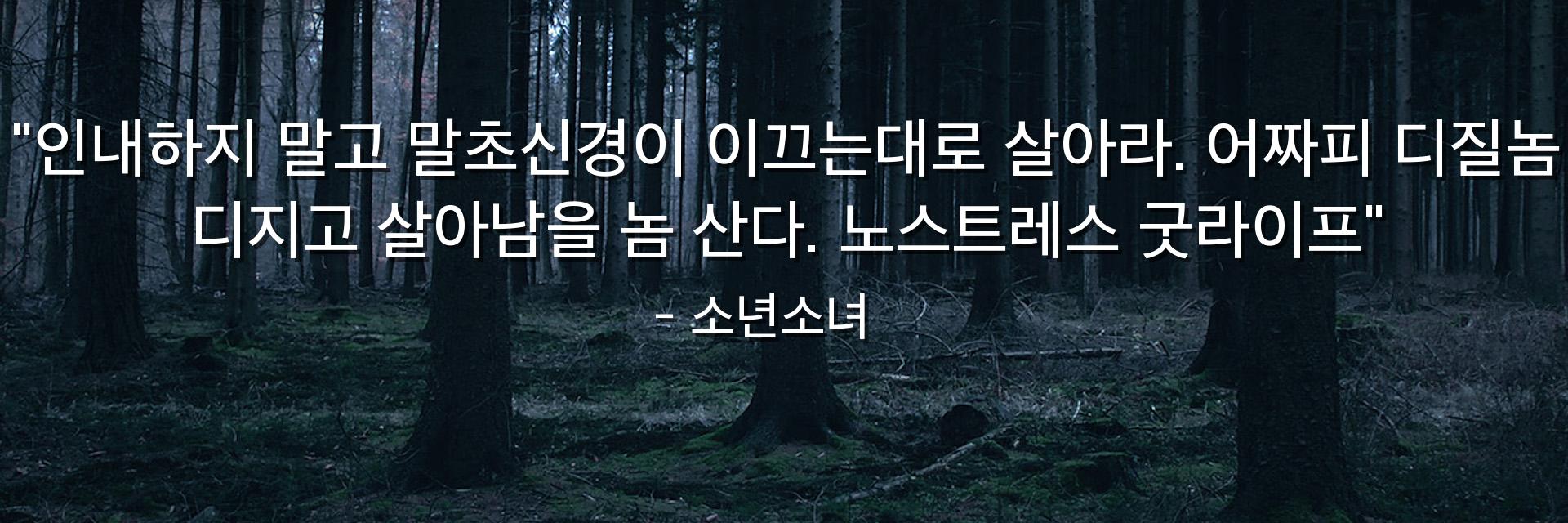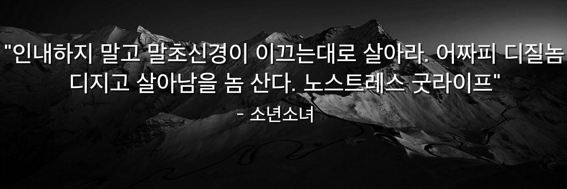 "인내하지 말고 말초신경이 이끄는대로 살아라. 어짜피 디질놈 디지고 살아남을 놈 산다. 노스트레스 굿라이프"