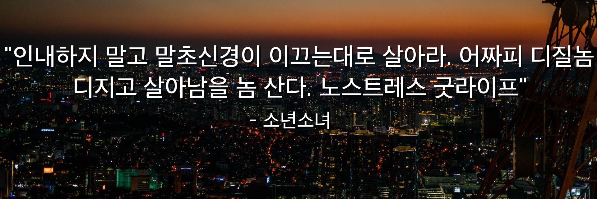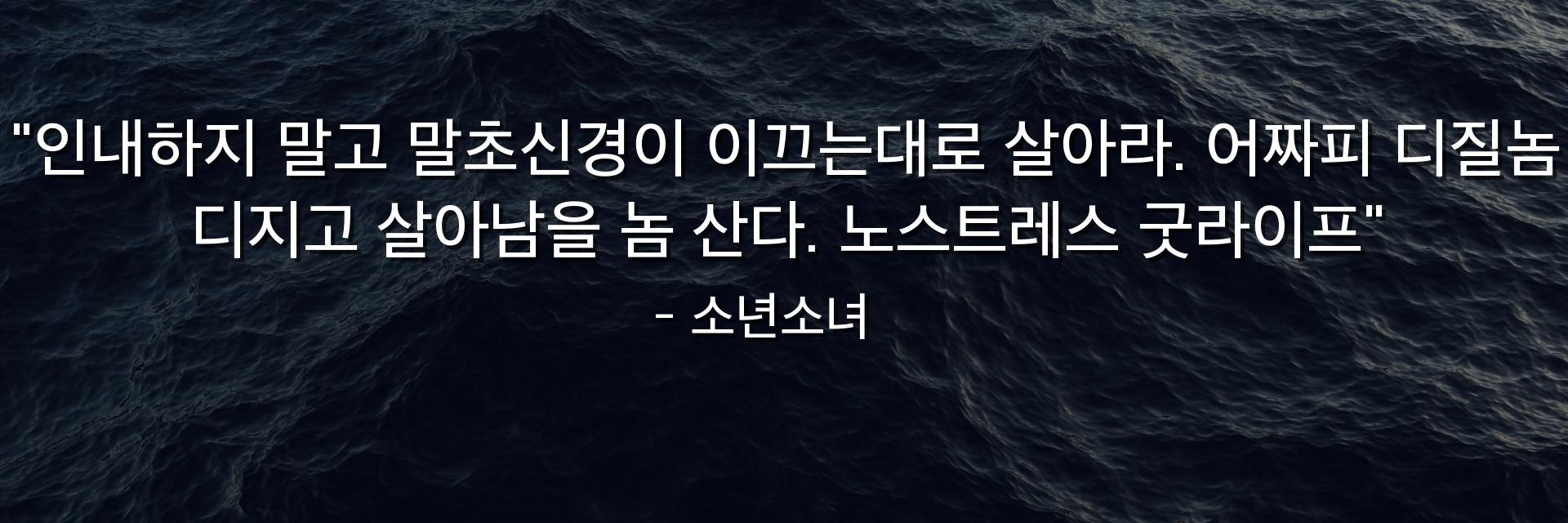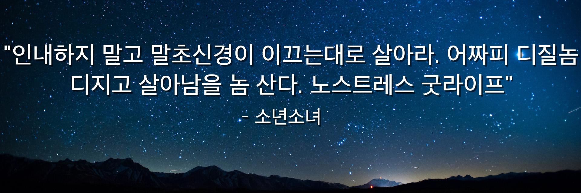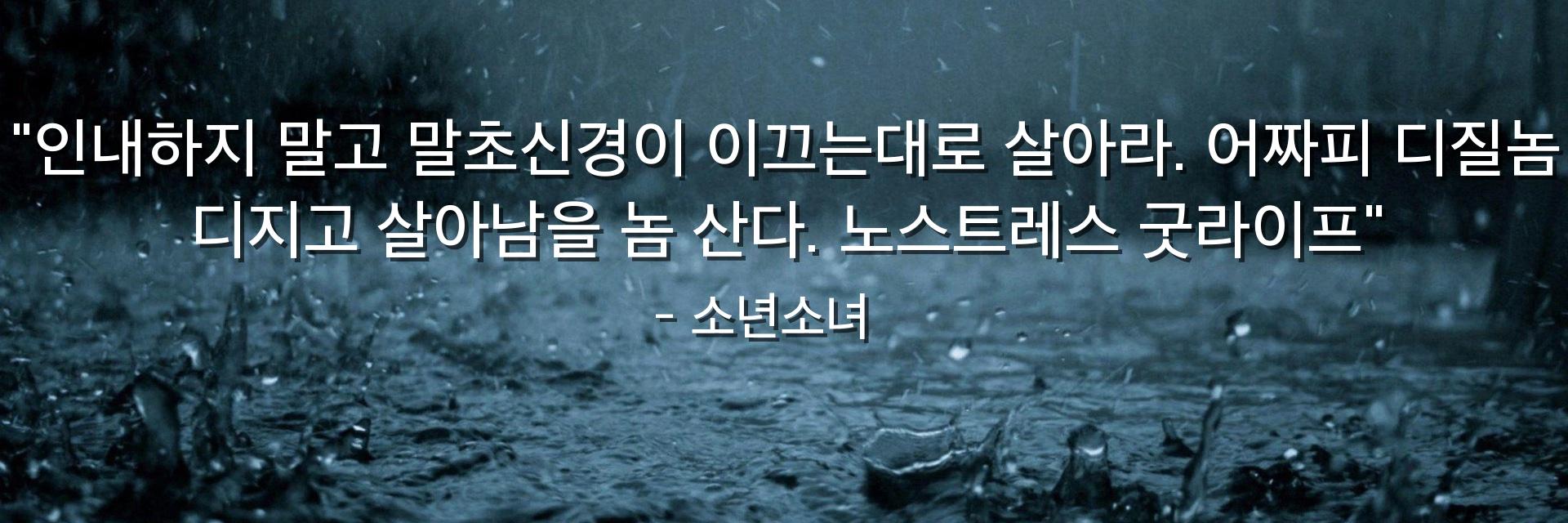 "인내하지 말고 말초신경이 이끄는대로 살아라. 어짜피 디질놈 디지고 살아남을 놈 산다. 노스트레스 굿라이프"