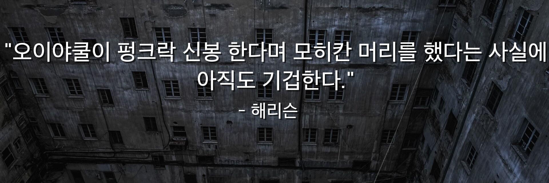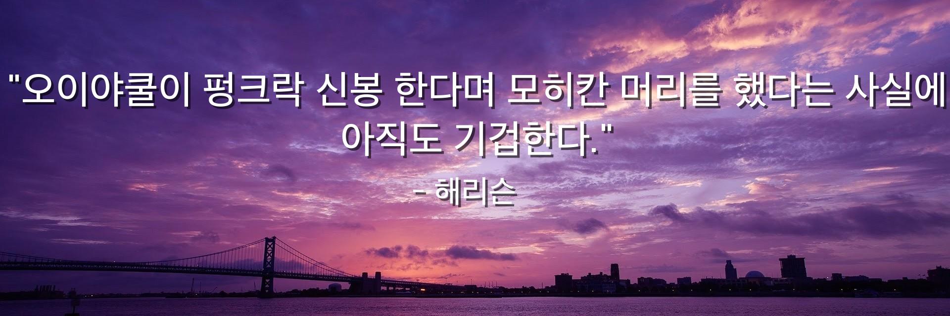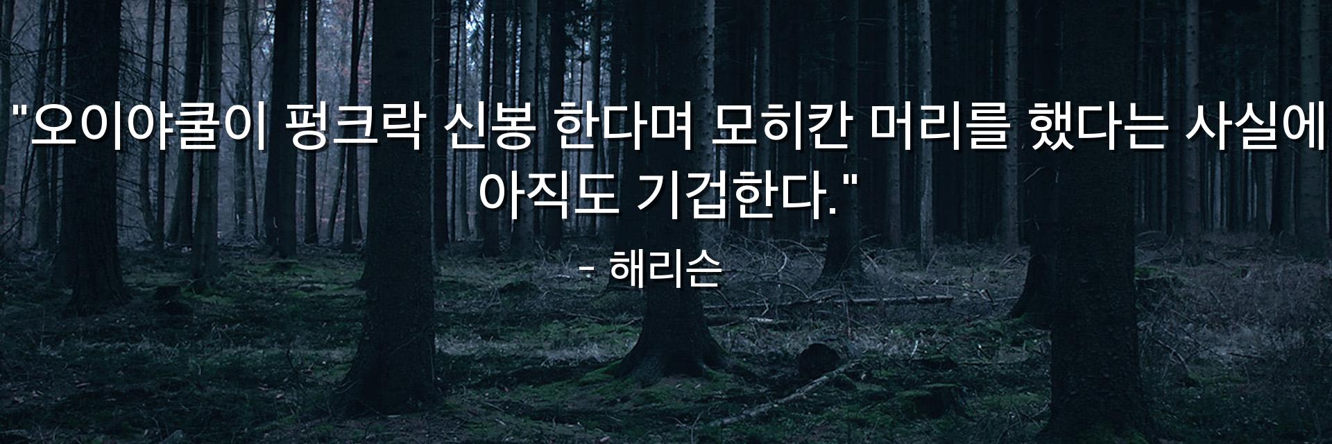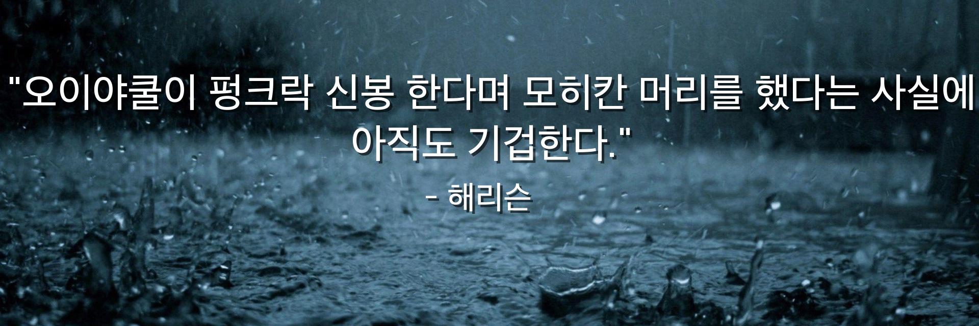 "오이야쿨이 펑크락 신봉 한다며 모히칸 머리를 했다는 사실에 아직도 기겁한다."