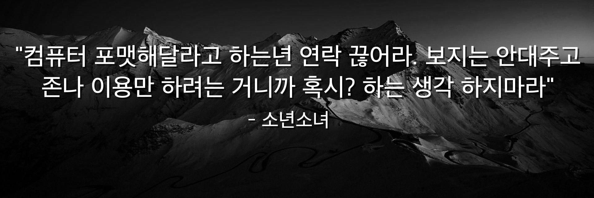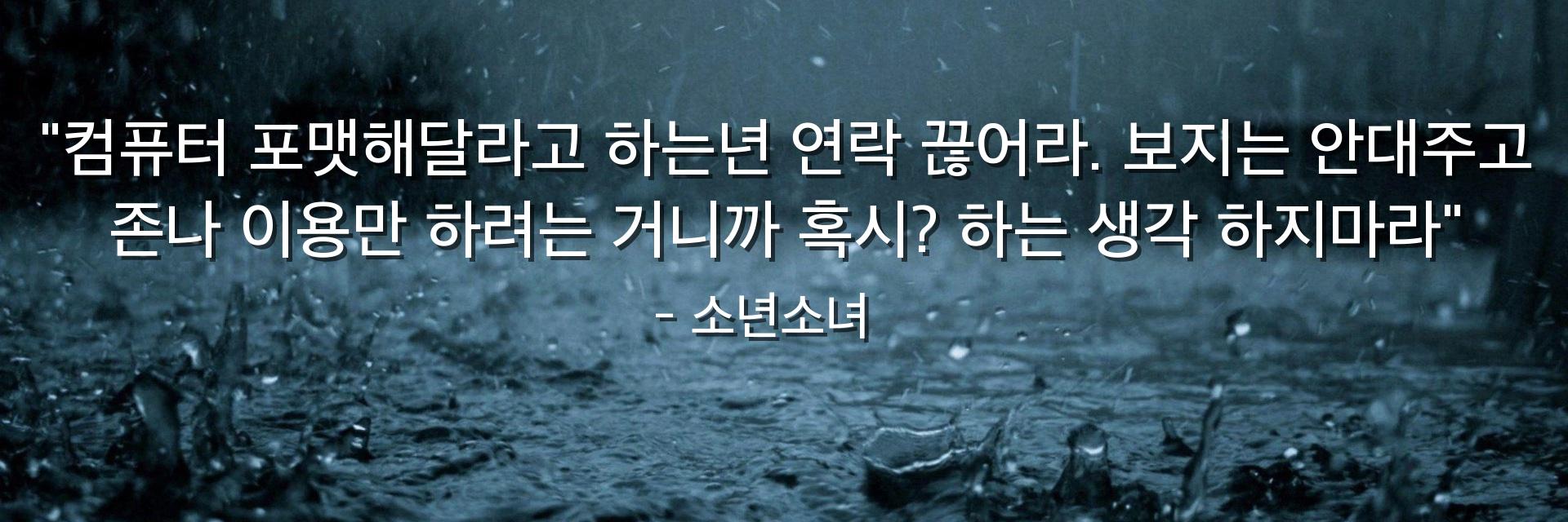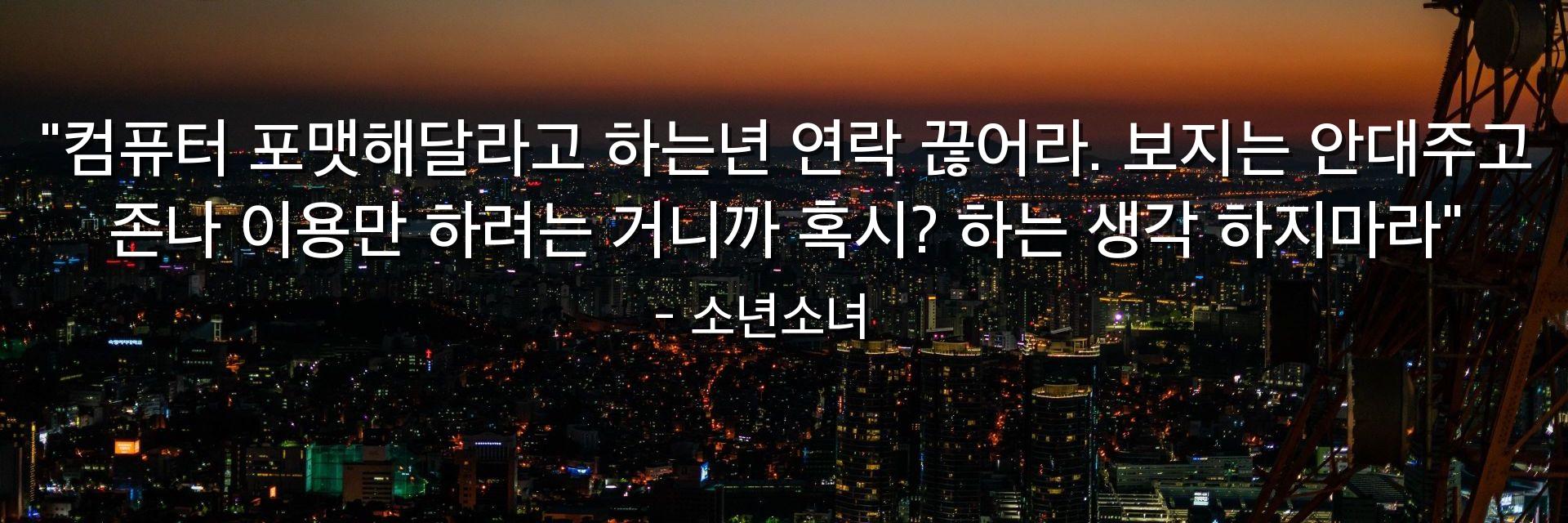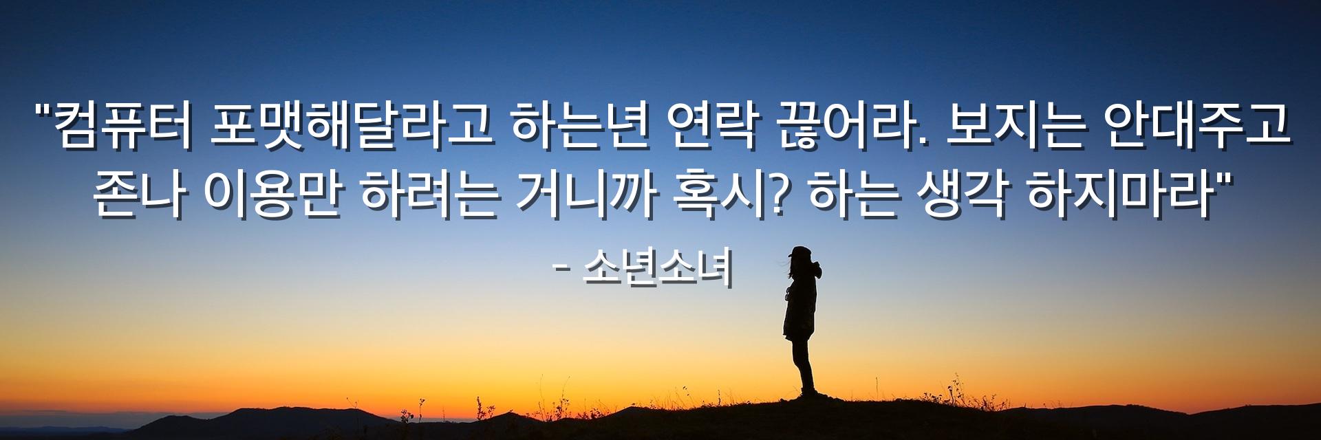 "컴퓨터 포맷해달라고 하는년 연락 끊어라. 보지는 안대주고 존나 이용만 하려는 거니까 혹시? 하는 생각 하지마라"