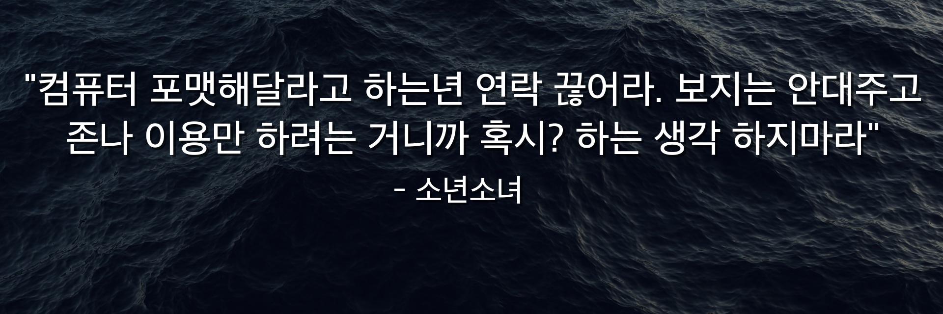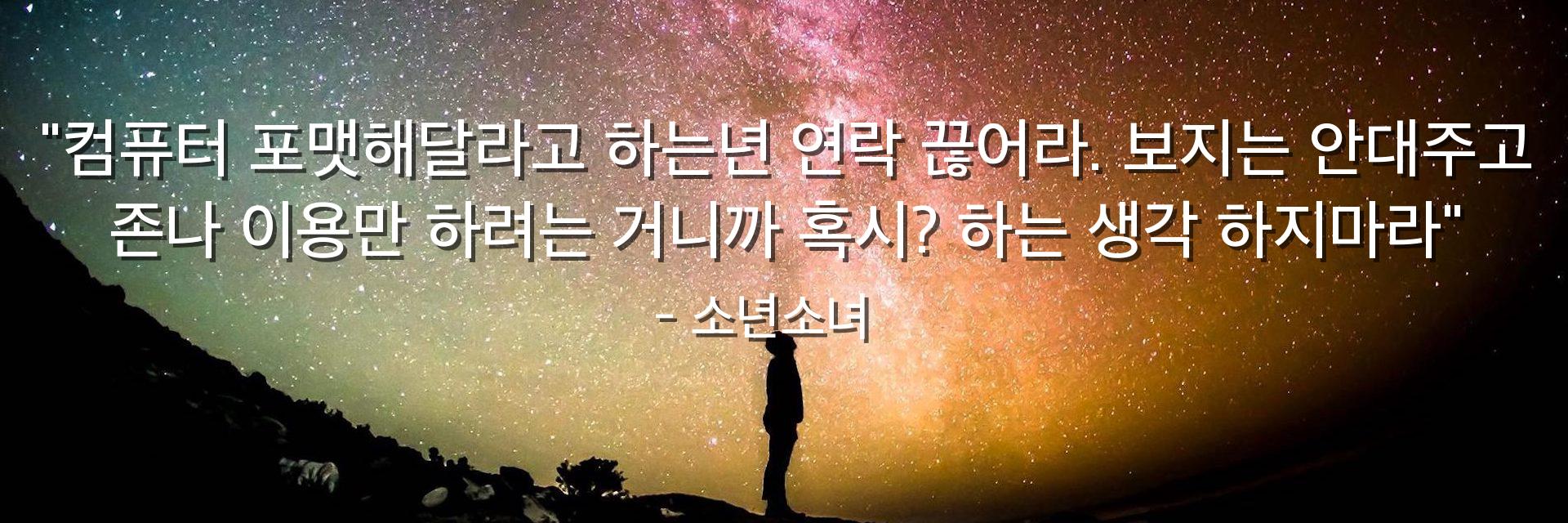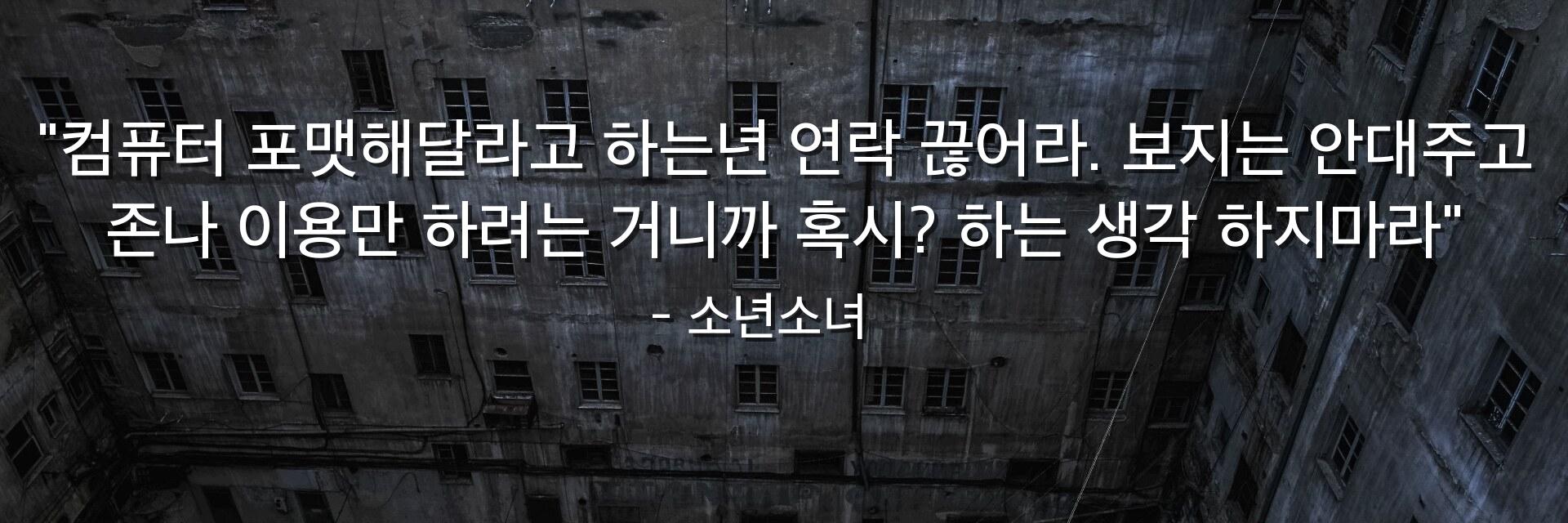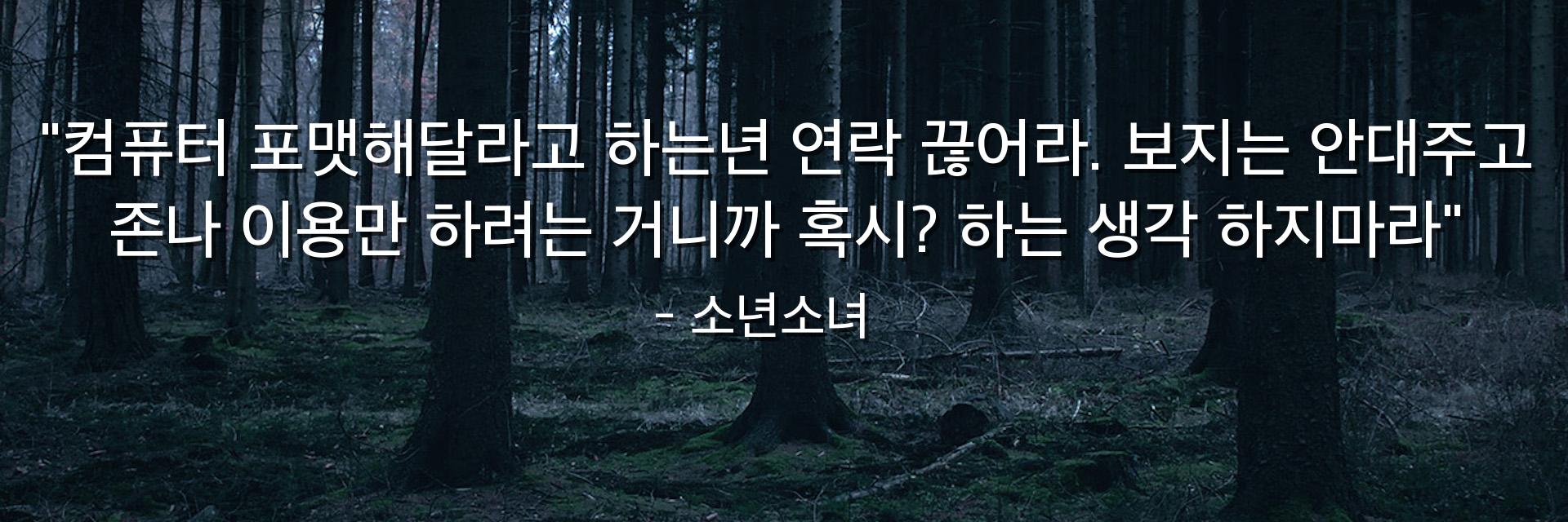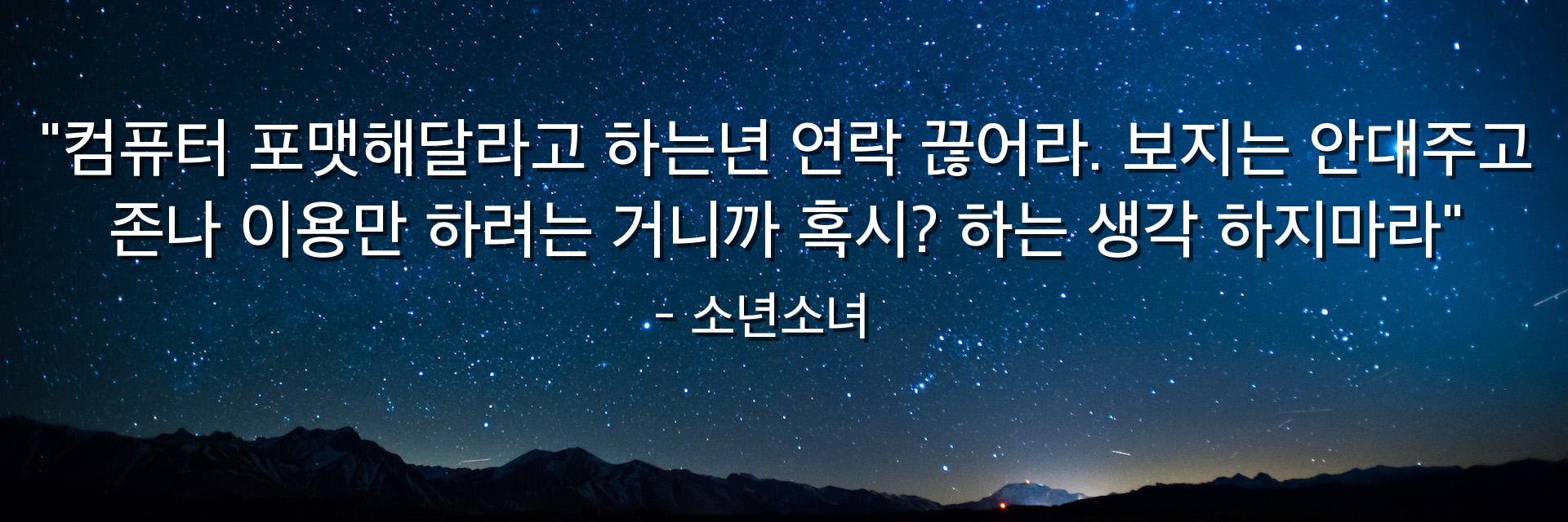 "컴퓨터 포맷해달라고 하는년 연락 끊어라. 보지는 안대주고 존나 이용만 하려는 거니까 혹시? 하는 생각 하지마라"