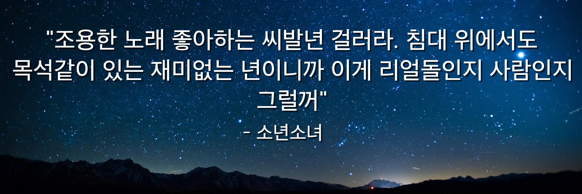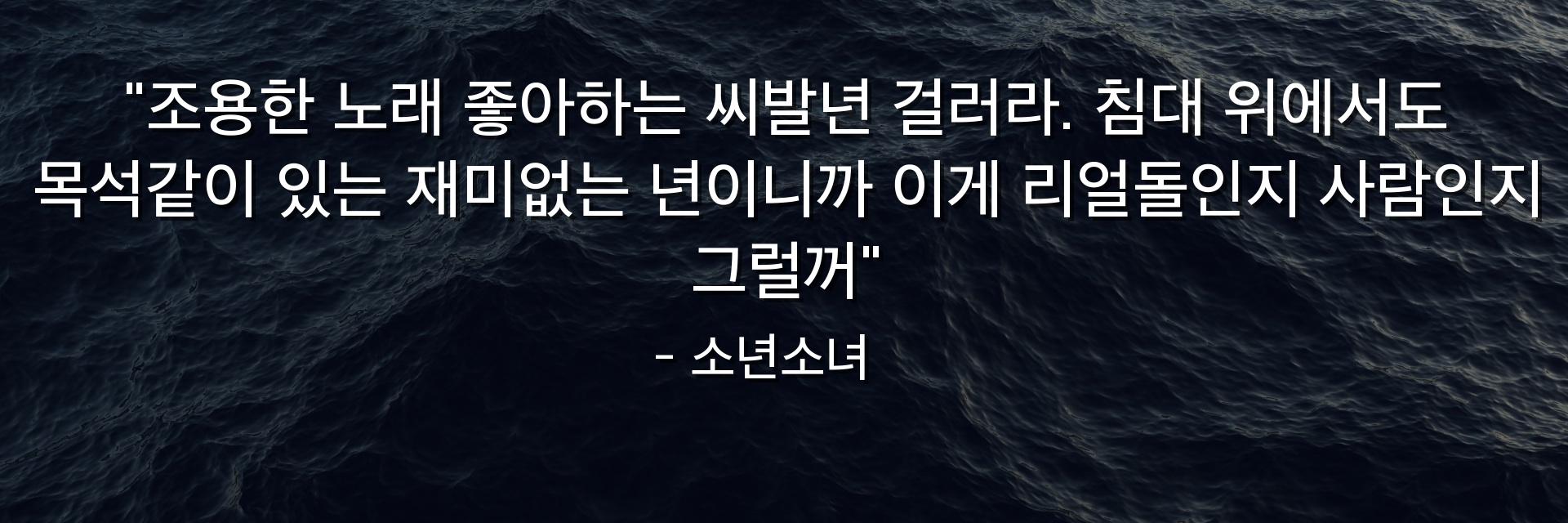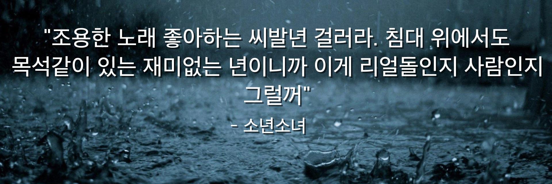 "조용한 노래 좋아하는 씨발년 걸러라. 침대 위에서도 목석같이 있는 재미없는 년이니까 이게 리얼돌인지 사람인지 그럴꺼"