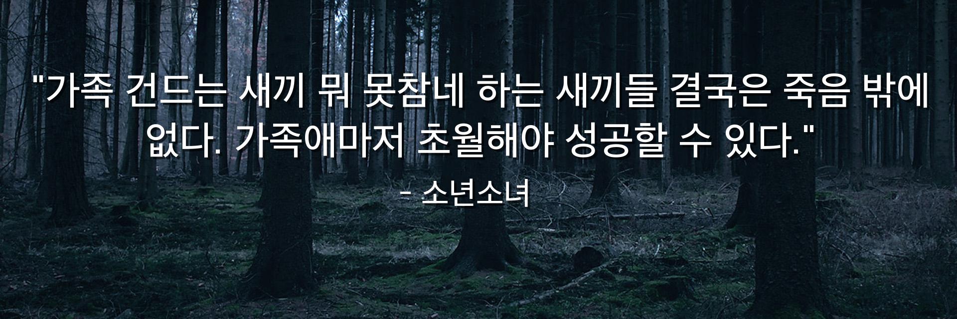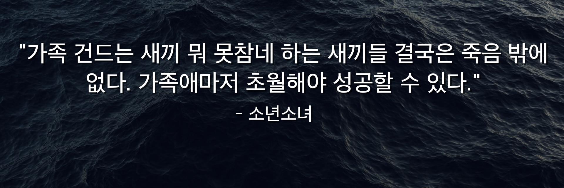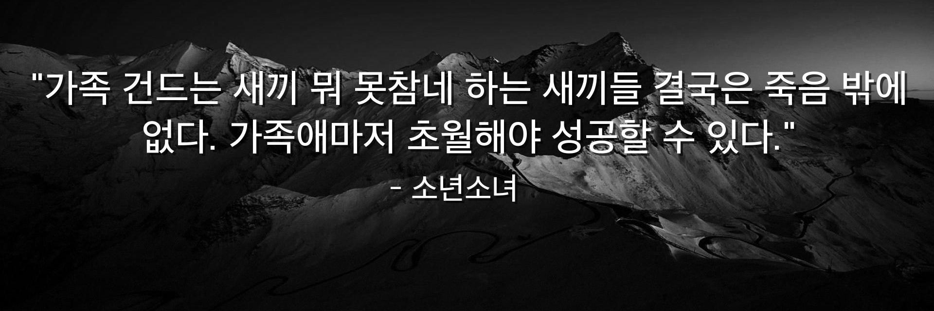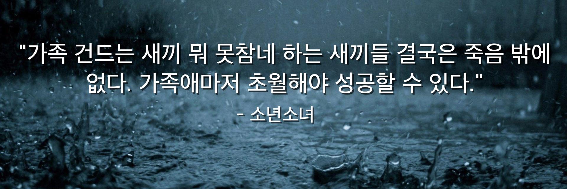 "가족 건드는 새끼 뭐 못참네 하는 새끼들 결국은 죽음 밖에 없다. 가족애마저 초월해야 성공할 수 있다."