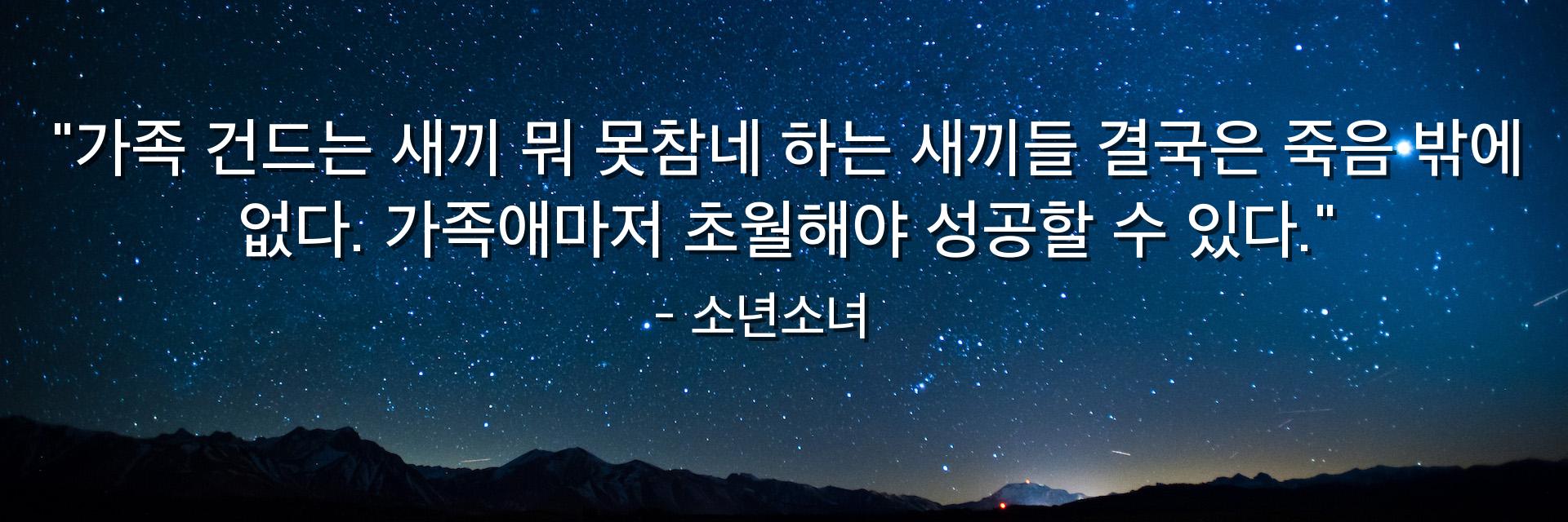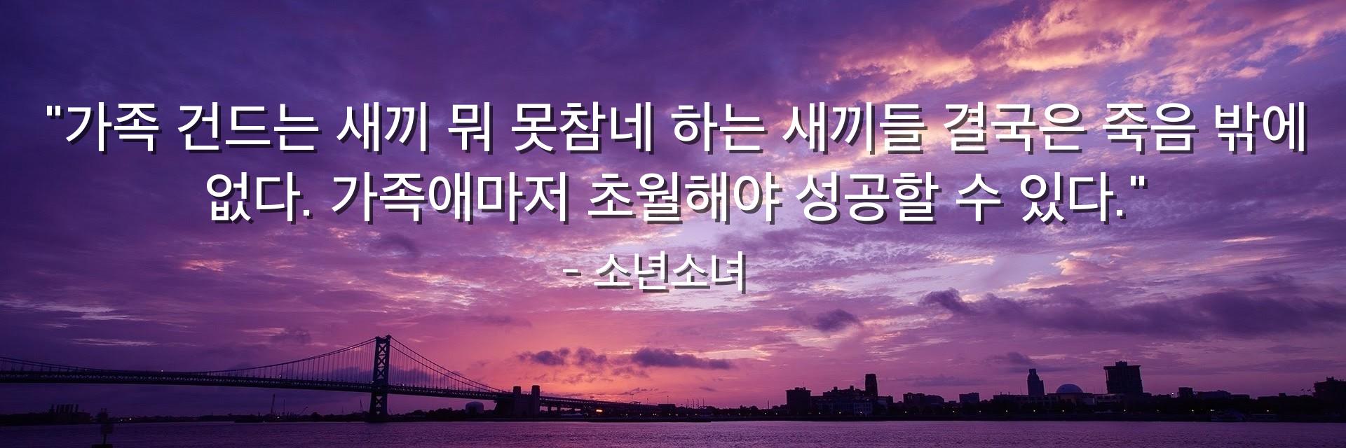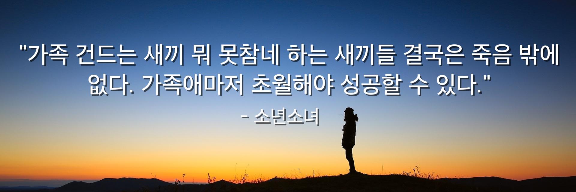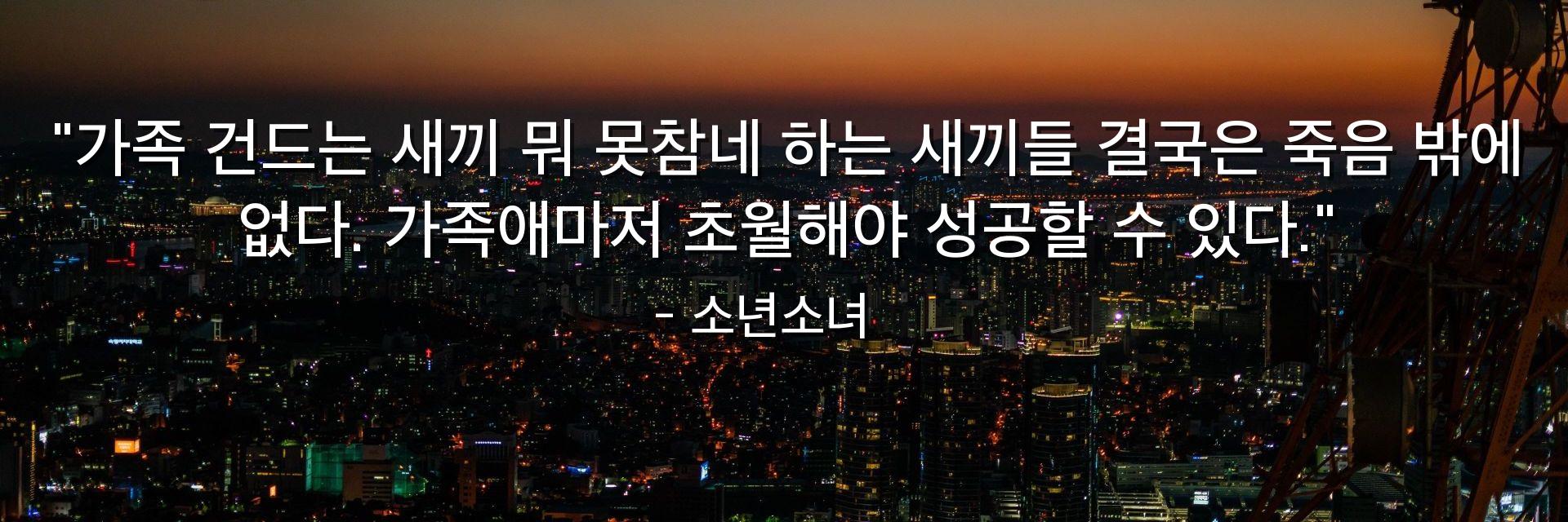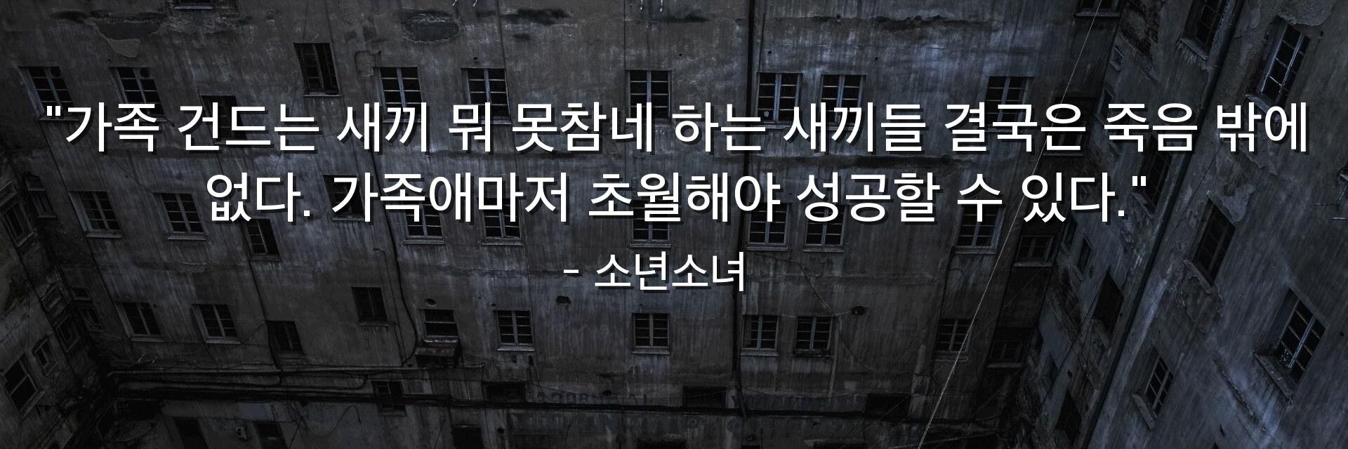 "가족 건드는 새끼 뭐 못참네 하는 새끼들 결국은 죽음 밖에 없다. 가족애마저 초월해야 성공할 수 있다."