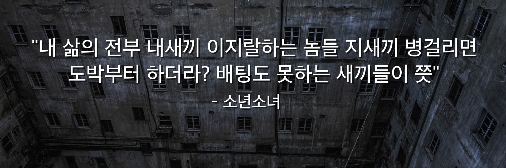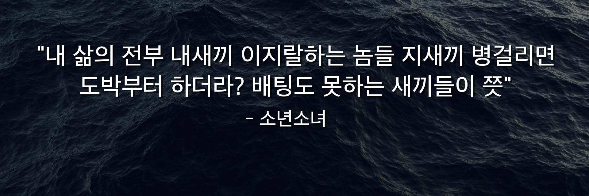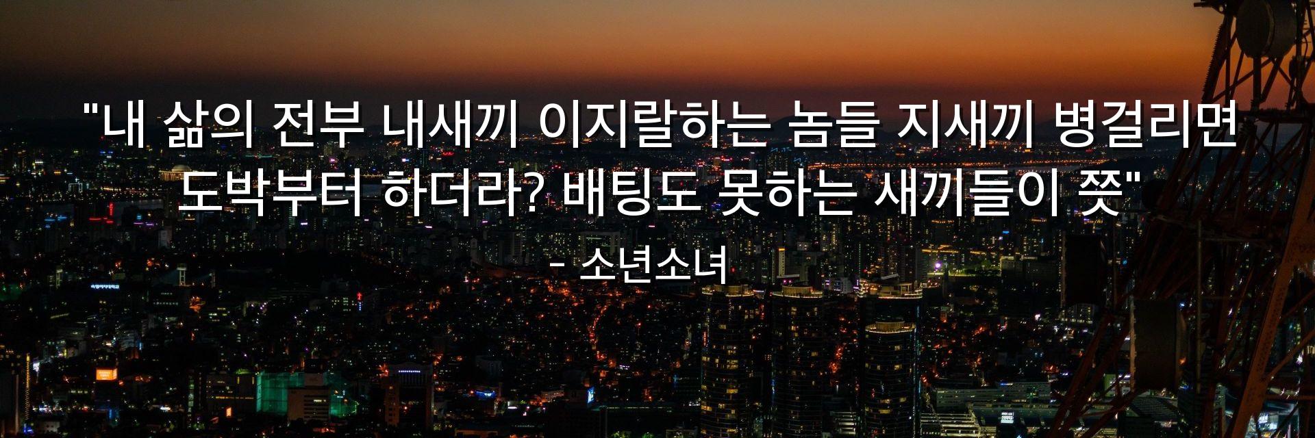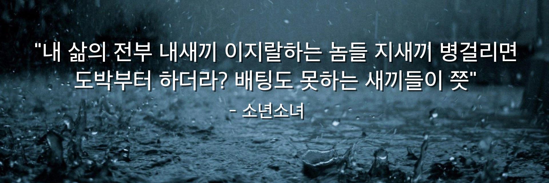 "내 삶의 전부 내새끼 이지랄하는 놈들 지새끼 병걸리면 도박부터 하더라? 배팅도 못하는 새끼들이 쯧"
