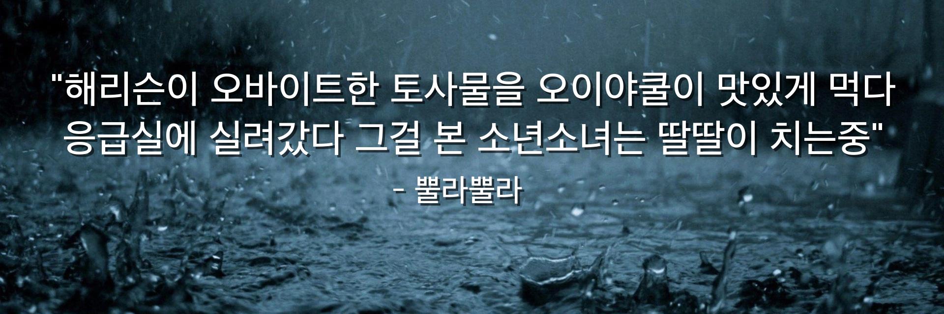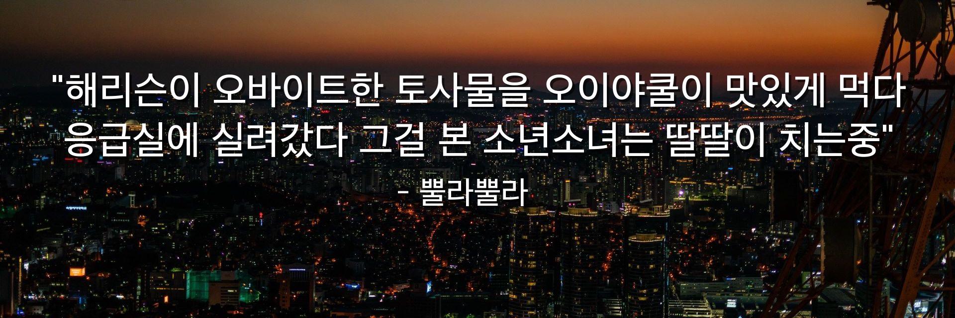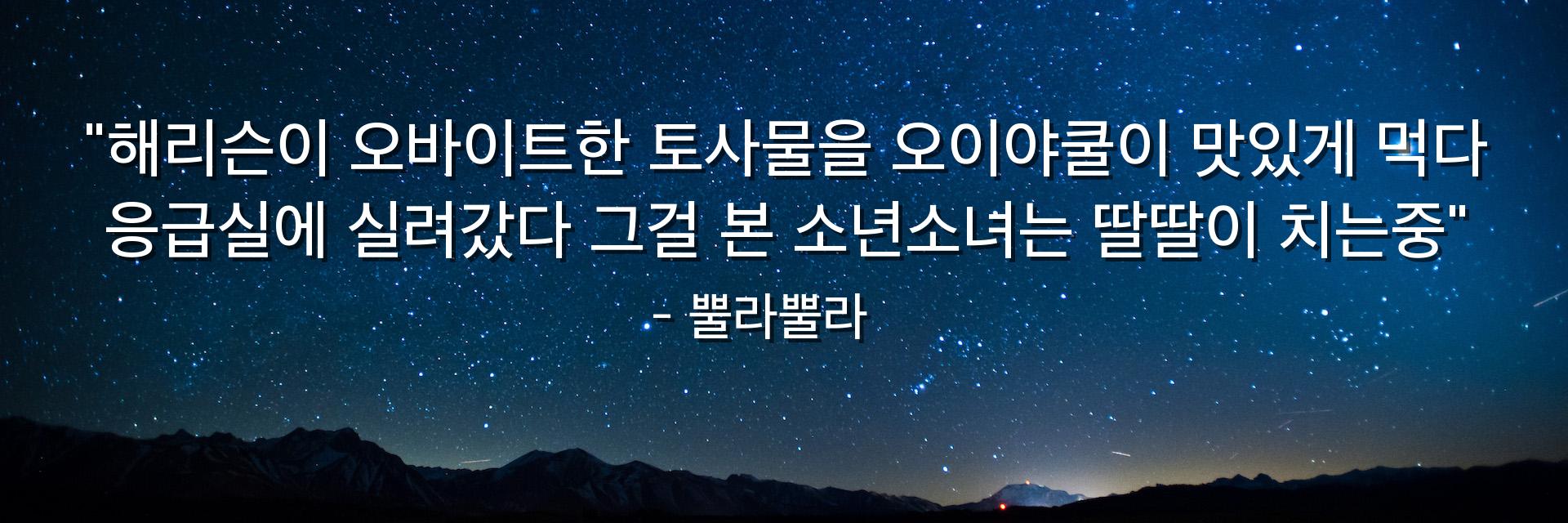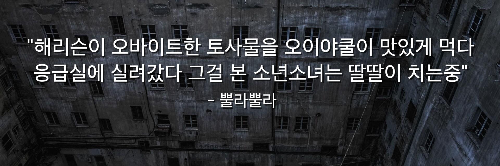 "해리슨이 오바이트한 토사물을 오이야쿨이 맛있게 먹다 응급실에 실려갔다 그걸 본 소년소녀는 딸딸이 치는중"