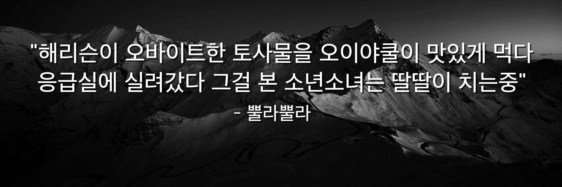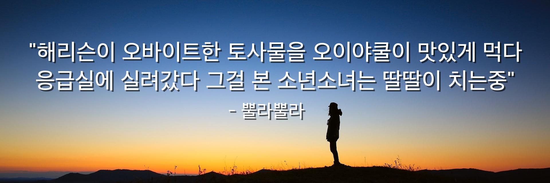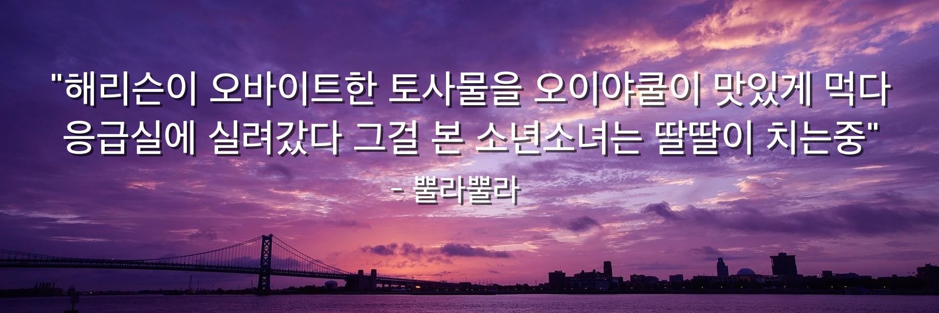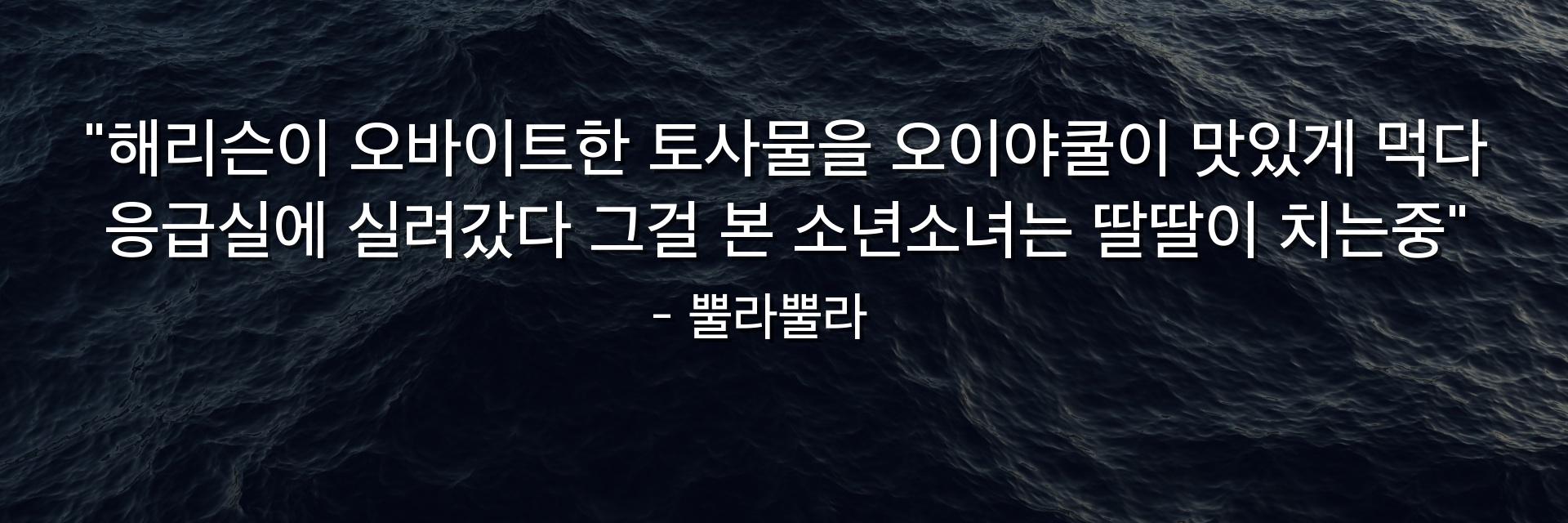 "해리슨이 오바이트한 토사물을 오이야쿨이 맛있게 먹다 응급실에 실려갔다 그걸 본 소년소녀는 딸딸이 치는중"