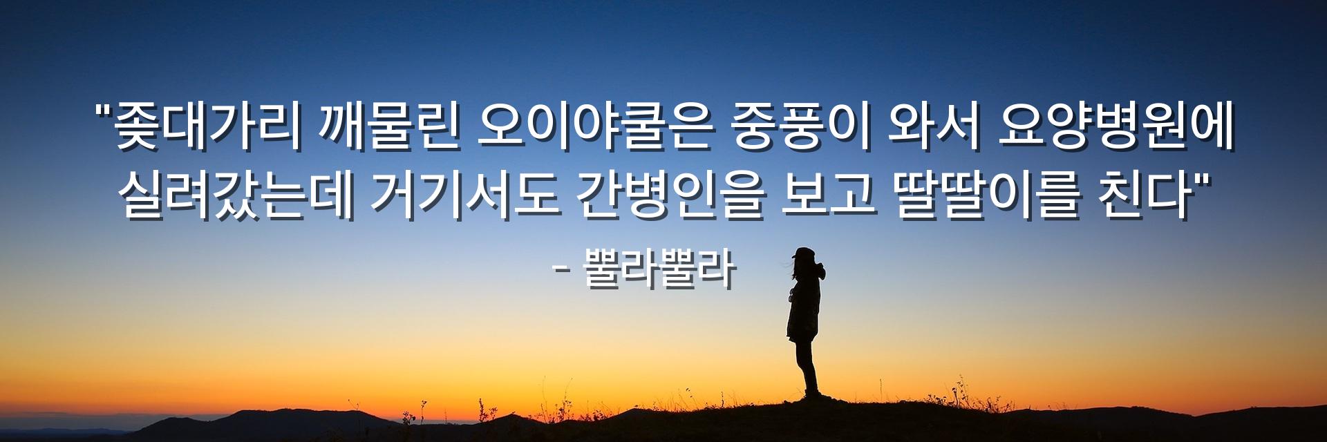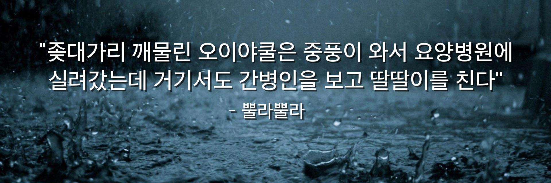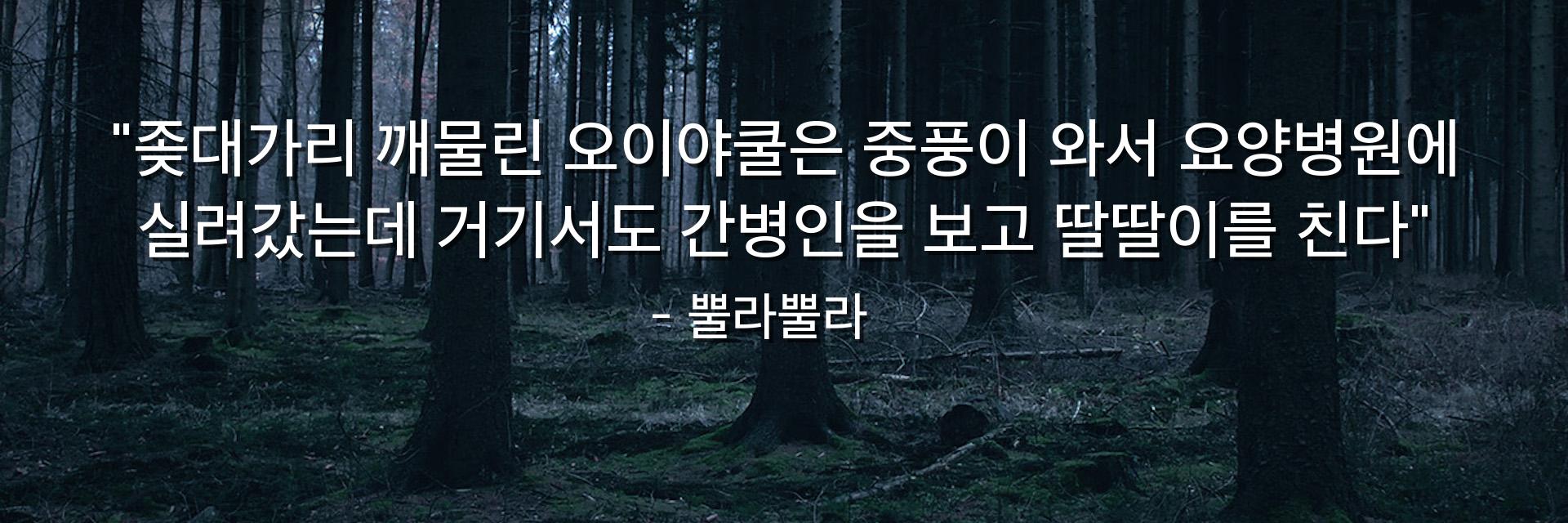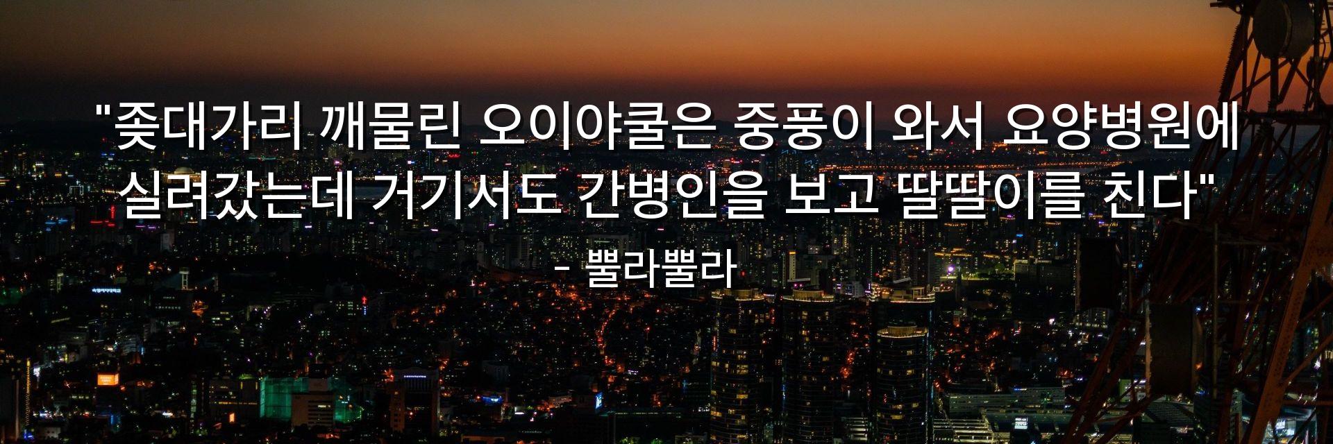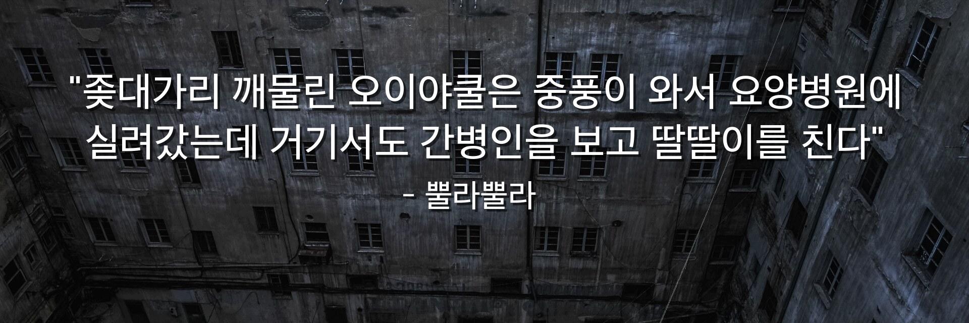 "좆대가리 깨물린 오이야쿨은 중풍이 와서 요양병원에 실려갔는데 거기서도 간병인을 보고 딸딸이를 친다"