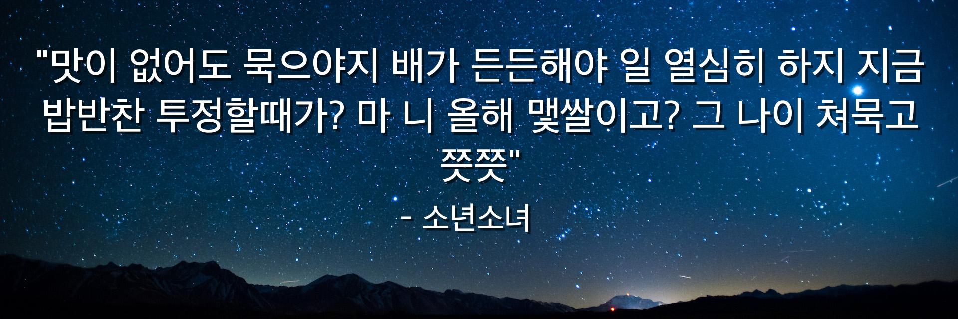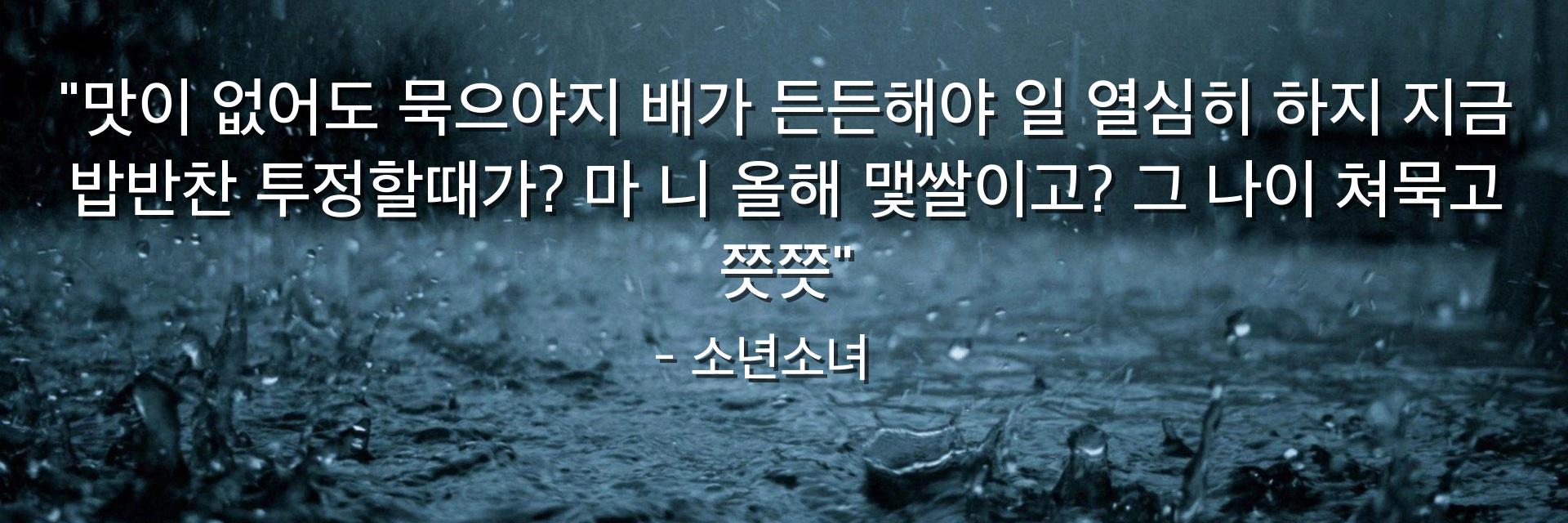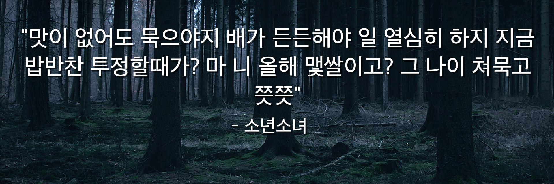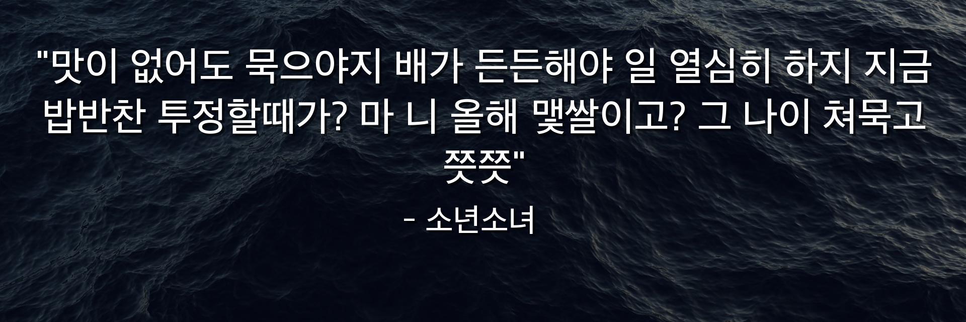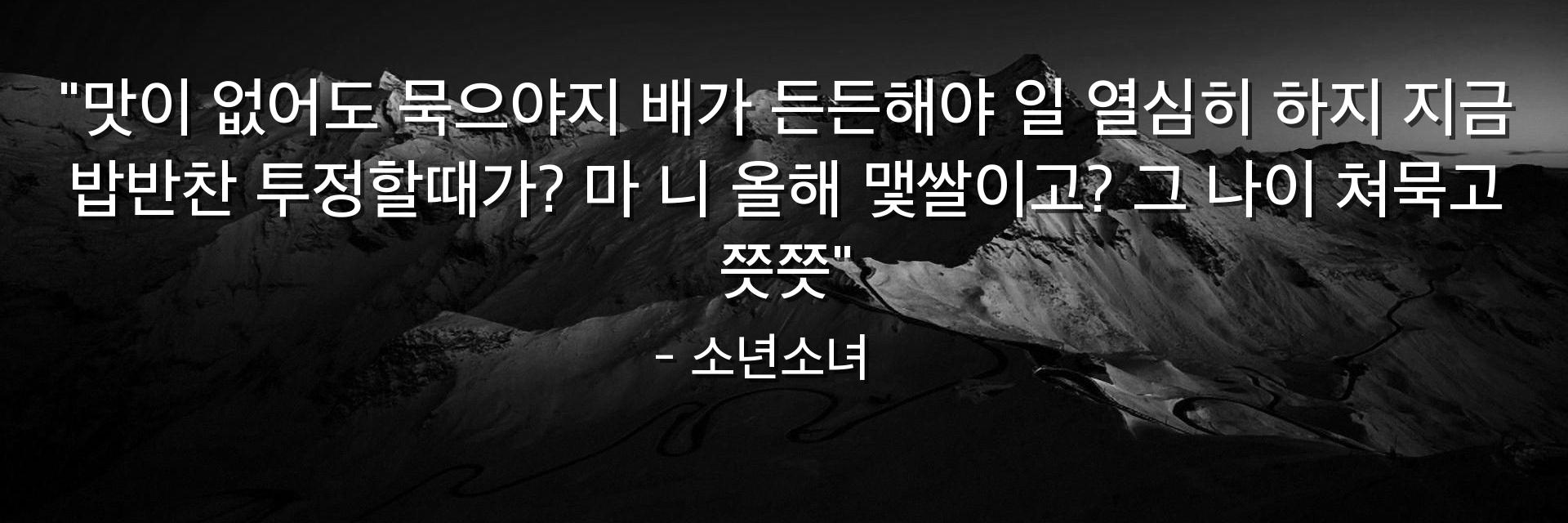 "맛이 없어도 묵으야지 배가 든든해야 일 열심히 하지 지금 밥반찬 투정할때가? 마 니 올해 맻쌀이고? 그 나이 쳐묵고 쯧쯧"