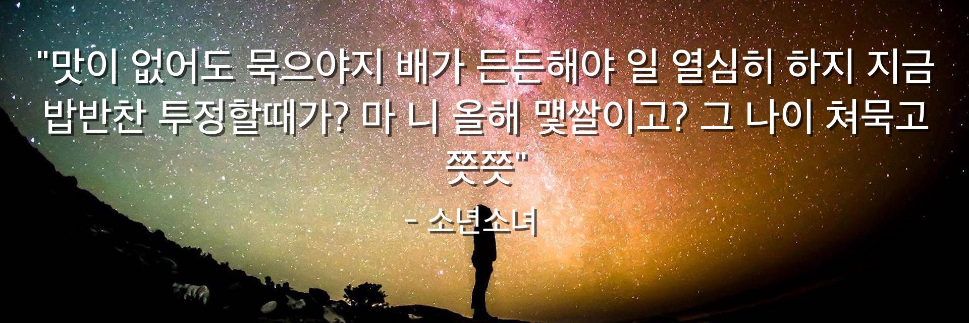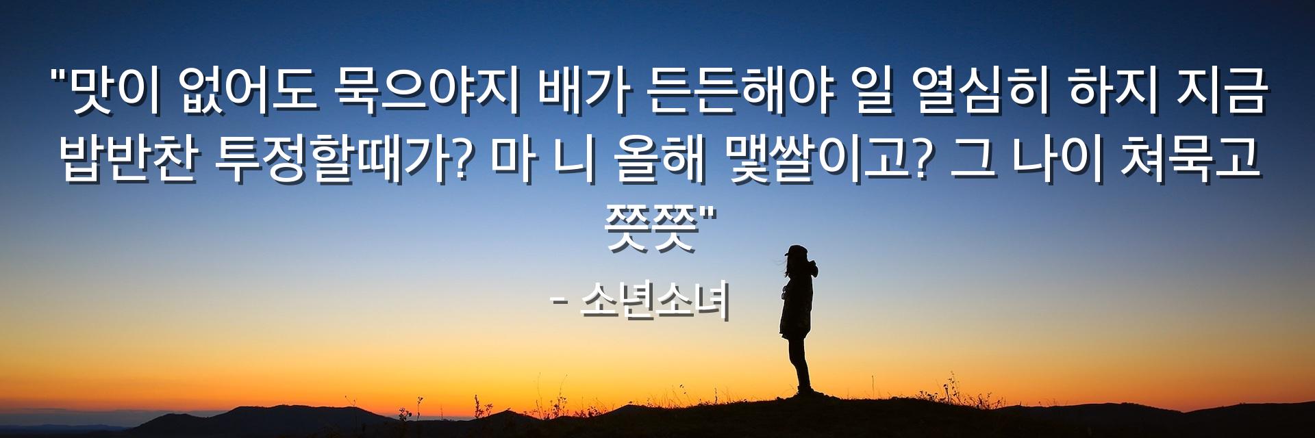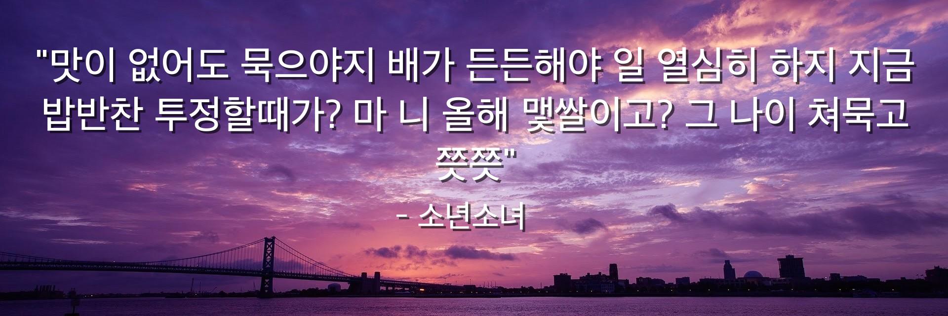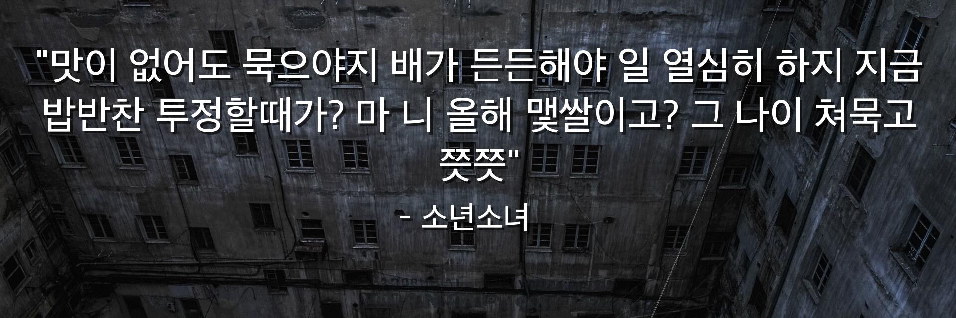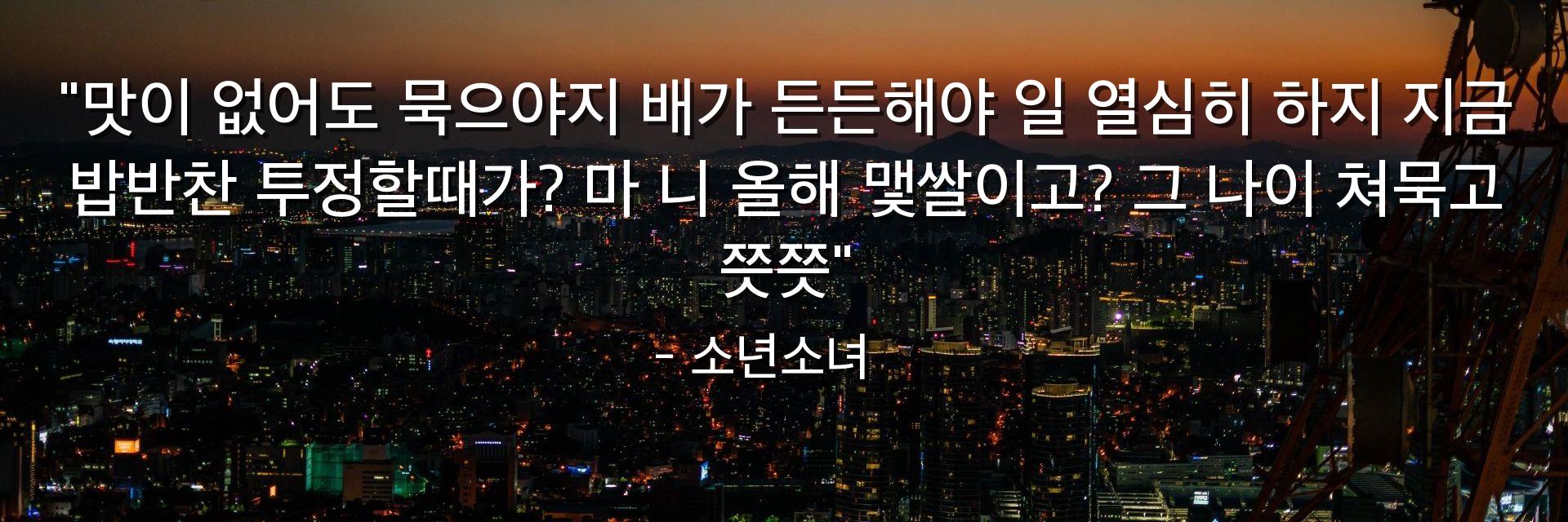 "맛이 없어도 묵으야지 배가 든든해야 일 열심히 하지 지금 밥반찬 투정할때가? 마 니 올해 맻쌀이고? 그 나이 쳐묵고 쯧쯧"