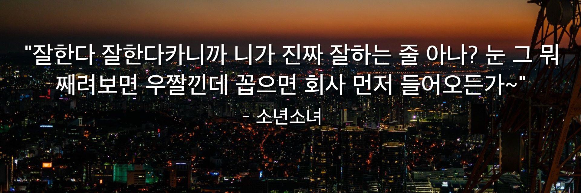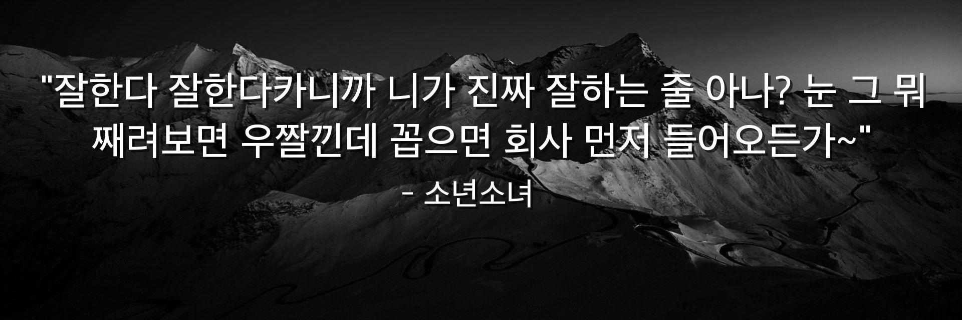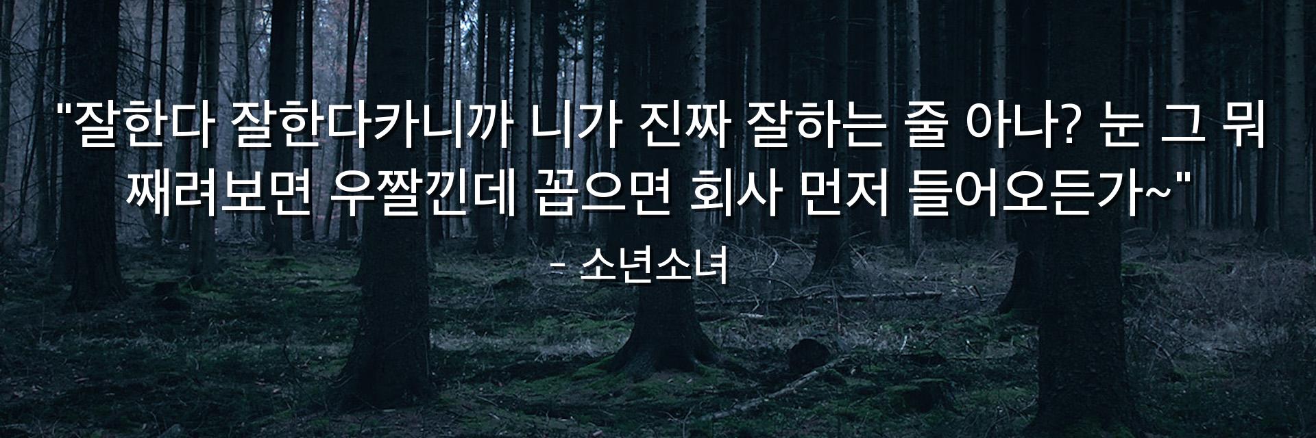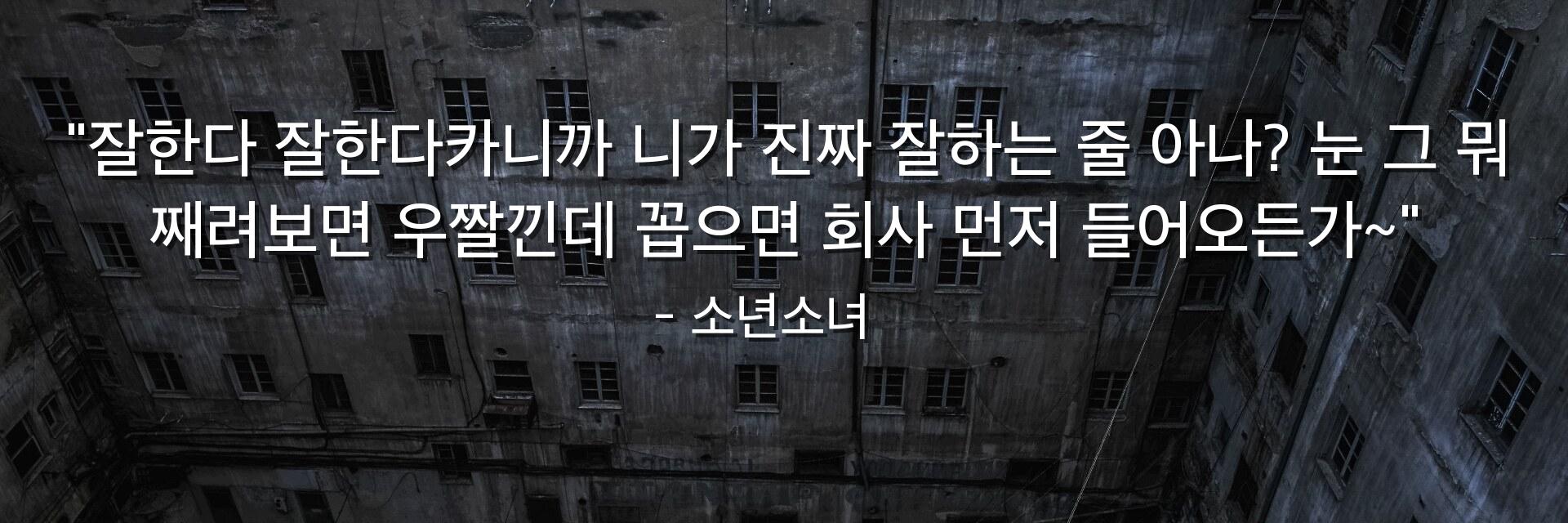 "잘한다 잘한다카니까 니가 진짜 잘하는 줄 아나? 눈 그 뭐 째려보면 우짤낀데 꼽으면 회사 먼저 들어오든가~"