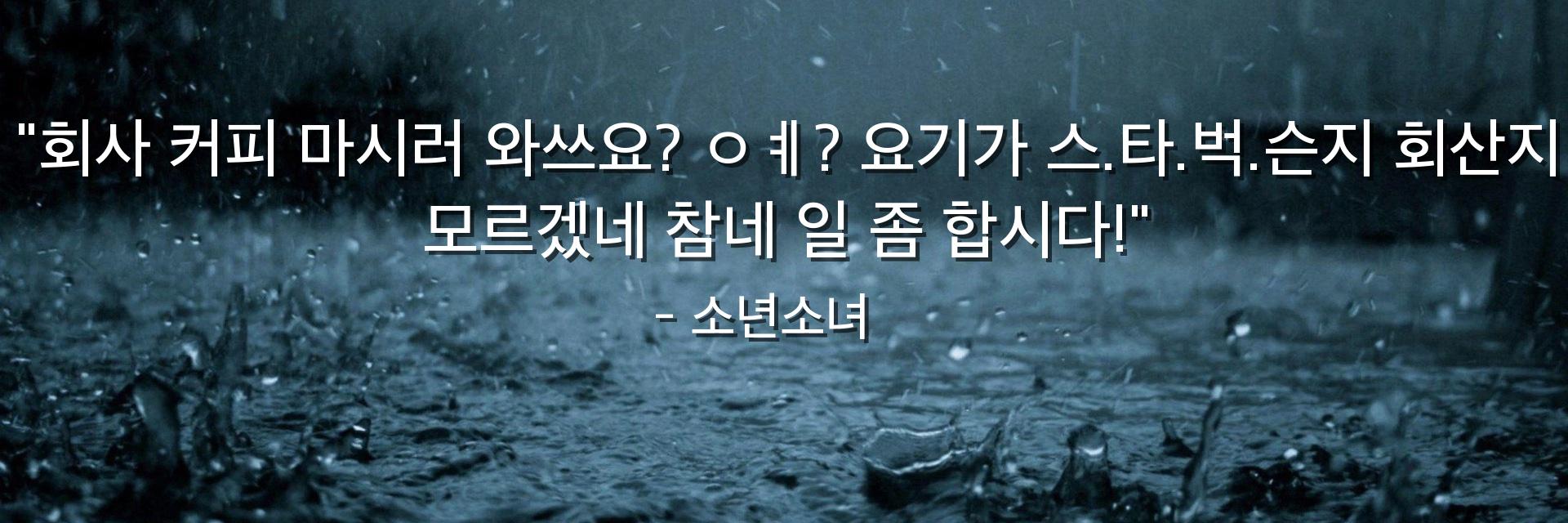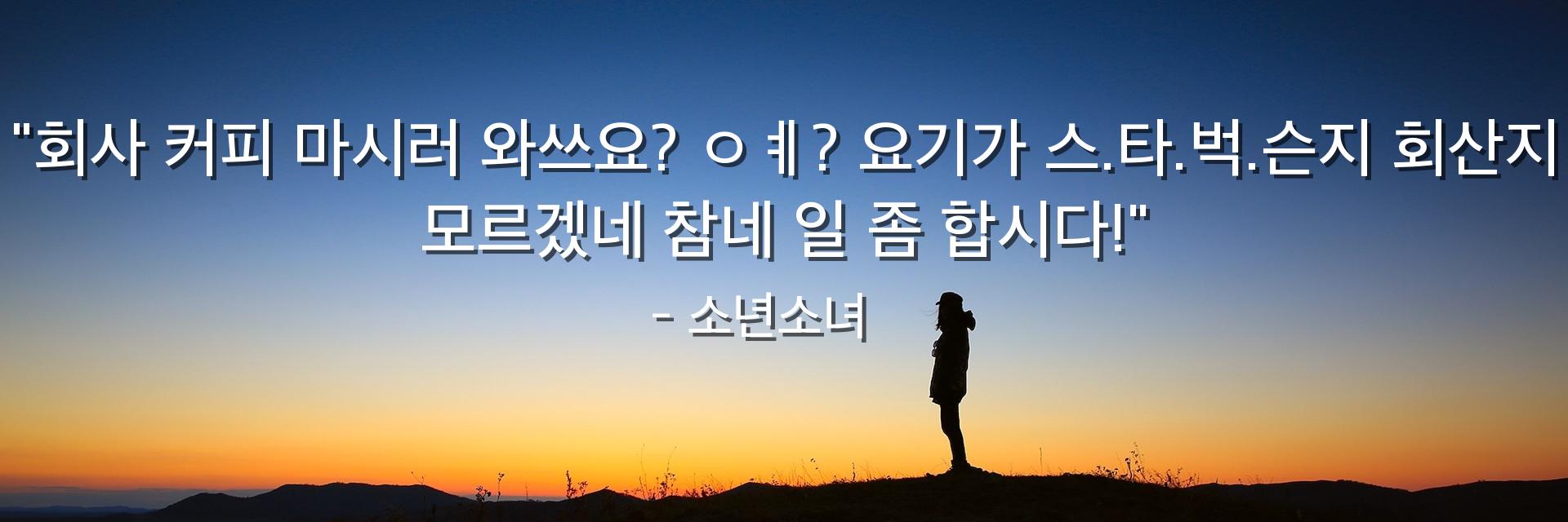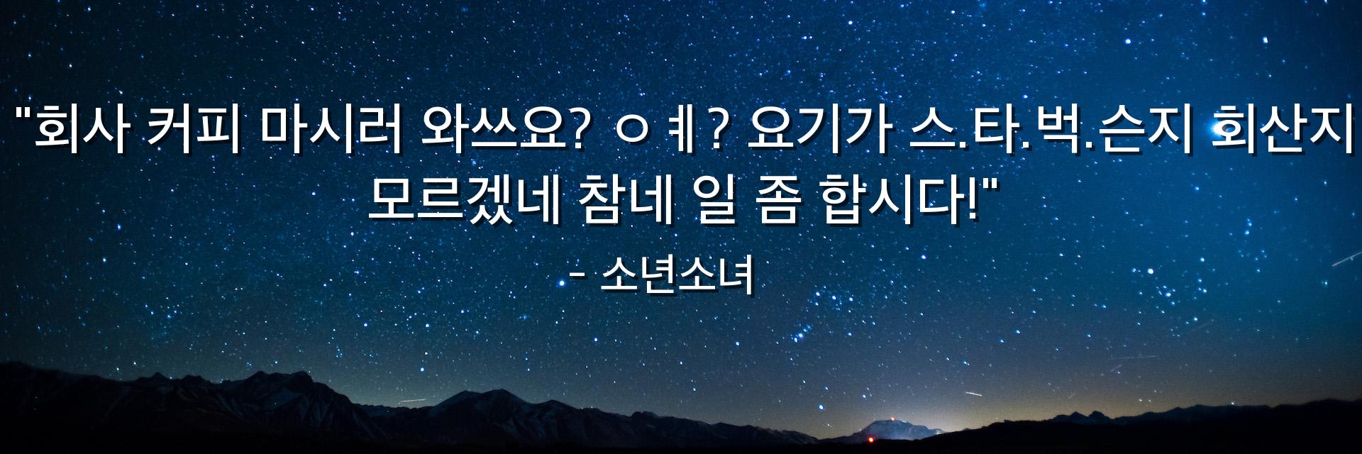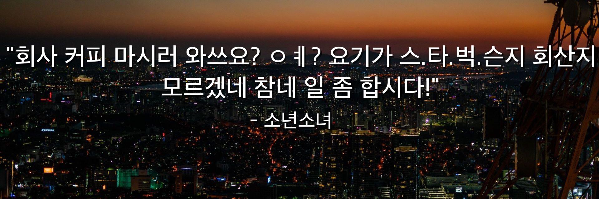 "회사 커피 마시러 와쓰요? ㅇㅖ? 요기가 스.타.벅.슨지 회산지 모르겠네 참네 일 좀 합시다!"