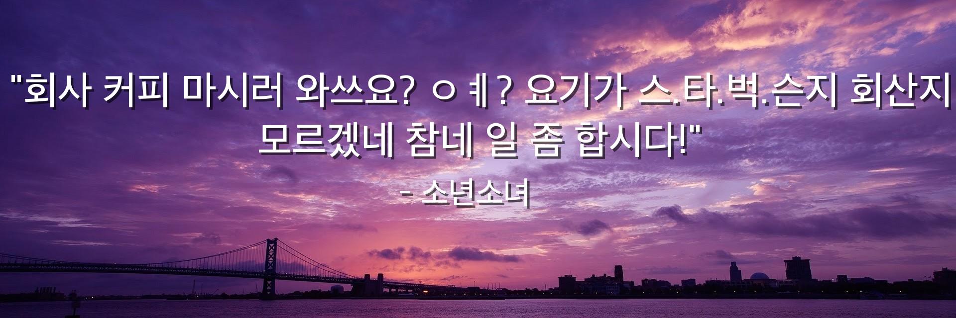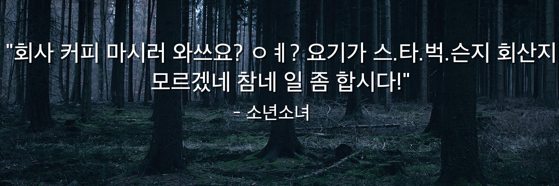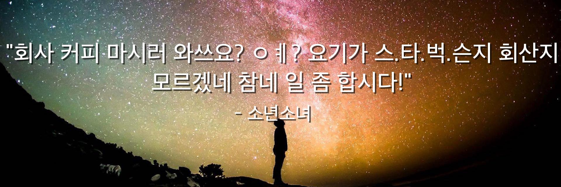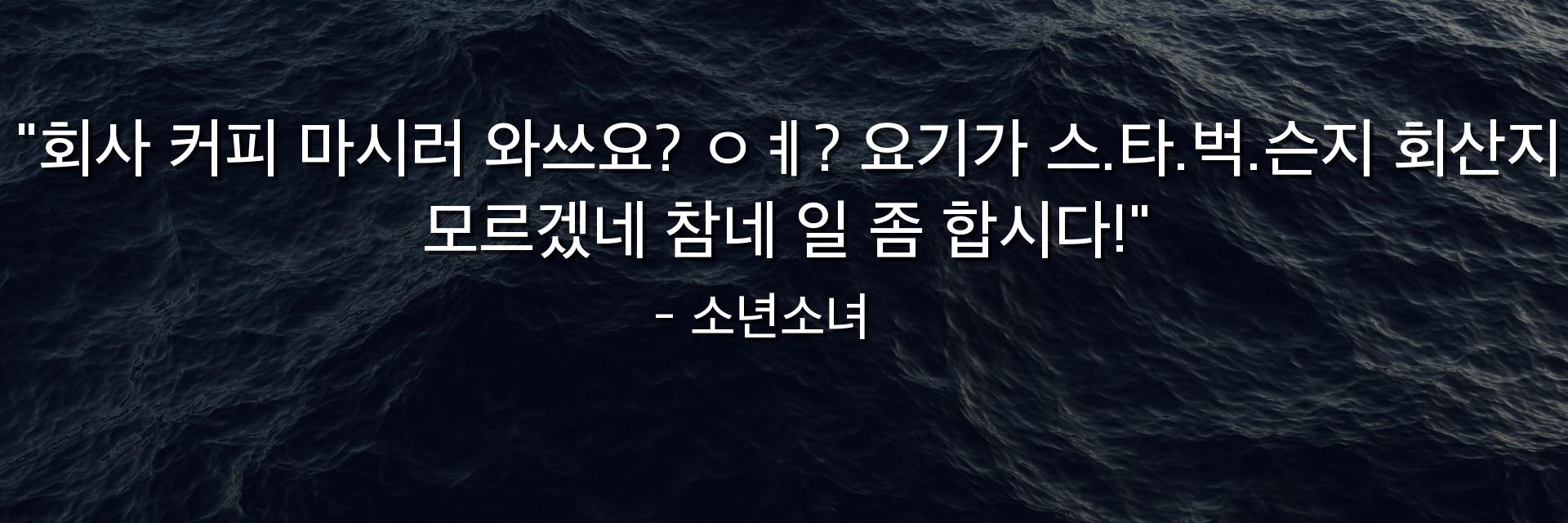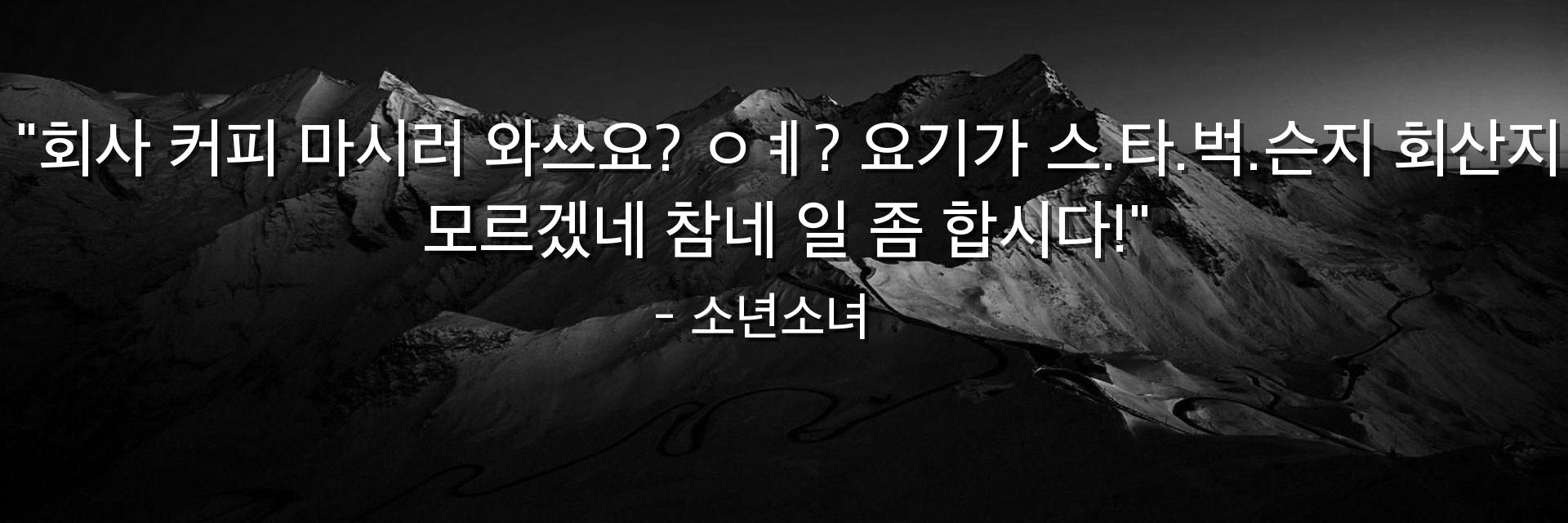 "회사 커피 마시러 와쓰요? ㅇㅖ? 요기가 스.타.벅.슨지 회산지 모르겠네 참네 일 좀 합시다!"