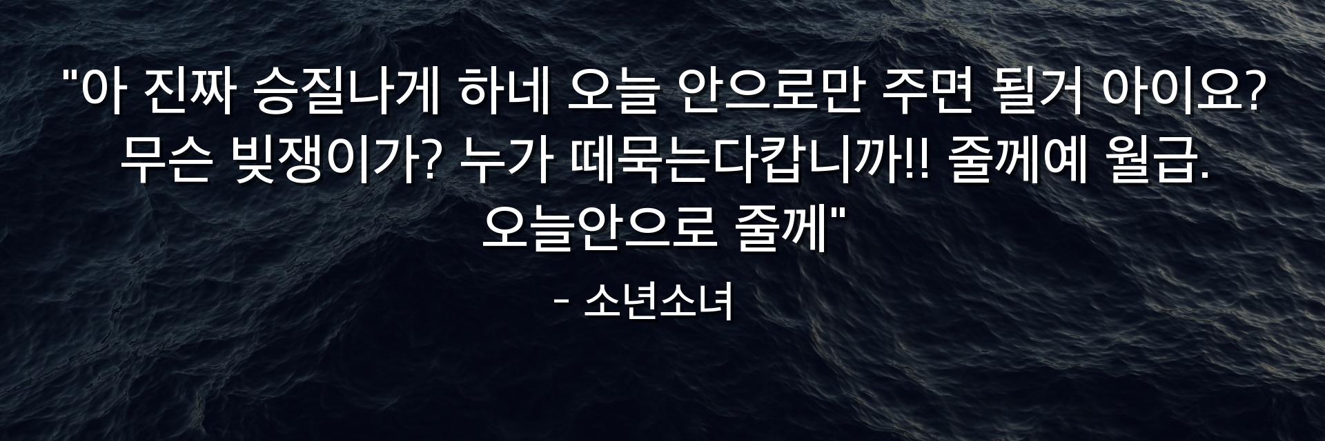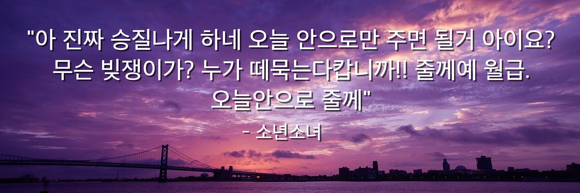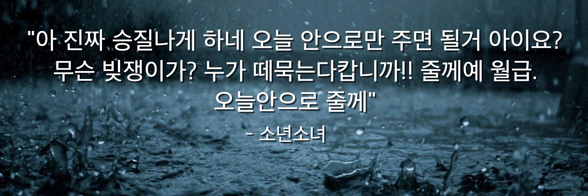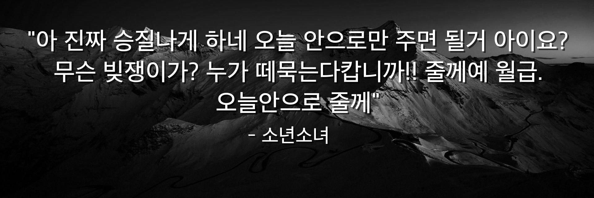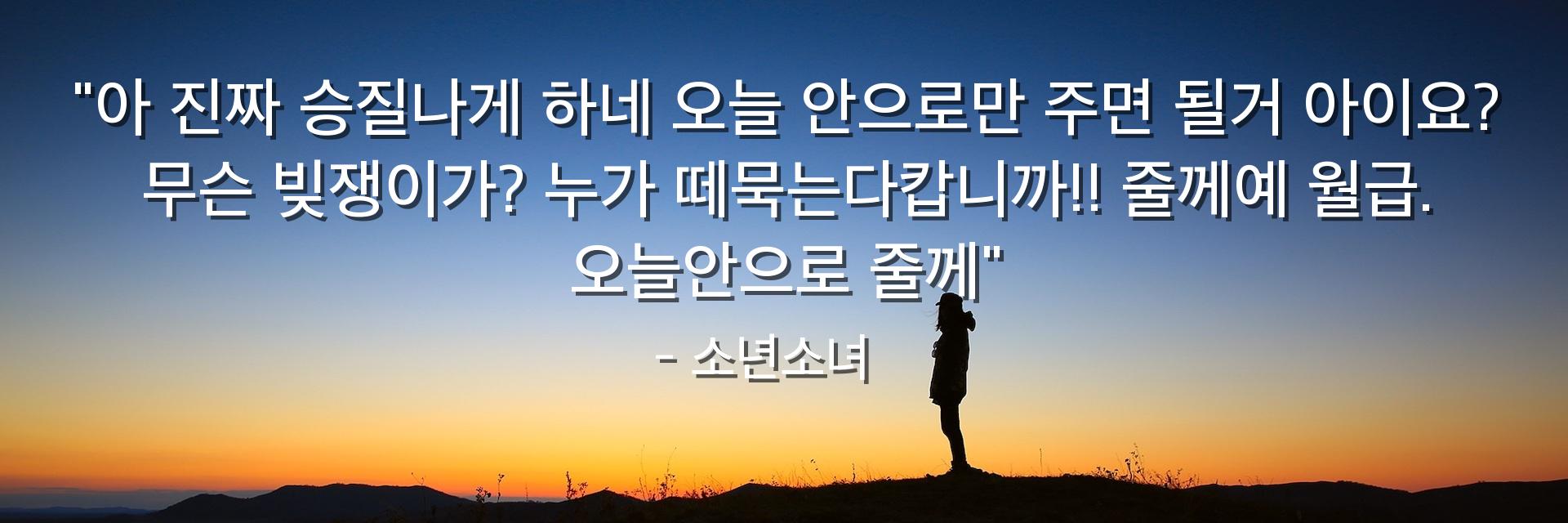"아 진짜 승질나게 하네 오늘 안으로만 주면 될거 아이요? 무슨 빚쟁이가? 누가 떼묵는다캅니까!! 줄께예 월급. 오늘안으로 줄께"