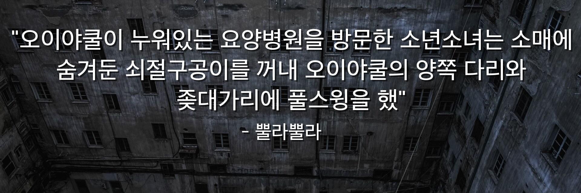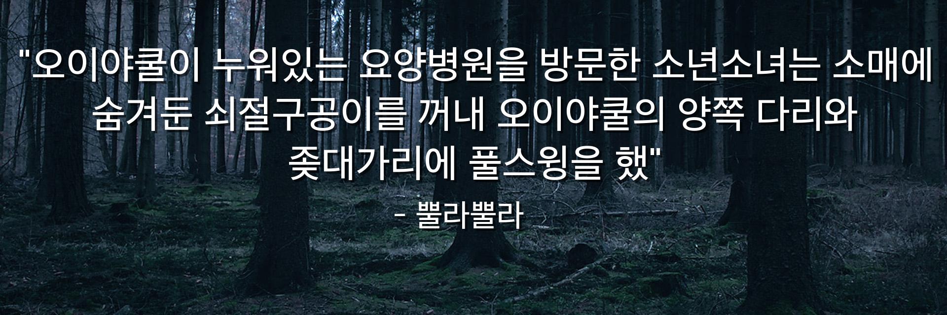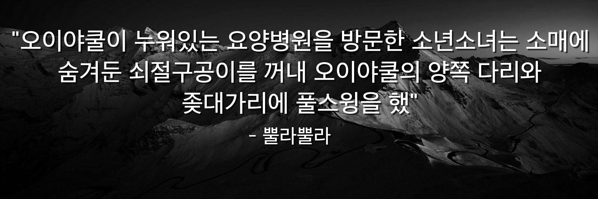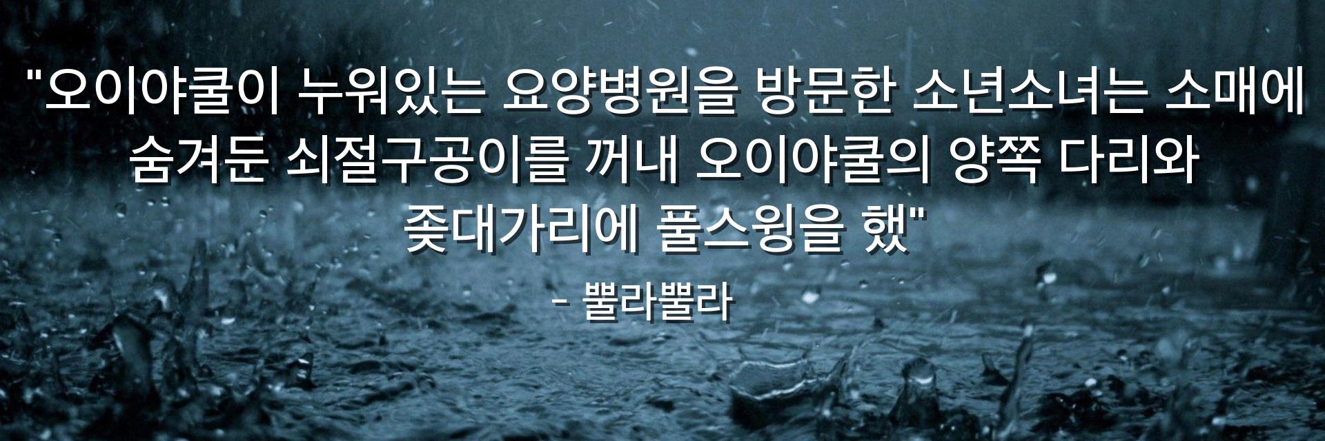 "오이야쿨이 누워있는 요양병원을 방문한 소년소녀는 소매에 숨겨둔 쇠절구공이를 꺼내 오이야쿨의 양쪽 다리와 좆대가리에 풀스윙을 했"