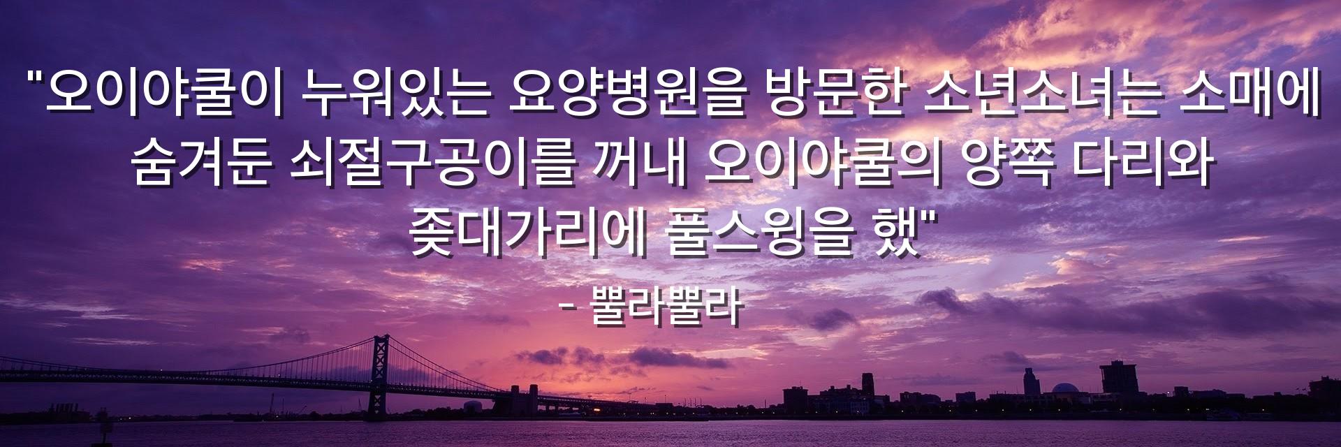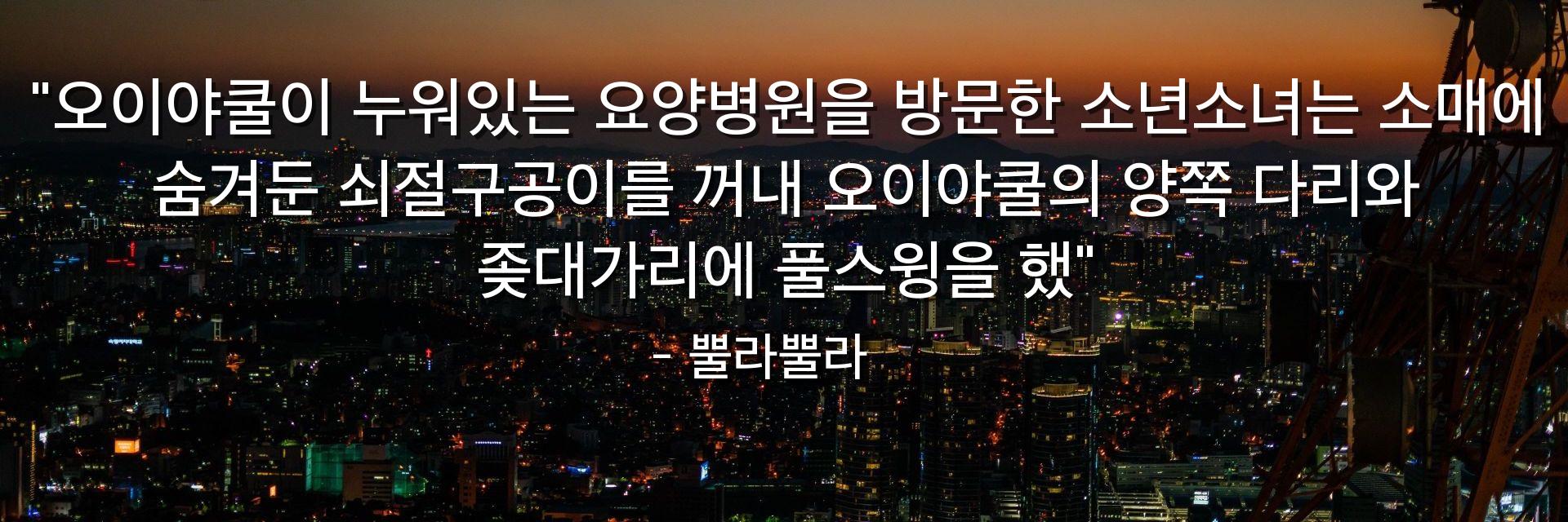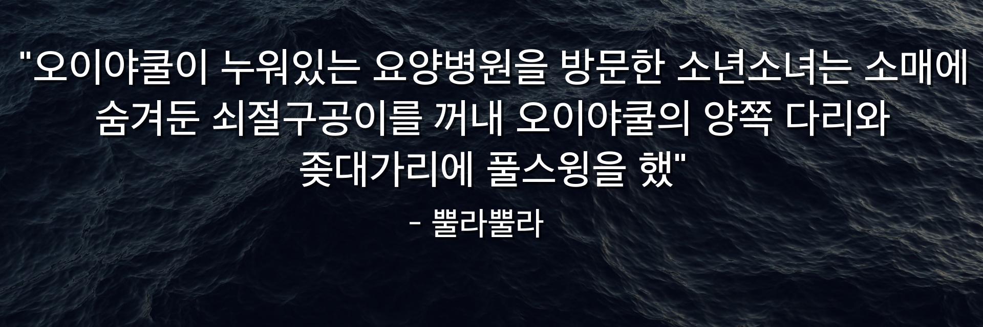 "오이야쿨이 누워있는 요양병원을 방문한 소년소녀는 소매에 숨겨둔 쇠절구공이를 꺼내 오이야쿨의 양쪽 다리와 좆대가리에 풀스윙을 했"