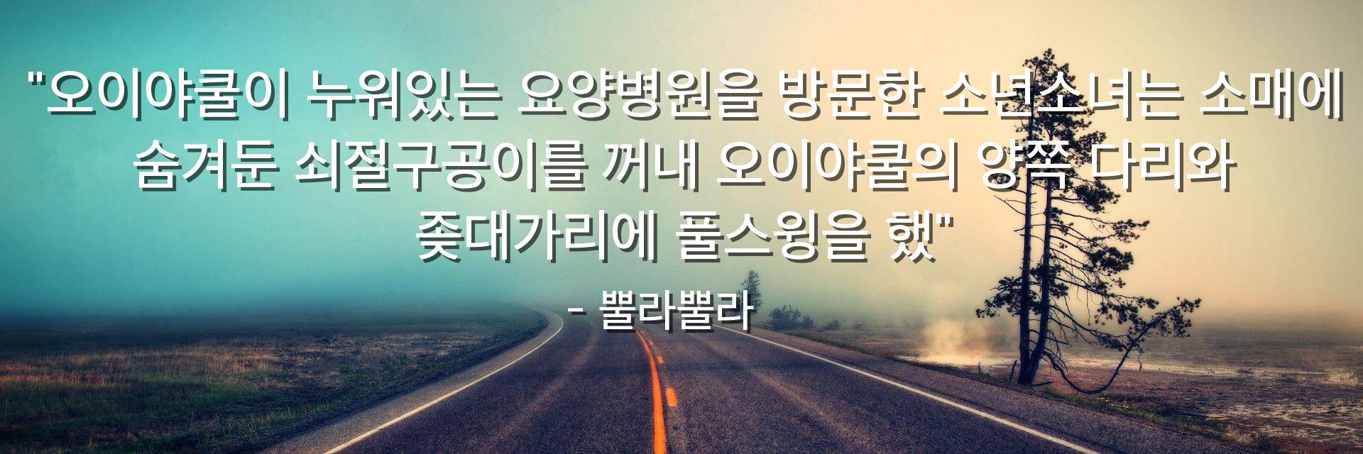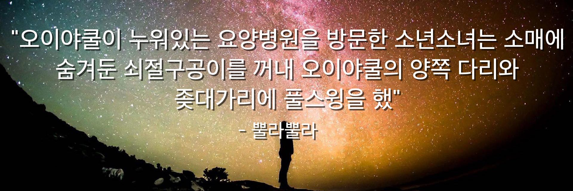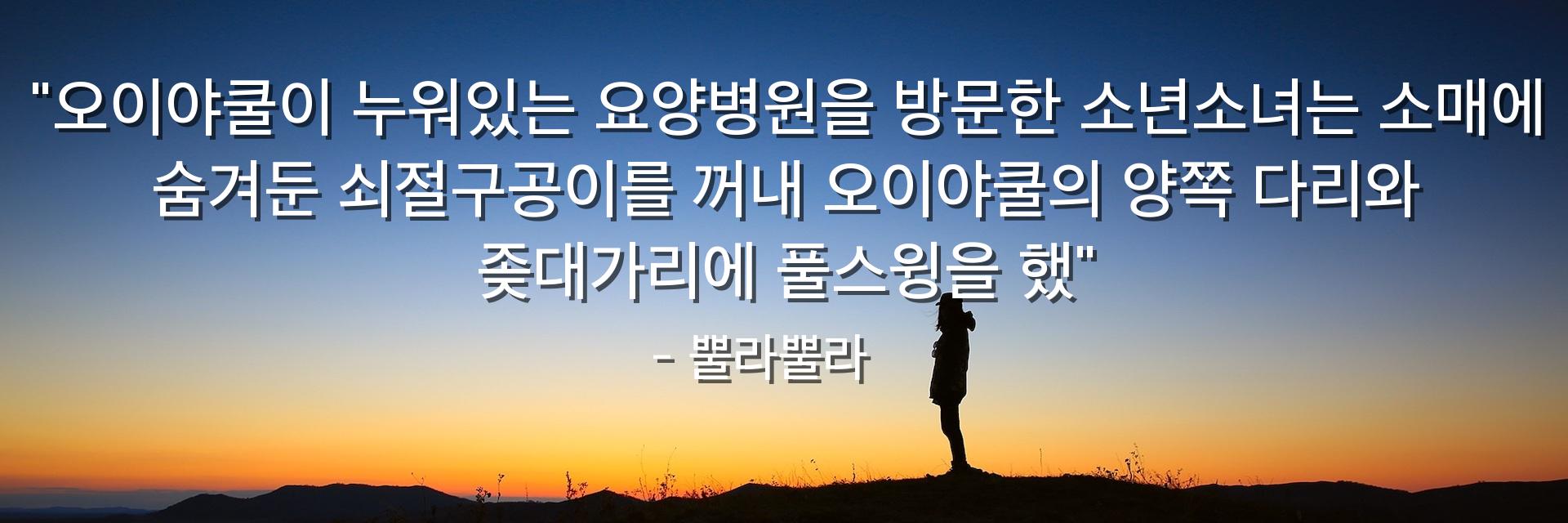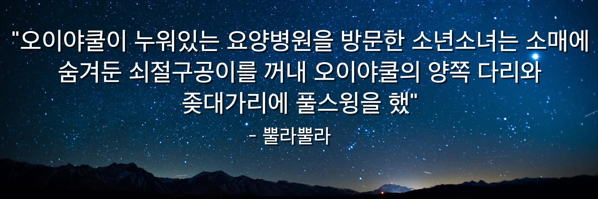"오이야쿨이 누워있는 요양병원을 방문한 소년소녀는 소매에 숨겨둔 쇠절구공이를 꺼내 오이야쿨의 양쪽 다리와 좆대가리에 풀스윙을 했"