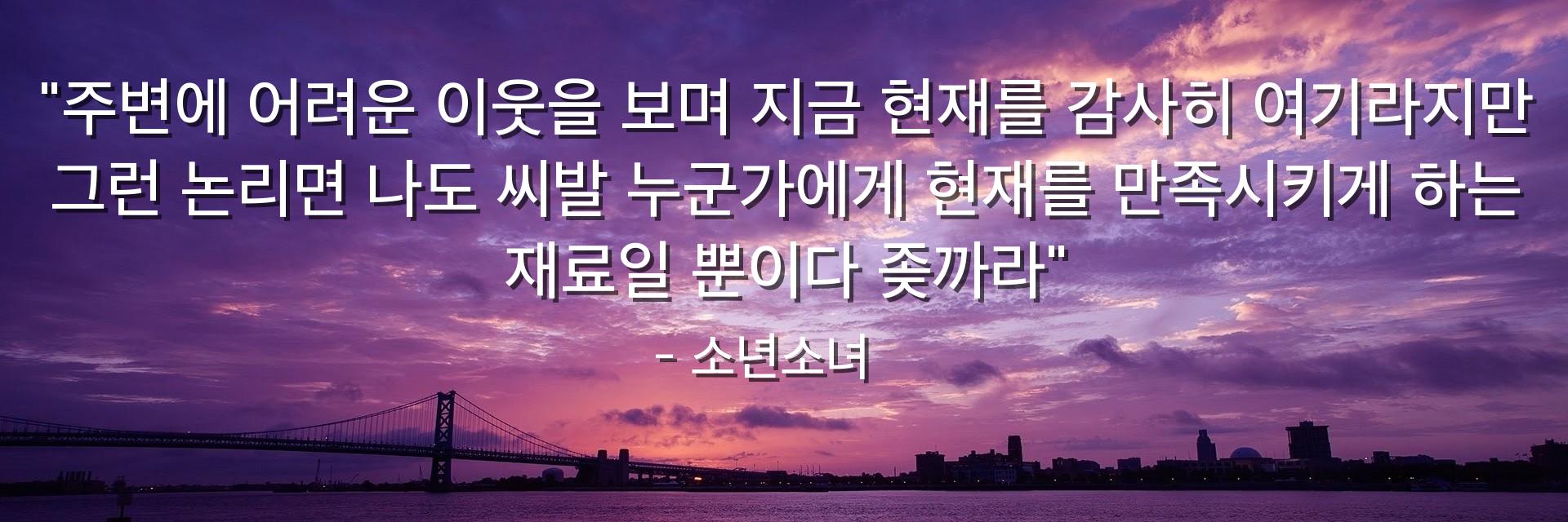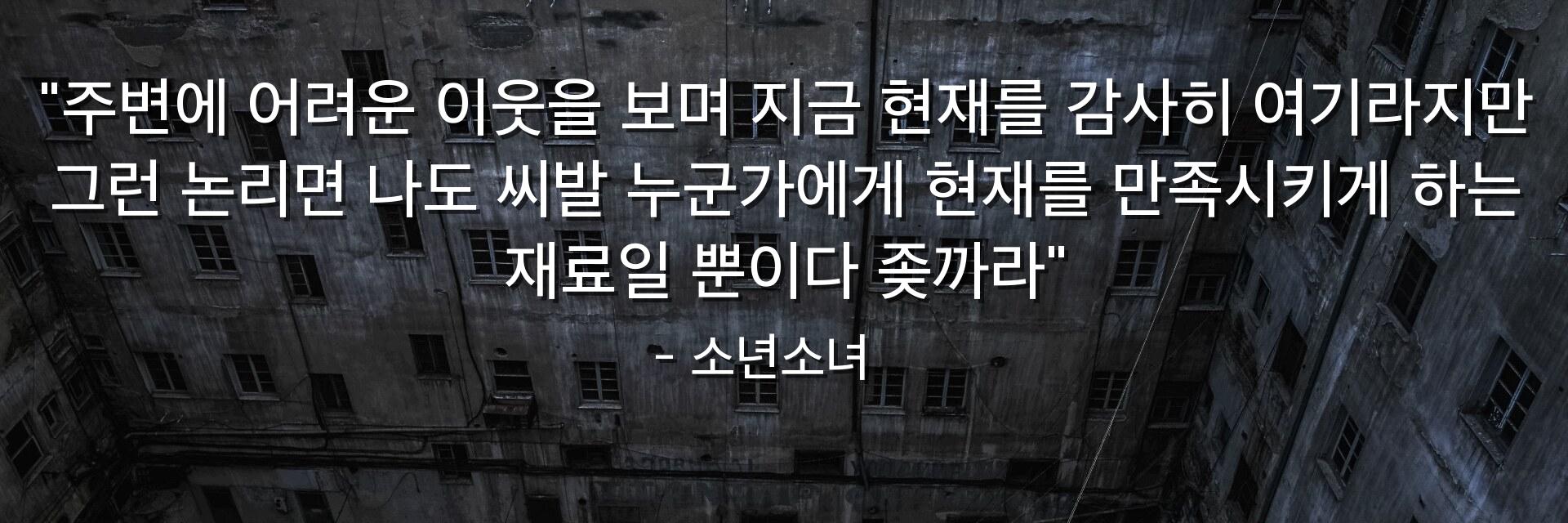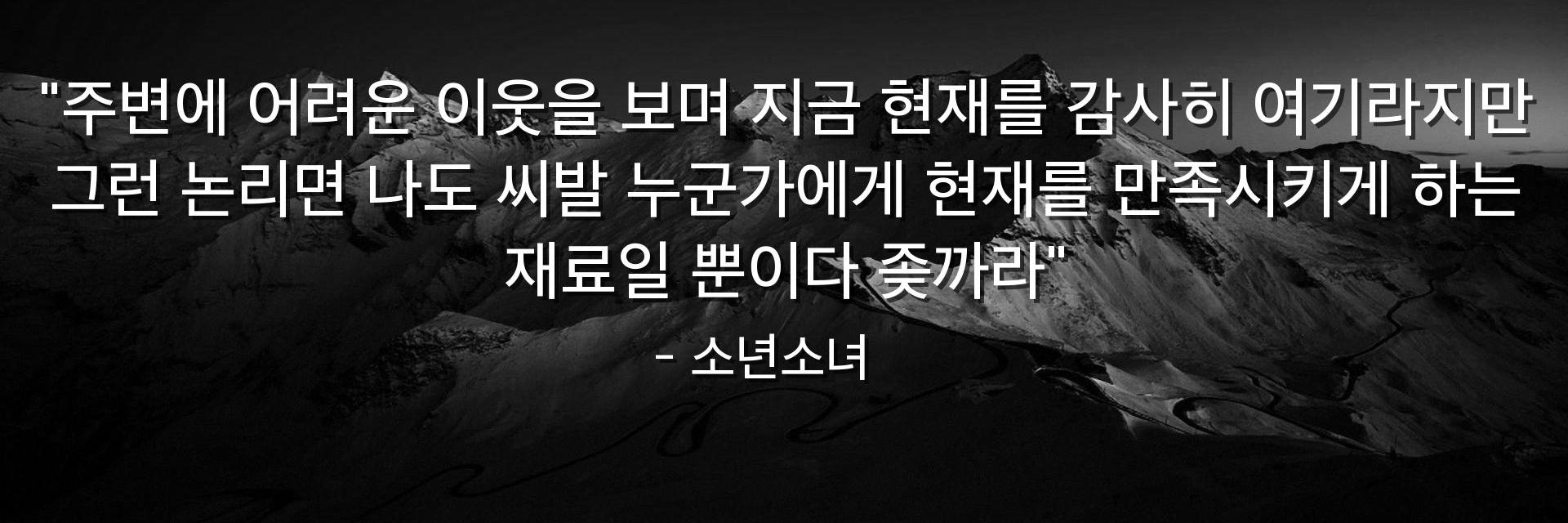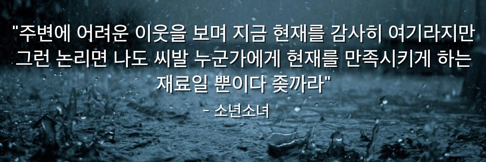 "주변에 어려운 이웃을 보며 지금 현재를 감사히 여기라지만 그런 논리면 나도 씨발 누군가에게 현재를 만족시키게 하는 재료일 뿐이다 좆까라"