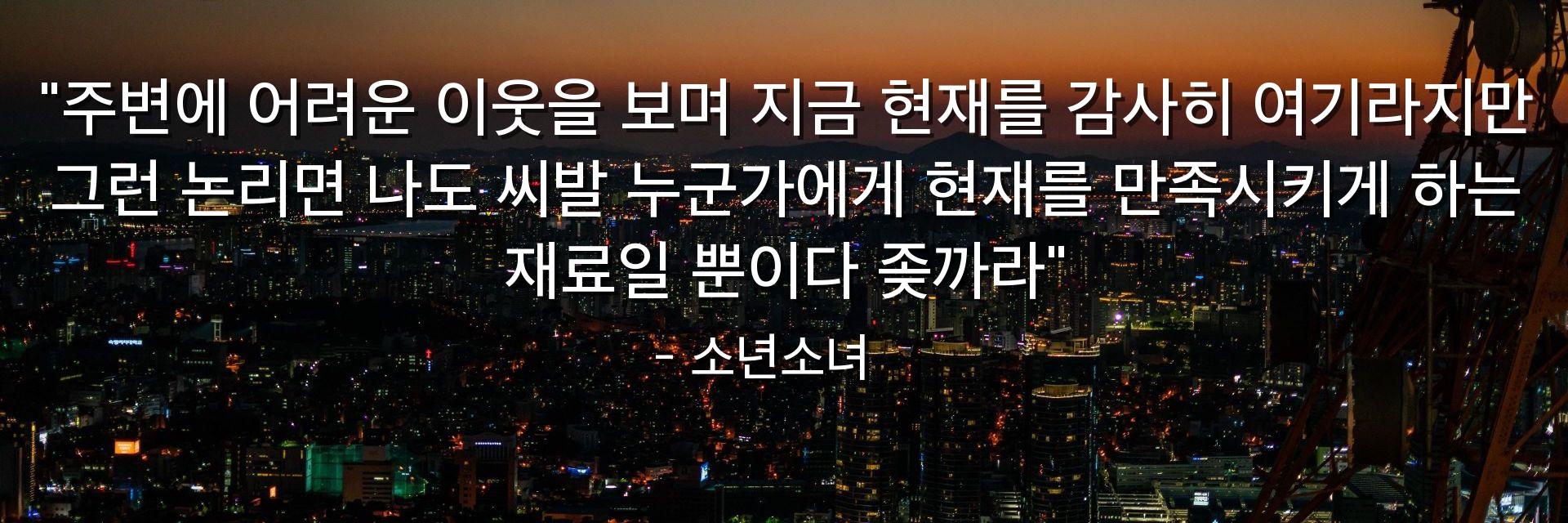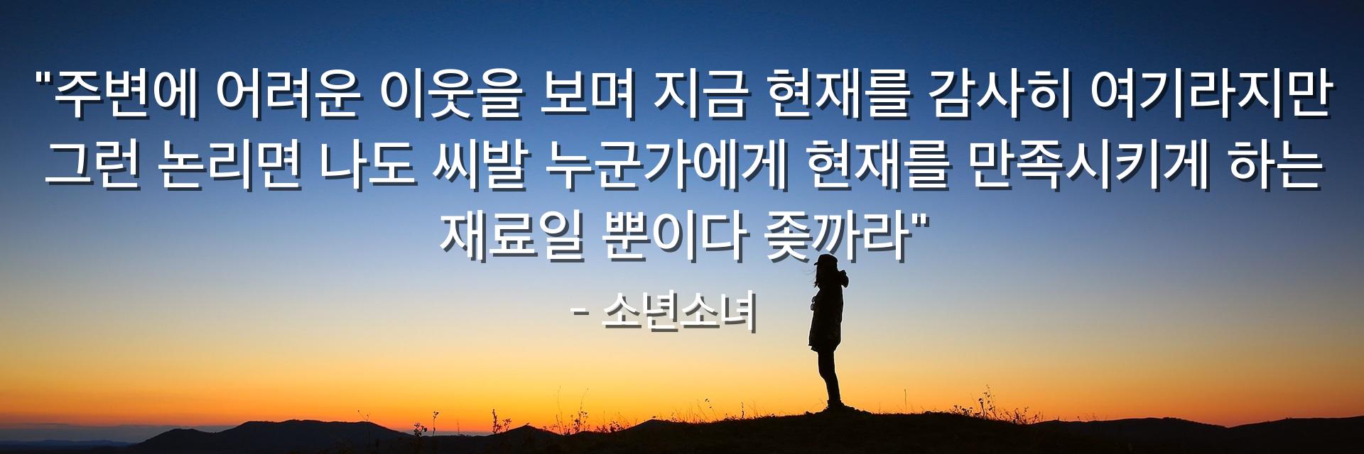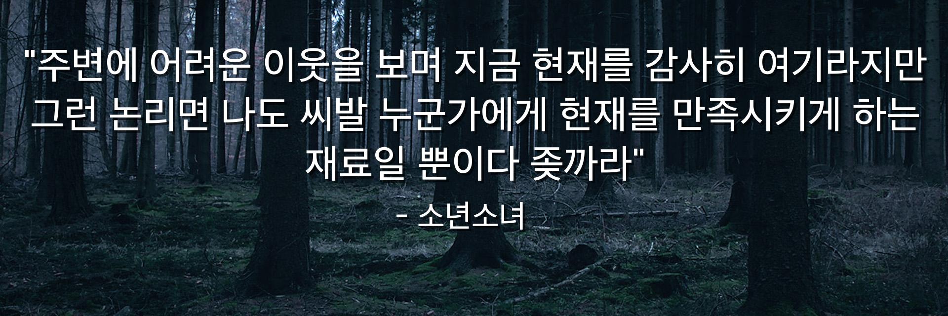 "주변에 어려운 이웃을 보며 지금 현재를 감사히 여기라지만 그런 논리면 나도 씨발 누군가에게 현재를 만족시키게 하는 재료일 뿐이다 좆까라"