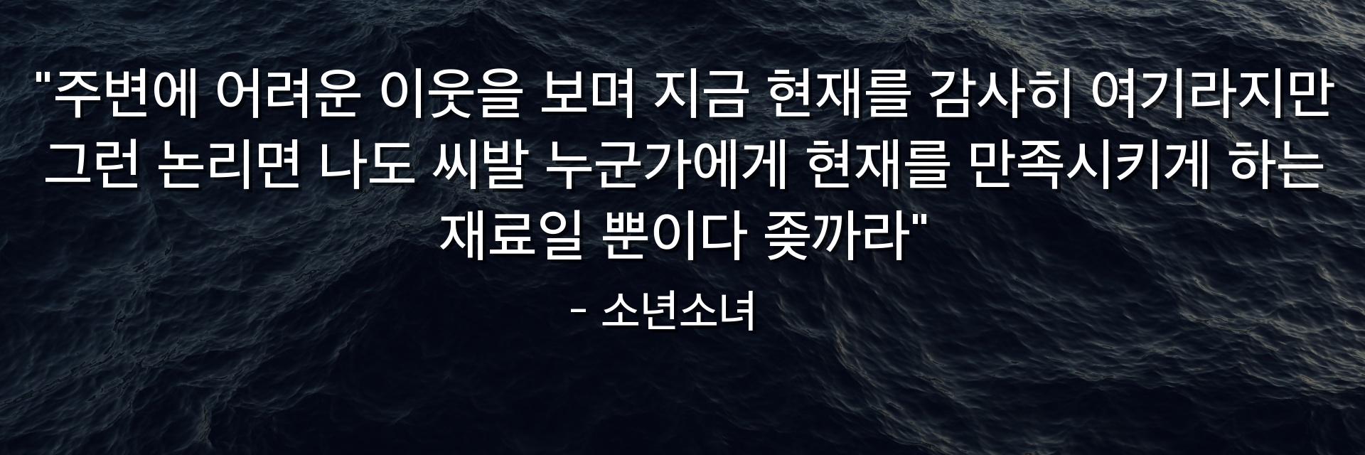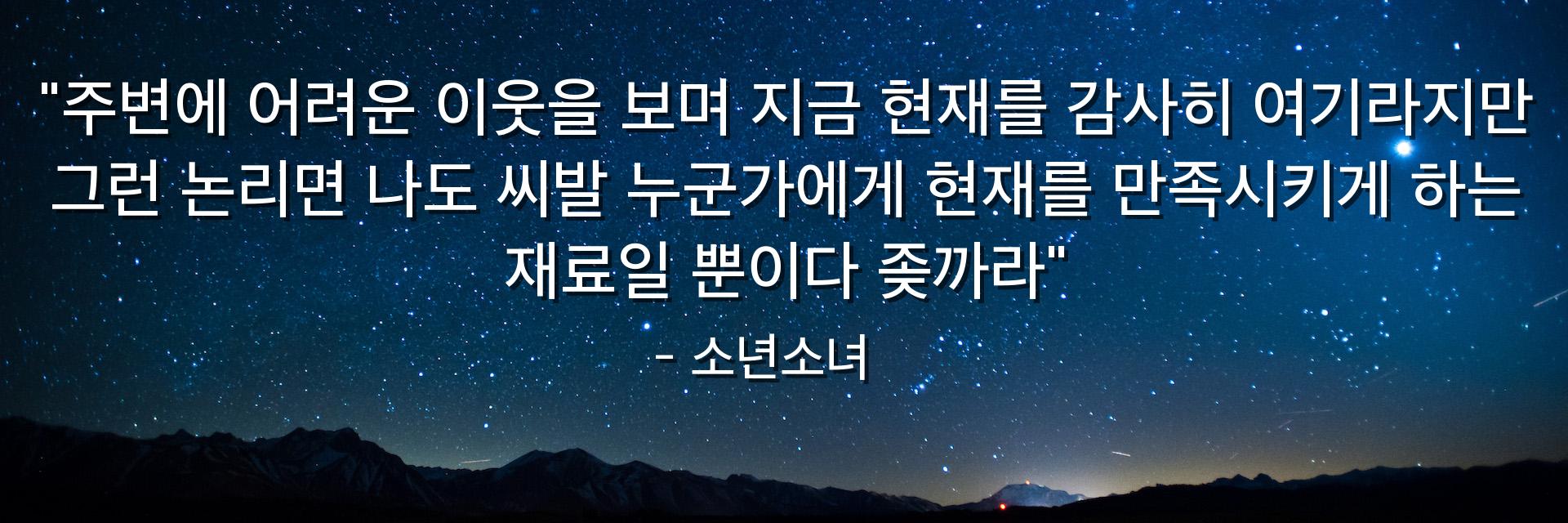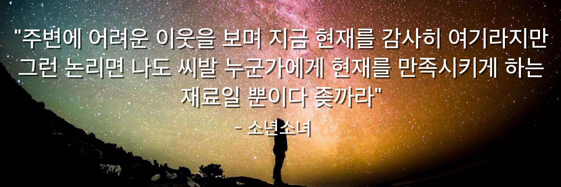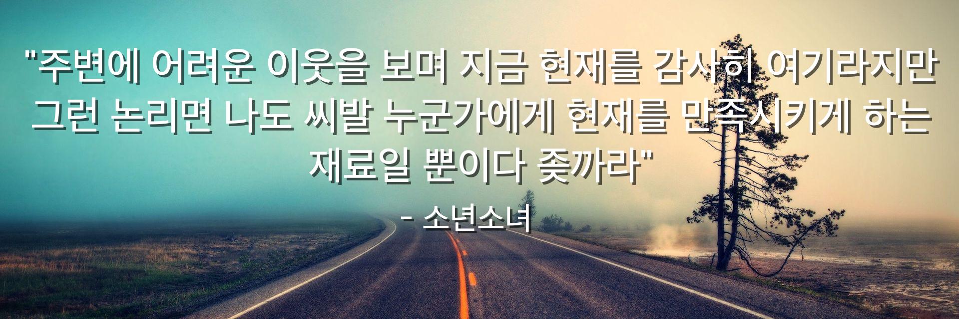 "주변에 어려운 이웃을 보며 지금 현재를 감사히 여기라지만 그런 논리면 나도 씨발 누군가에게 현재를 만족시키게 하는 재료일 뿐이다 좆까라"