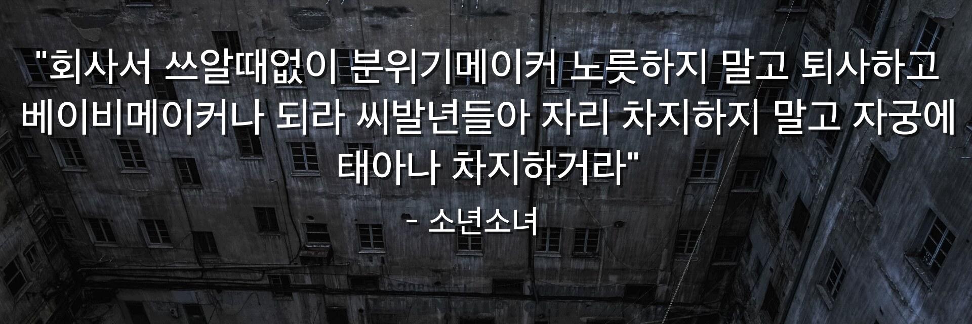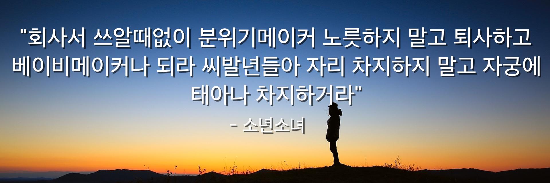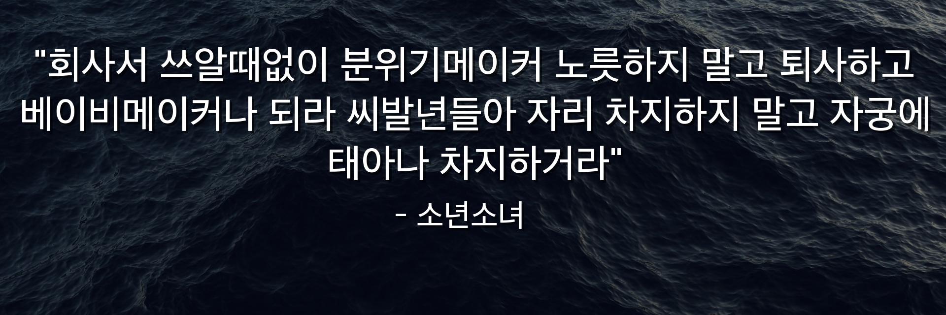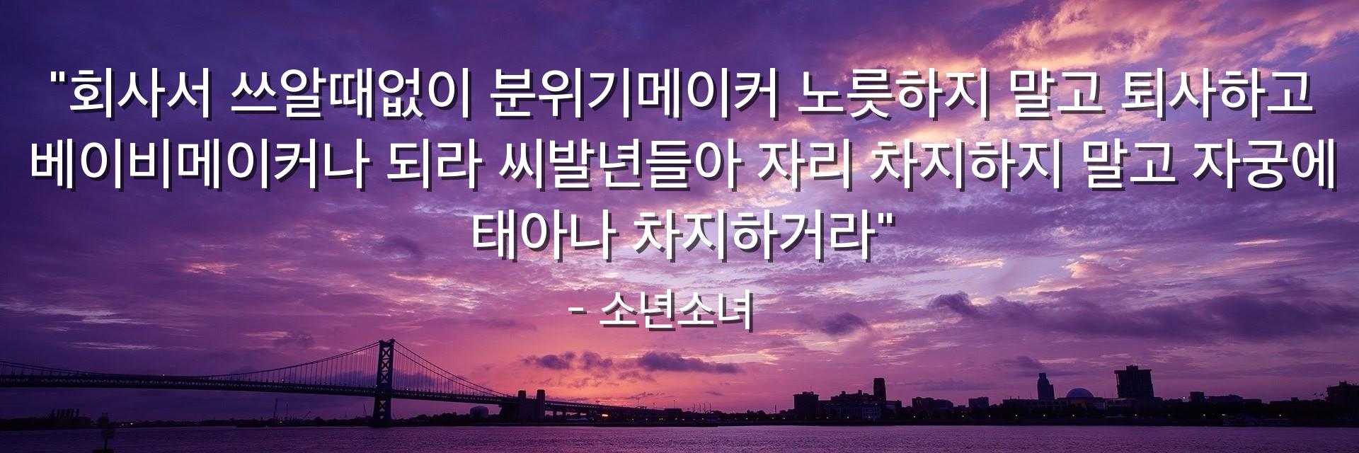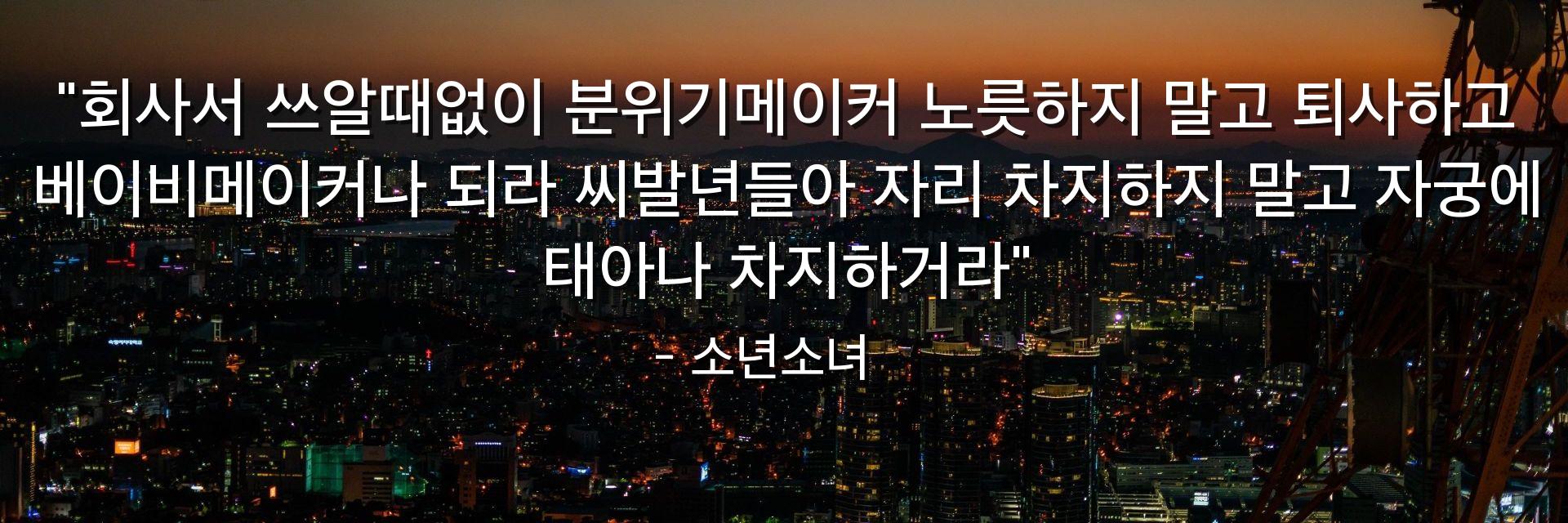 "회사서 쓰알때없이 분위기메이커 노릇하지 말고 퇴사하고 베이비메이커나 되라 씨발년들아 자리 차지하지 말고 자궁에 태아나 차지하거라"