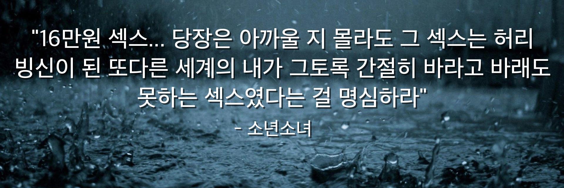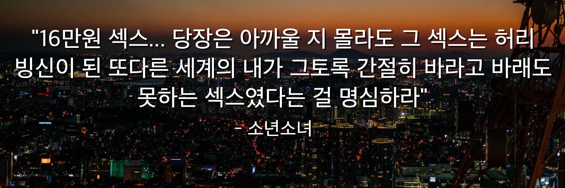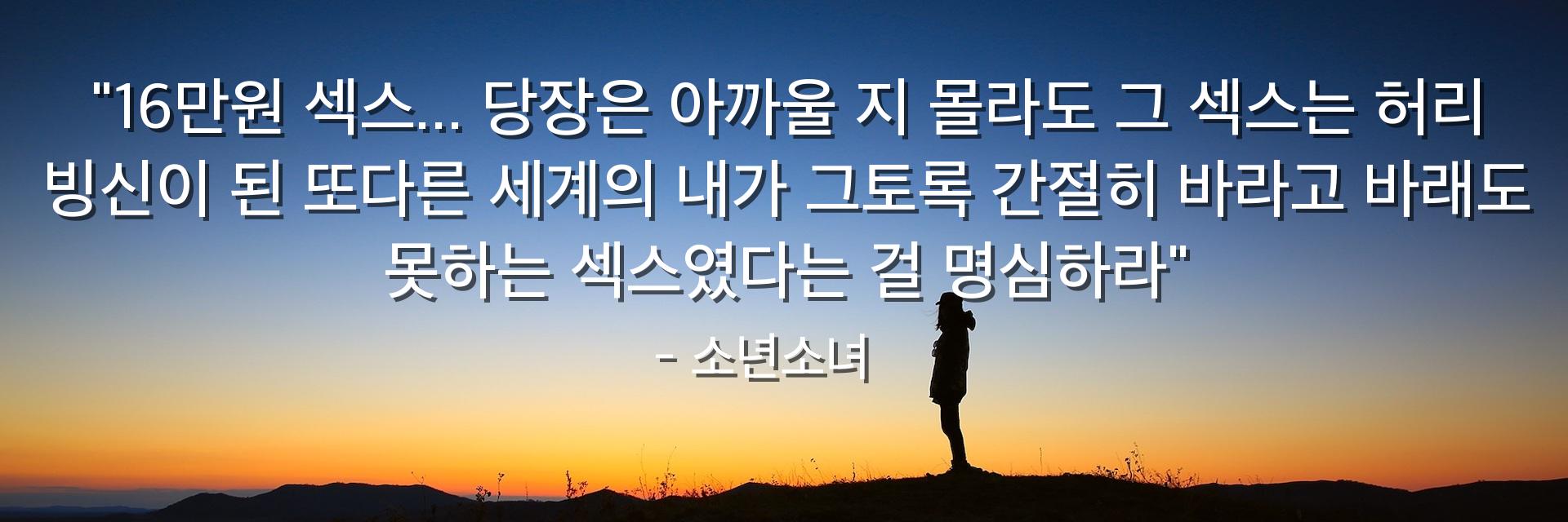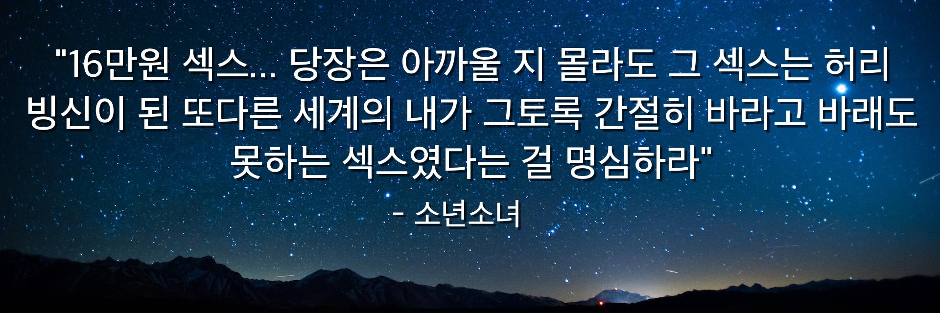 "16만원 섹스... 당장은 아까울 지 몰라도 그 섹스는 허리 빙신이 된 또다른 세계의 내가 그토록 간절히 바라고 바래도 못하는 섹스였다는 걸 명심하라"