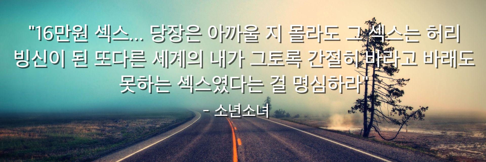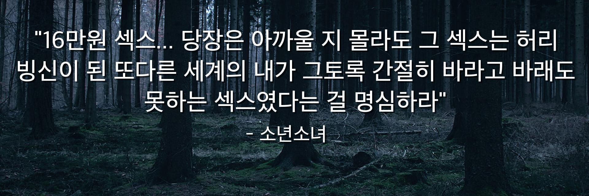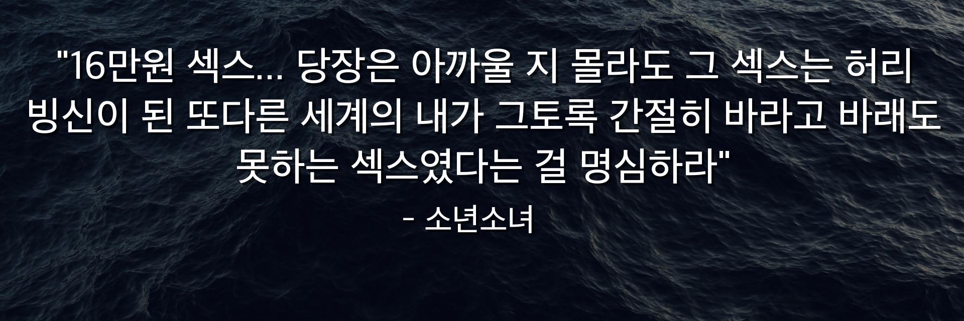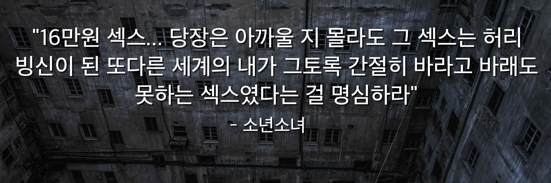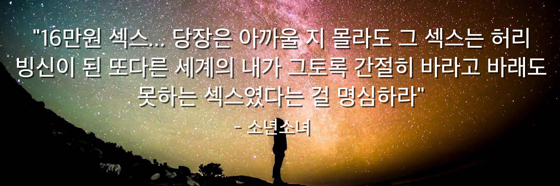 "16만원 섹스... 당장은 아까울 지 몰라도 그 섹스는 허리 빙신이 된 또다른 세계의 내가 그토록 간절히 바라고 바래도 못하는 섹스였다는 걸 명심하라"