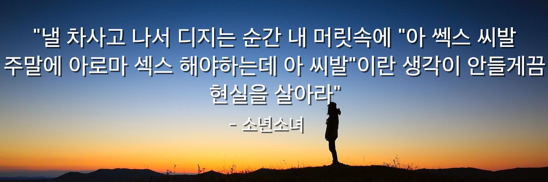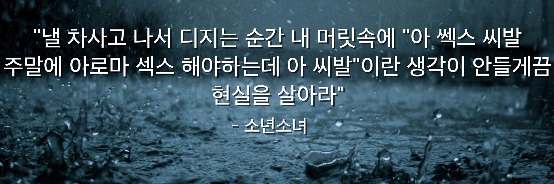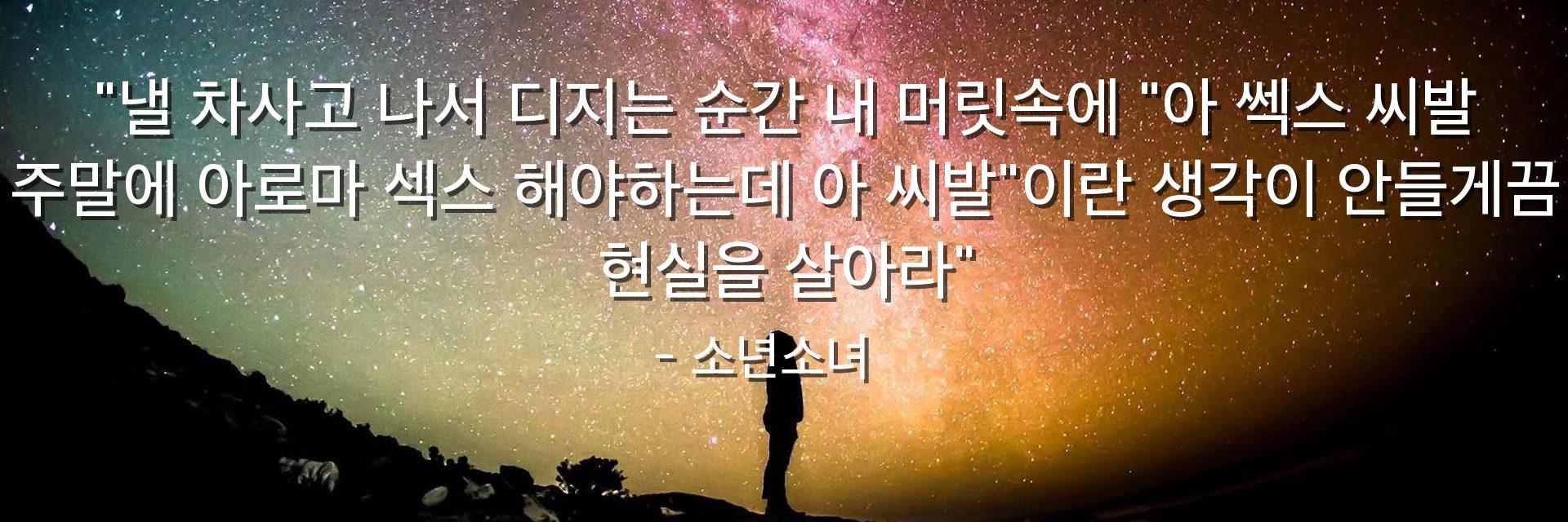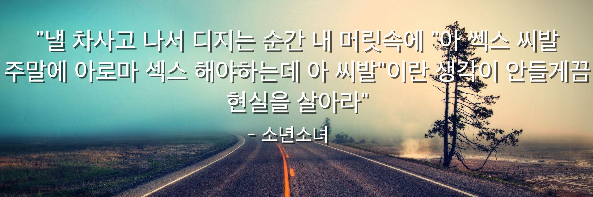 "낼 차사고 나서 디지는 순간 내 머릿속에 "아 쎅스 씨발 주말에 아로마 섹스 해야하는데 아 씨발"이란 생각이 안들게끔 현실을 살아라"