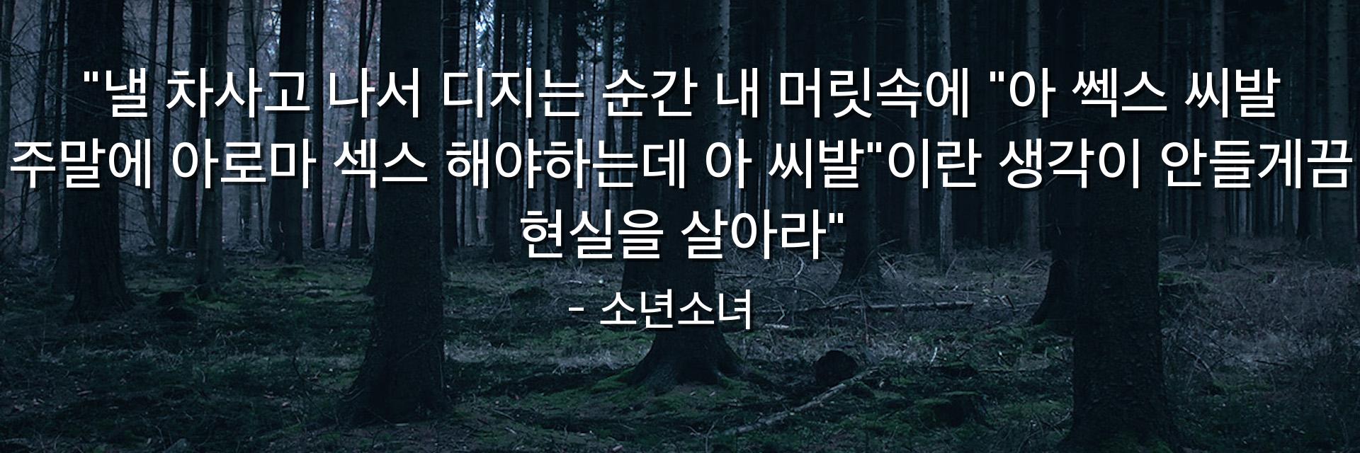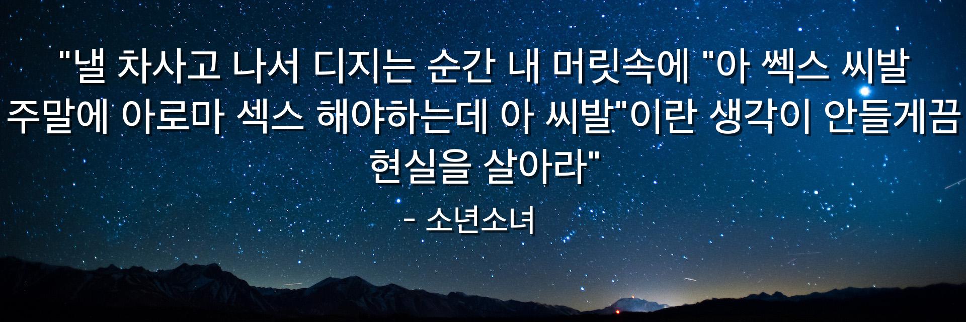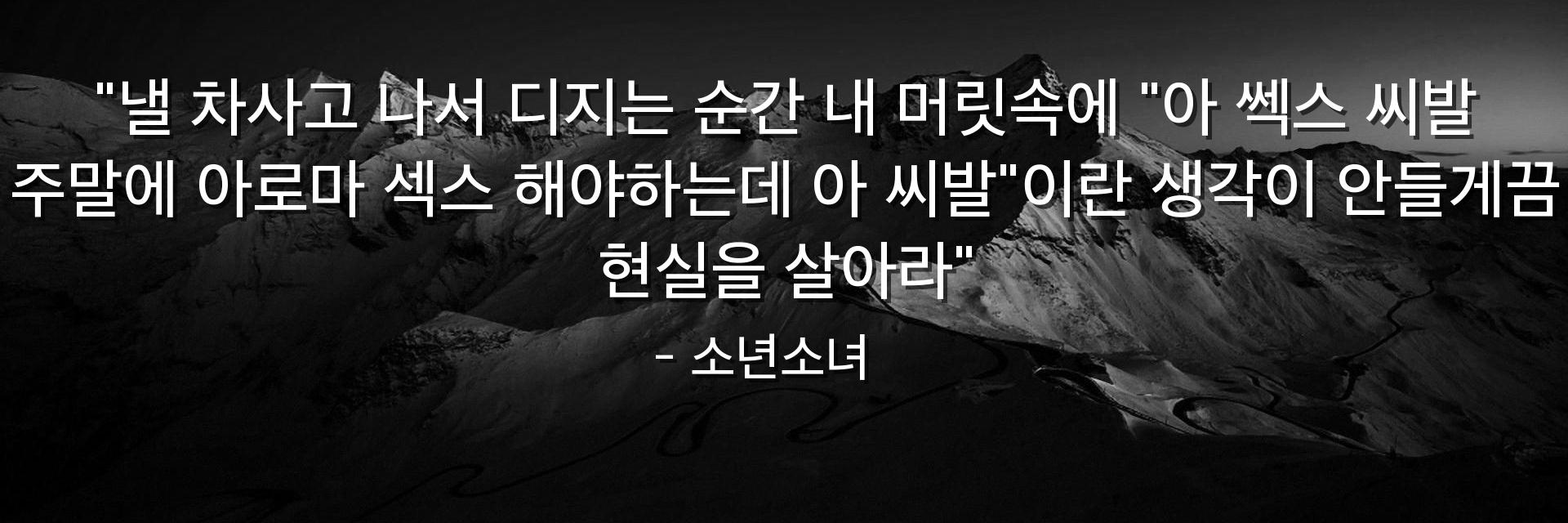 "낼 차사고 나서 디지는 순간 내 머릿속에 "아 쎅스 씨발 주말에 아로마 섹스 해야하는데 아 씨발"이란 생각이 안들게끔 현실을 살아라"