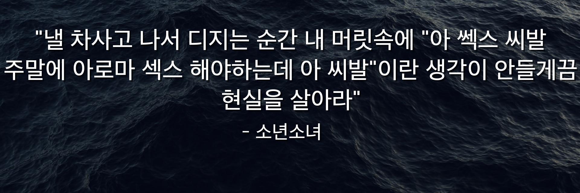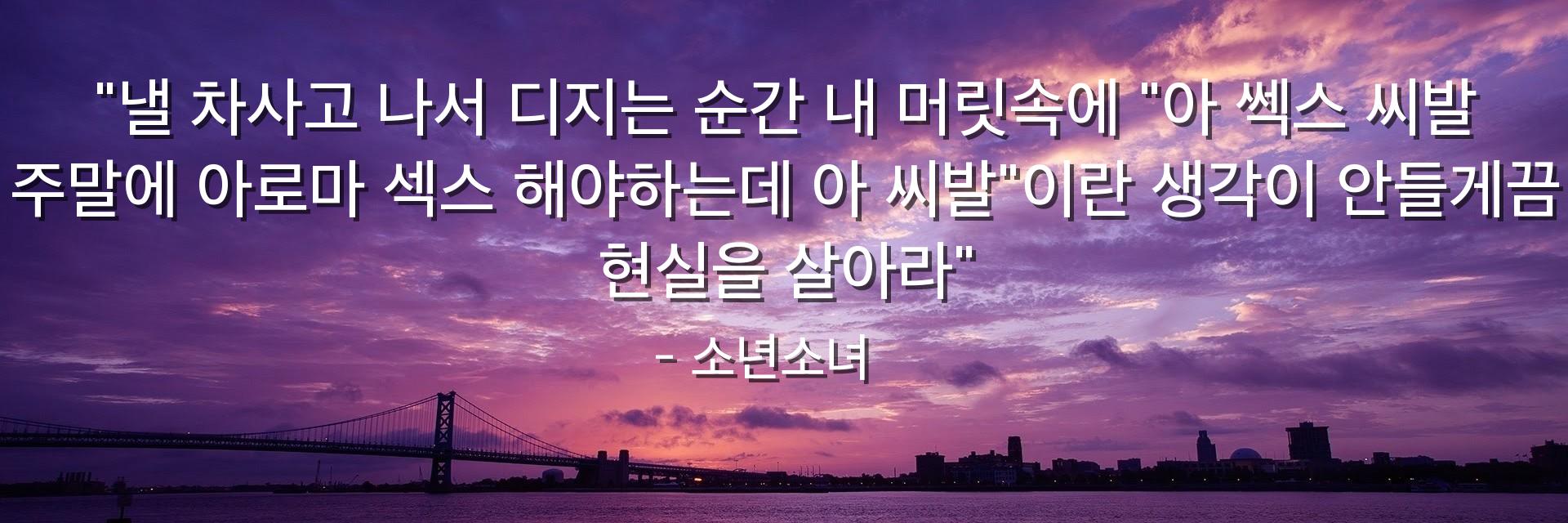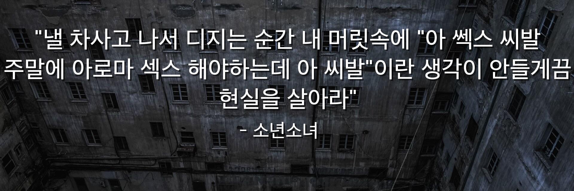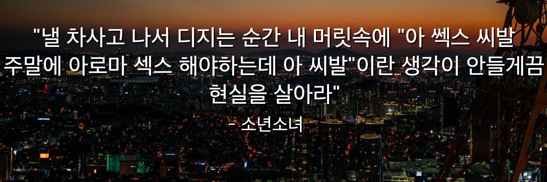 "낼 차사고 나서 디지는 순간 내 머릿속에 "아 쎅스 씨발 주말에 아로마 섹스 해야하는데 아 씨발"이란 생각이 안들게끔 현실을 살아라"
