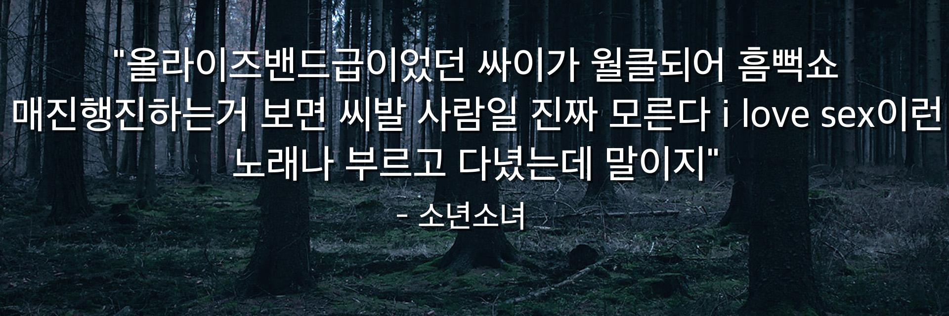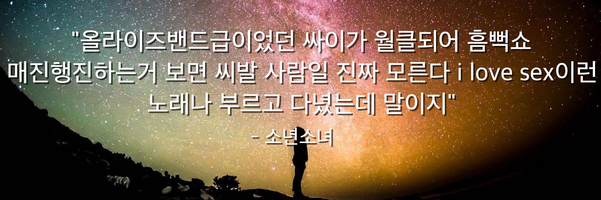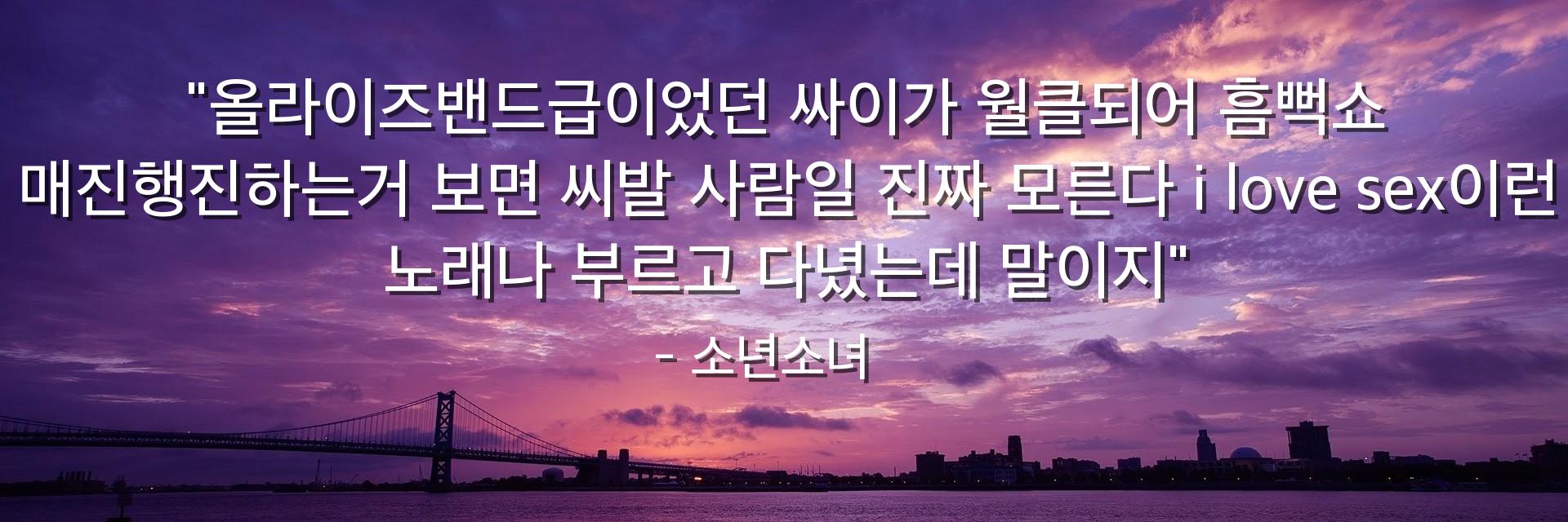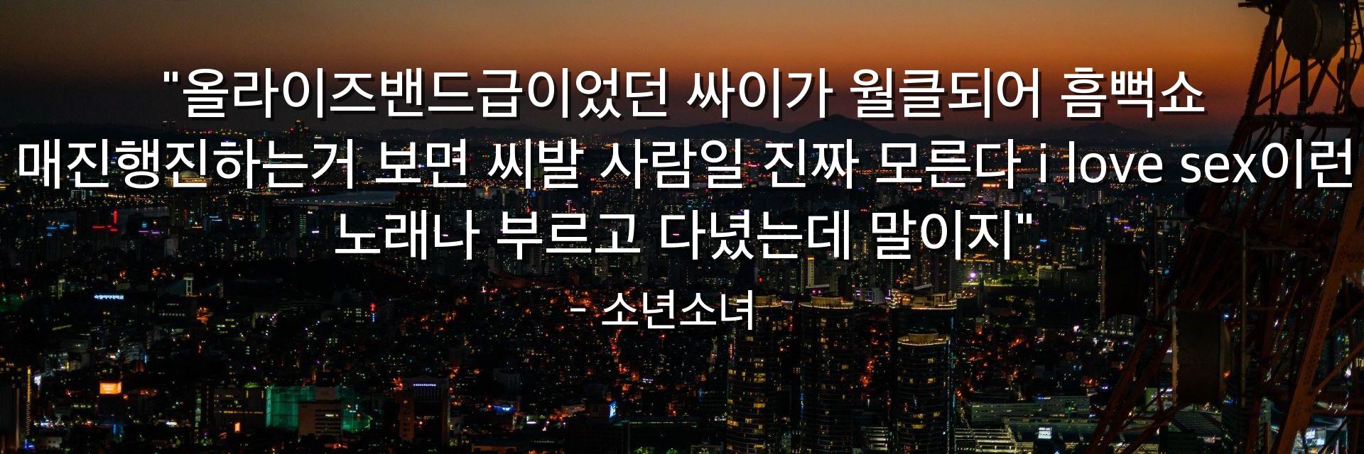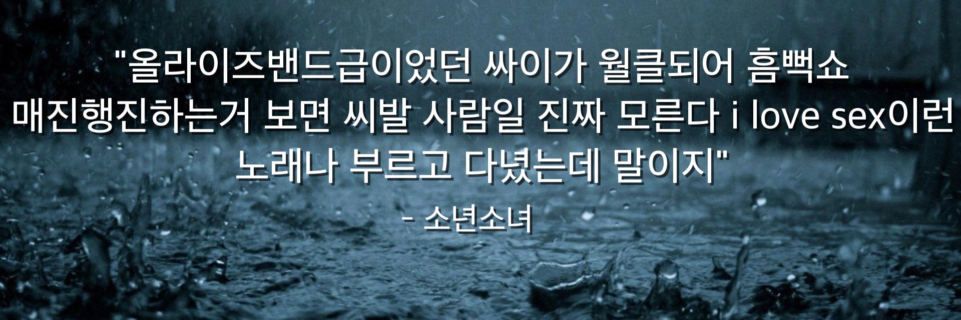 "올라이즈밴드급이었던 싸이가 월클되어 흠뻑쇼 매진행진하는거 보면 씨발 사람일 진짜 모른다 i love sex이런 노래나 부르고 다녔는데 말이지"