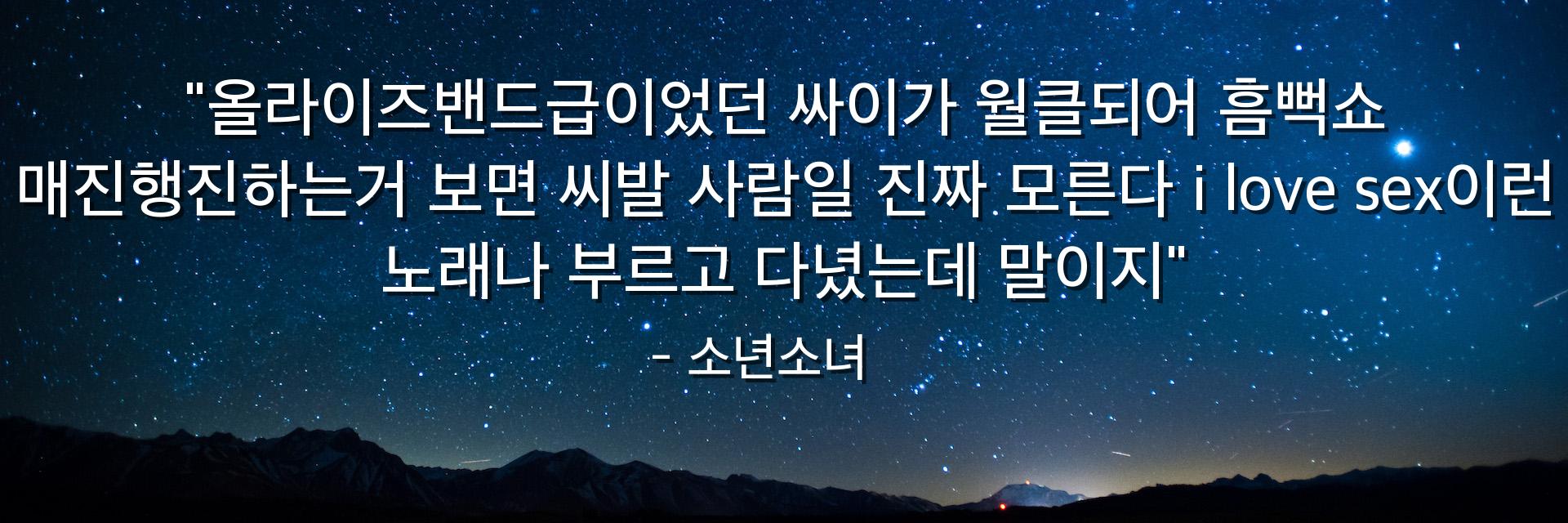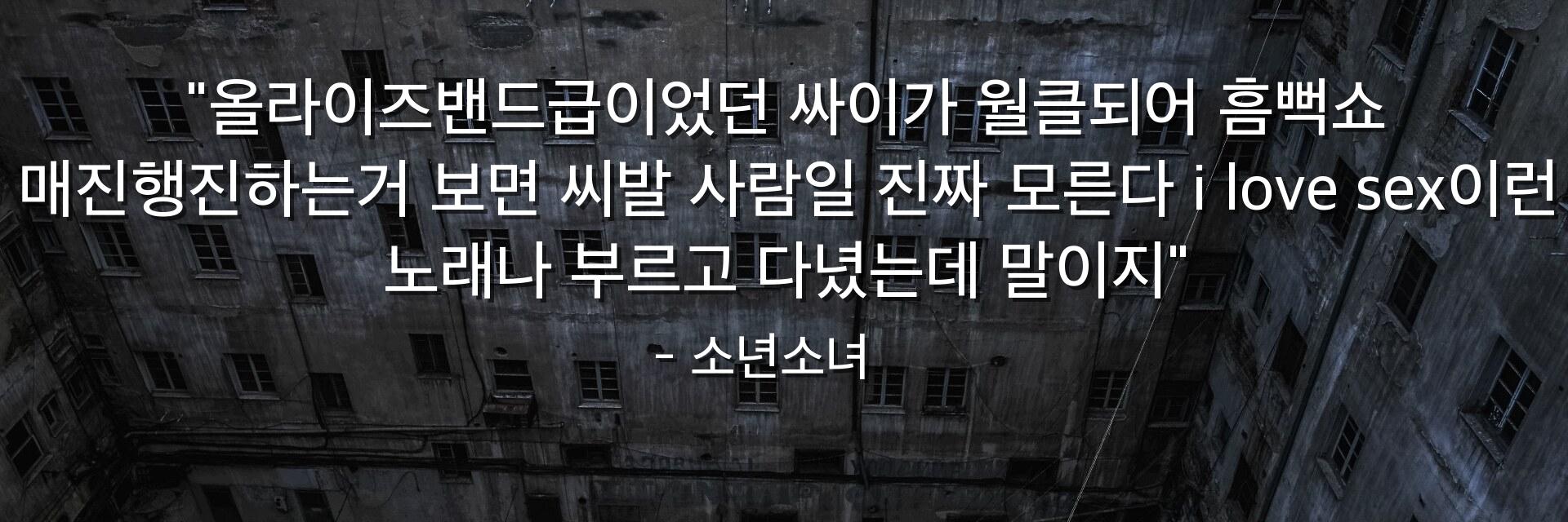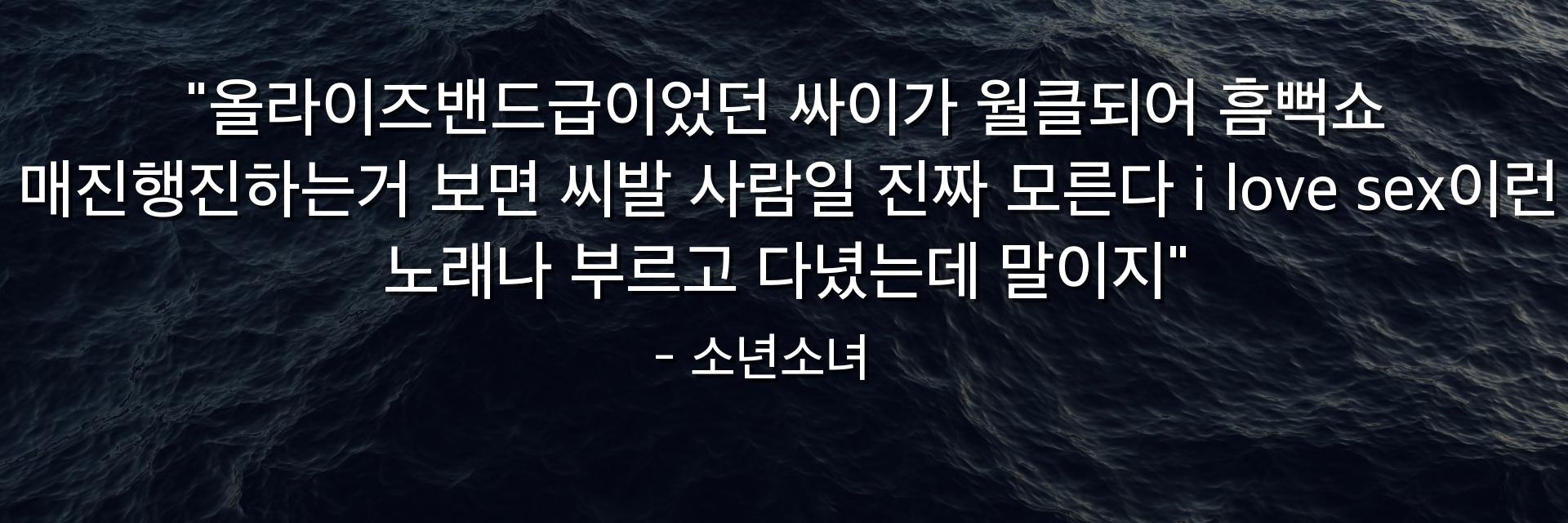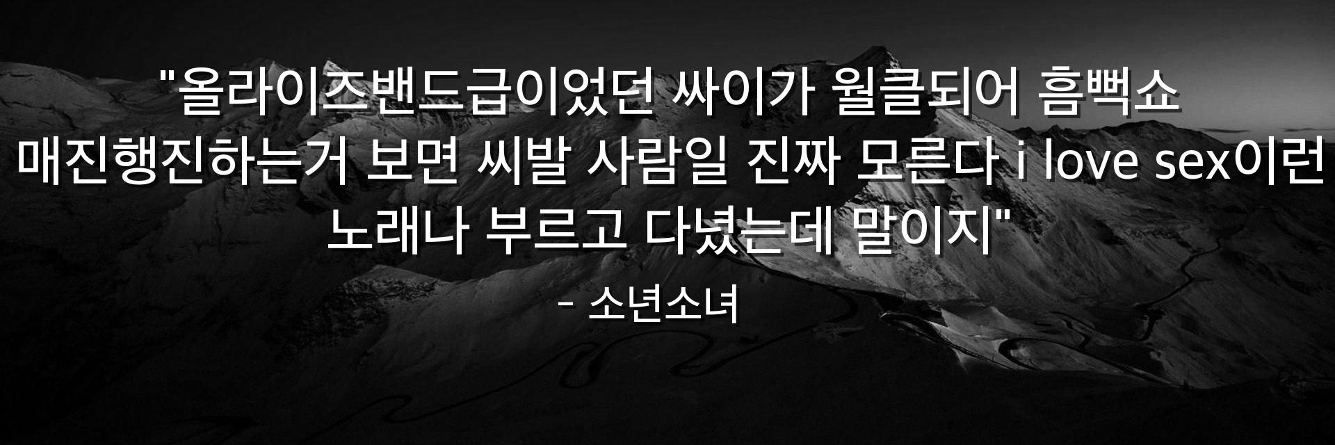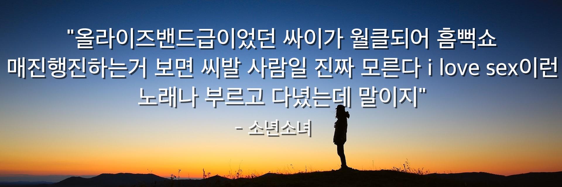 "올라이즈밴드급이었던 싸이가 월클되어 흠뻑쇼 매진행진하는거 보면 씨발 사람일 진짜 모른다 i love sex이런 노래나 부르고 다녔는데 말이지"