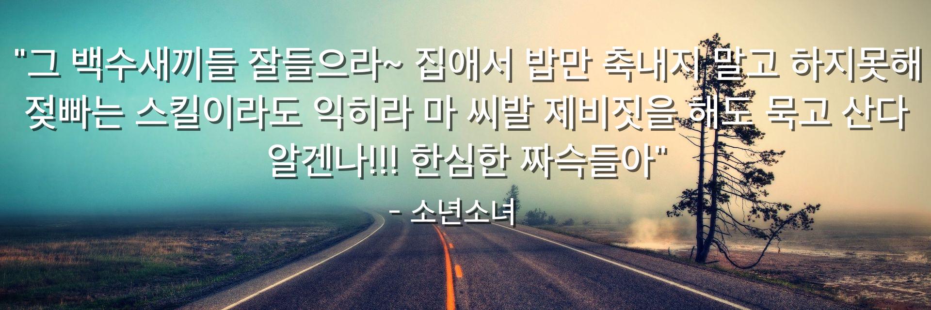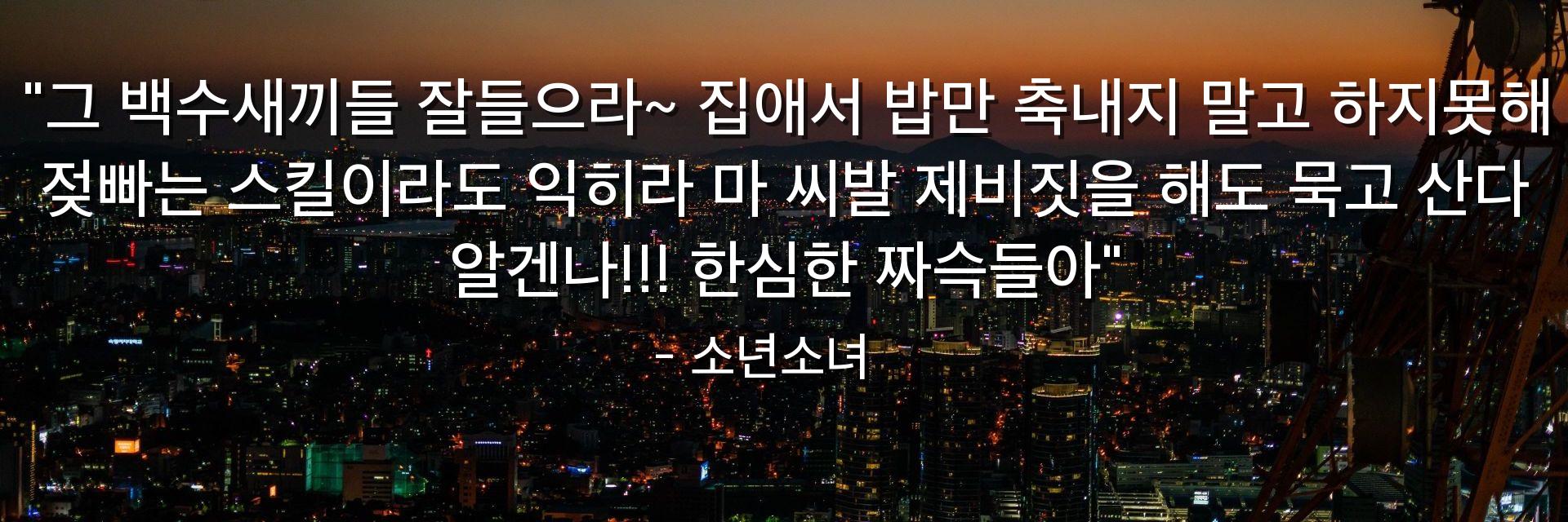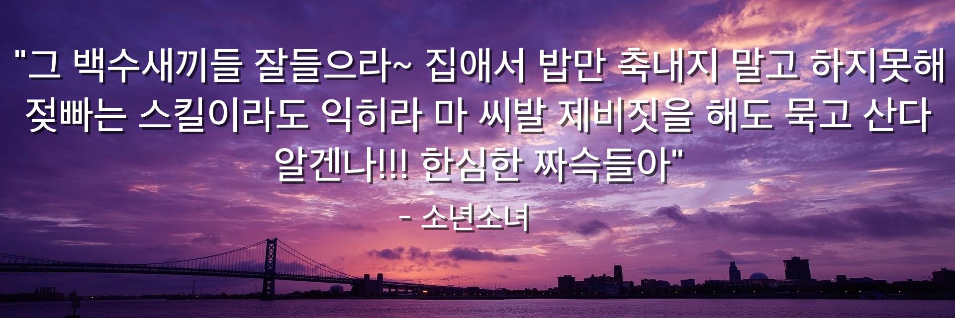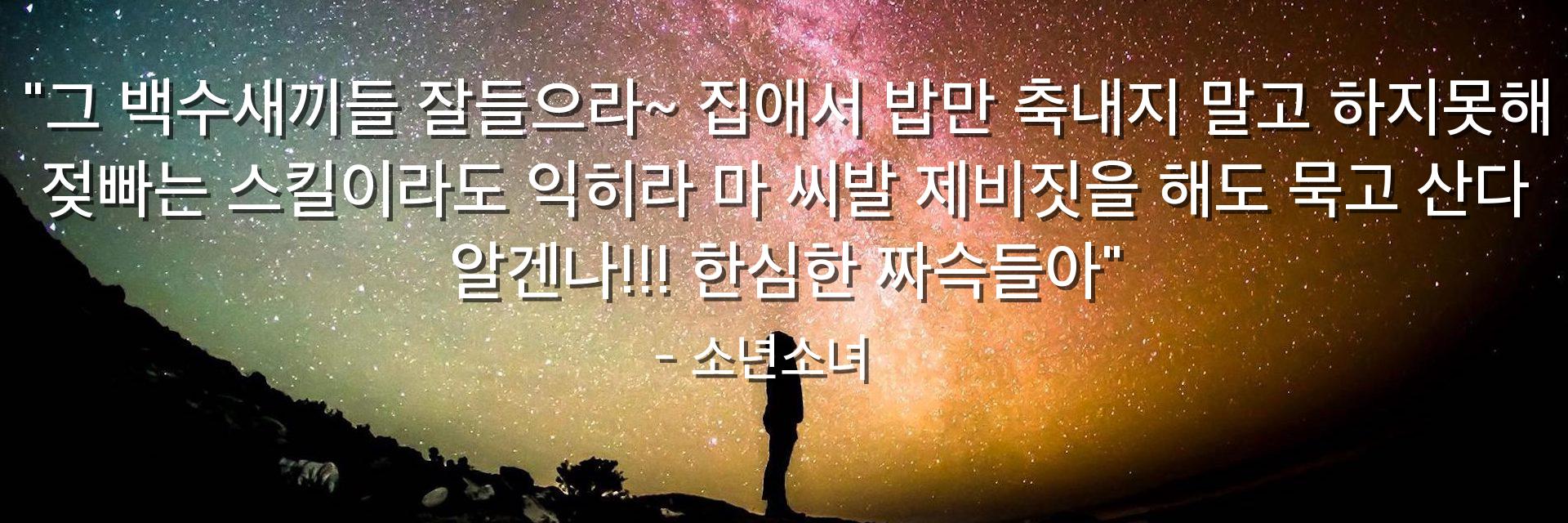 "그 백수새끼들 잘들으라~ 집애서 밥만 축내지 말고 하지못해 젖빠는 스킬이라도 익히라 마 씨발 제비짓을 해도 묵고 산다 알겐나!!! 한심한 짜슥들아"