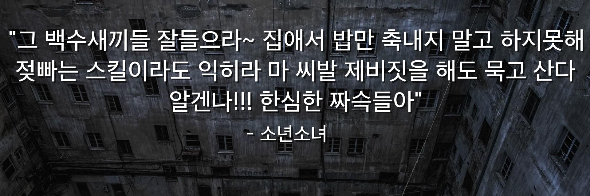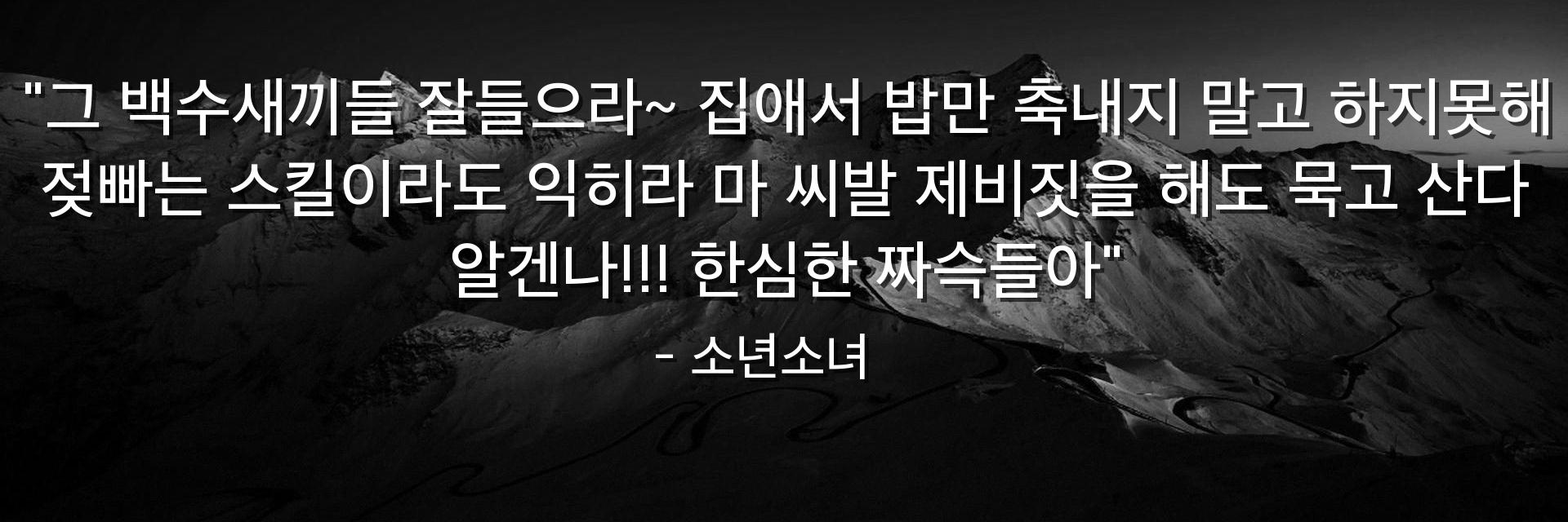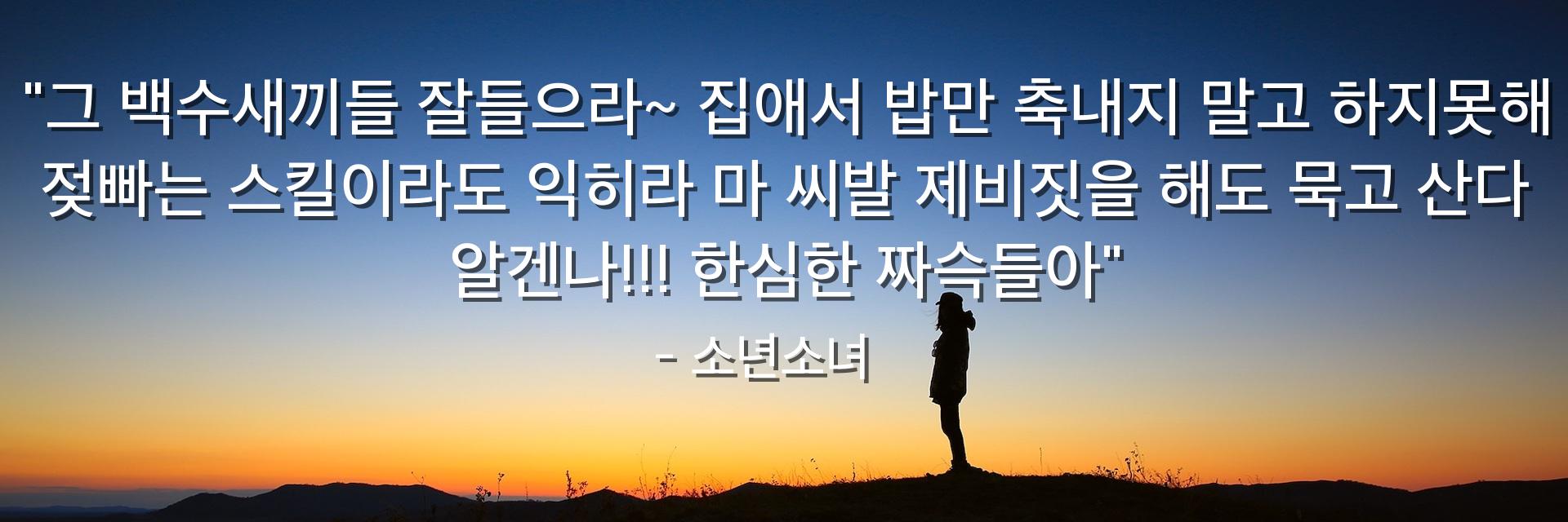 "그 백수새끼들 잘들으라~ 집애서 밥만 축내지 말고 하지못해 젖빠는 스킬이라도 익히라 마 씨발 제비짓을 해도 묵고 산다 알겐나!!! 한심한 짜슥들아"