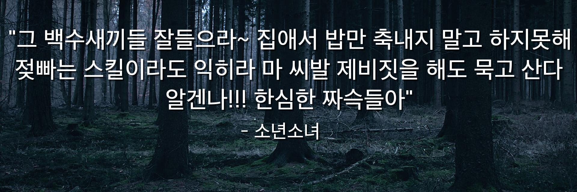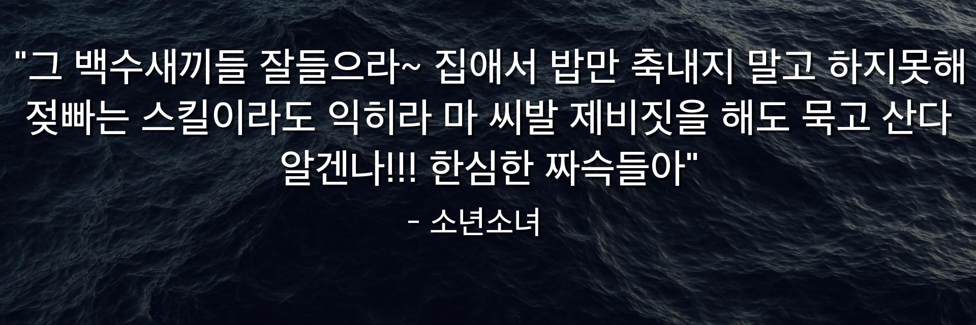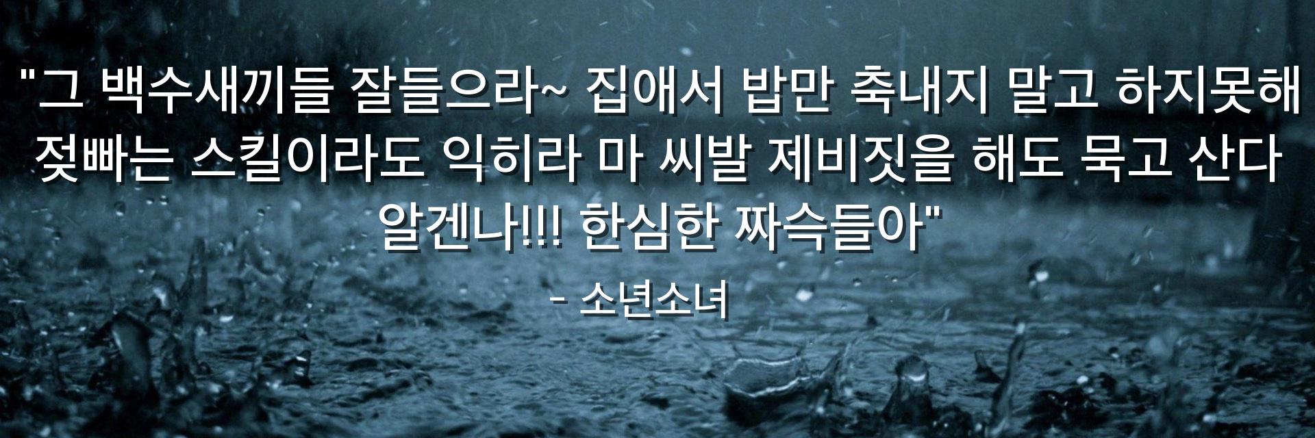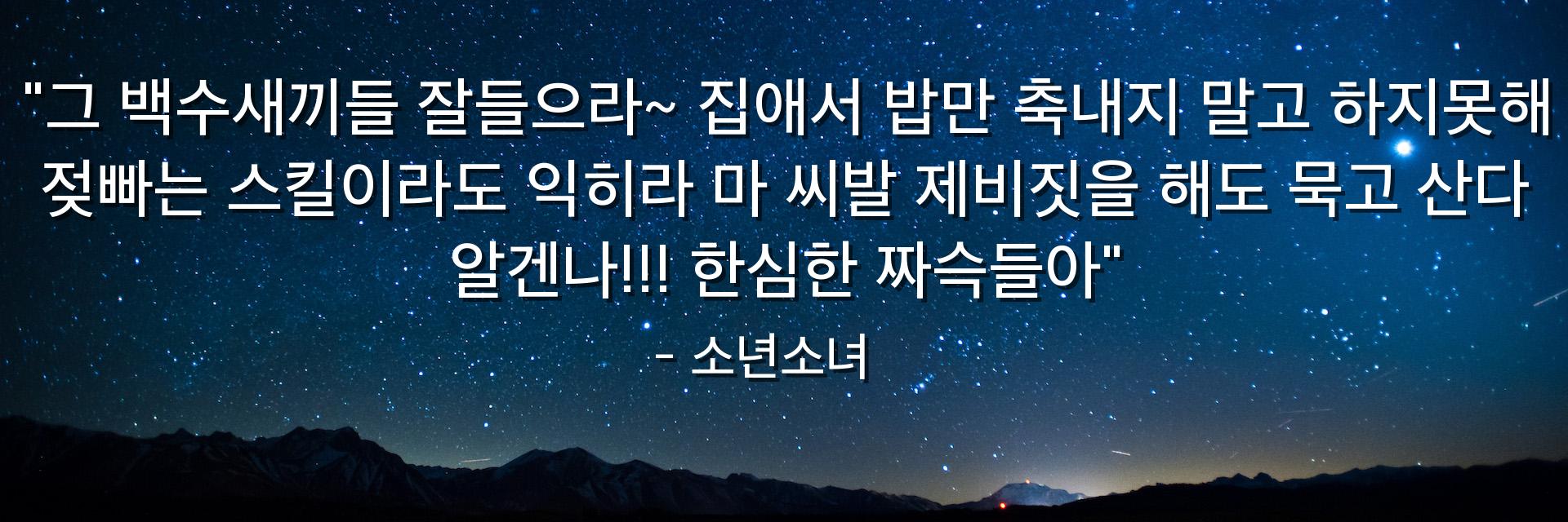 "그 백수새끼들 잘들으라~ 집애서 밥만 축내지 말고 하지못해 젖빠는 스킬이라도 익히라 마 씨발 제비짓을 해도 묵고 산다 알겐나!!! 한심한 짜슥들아"