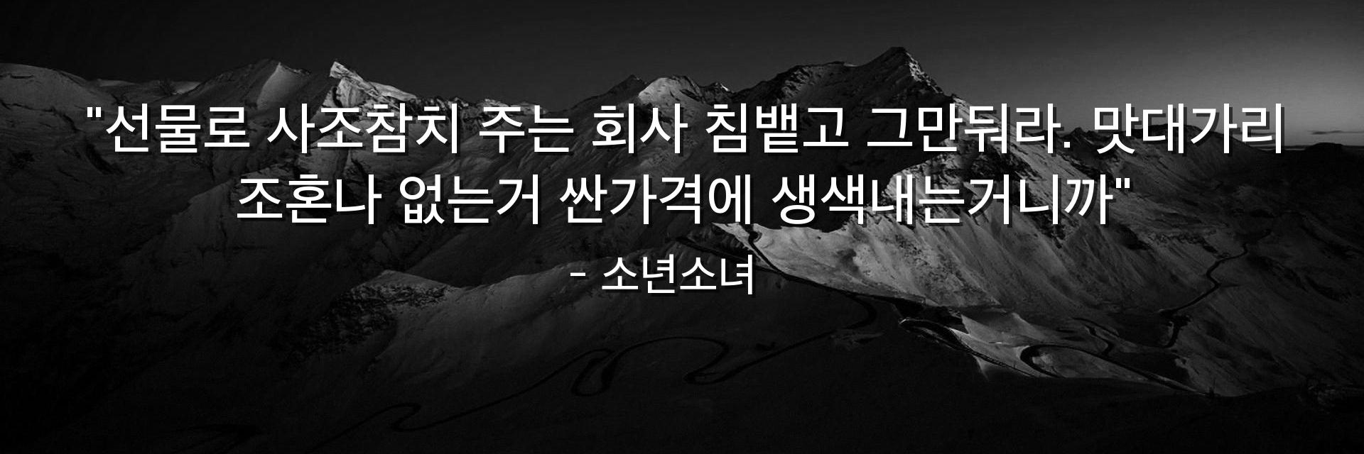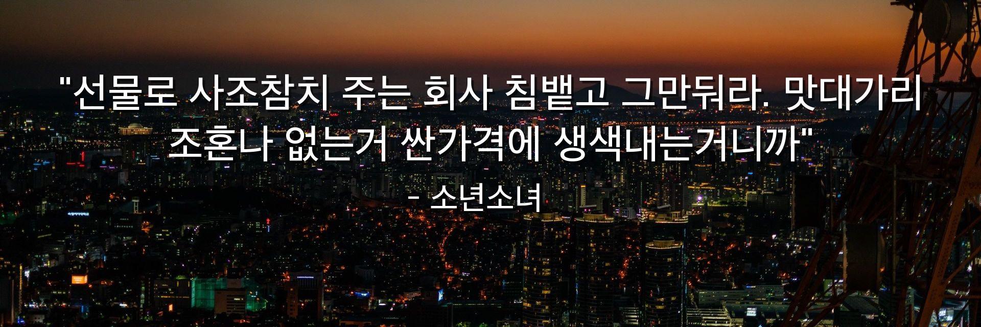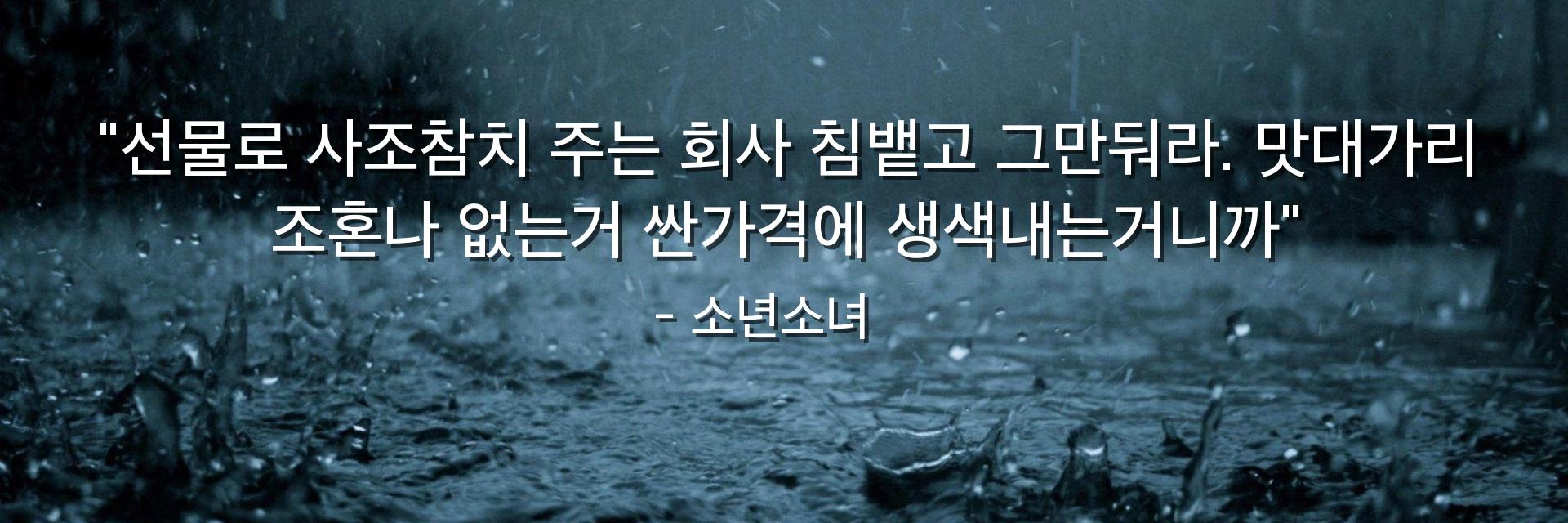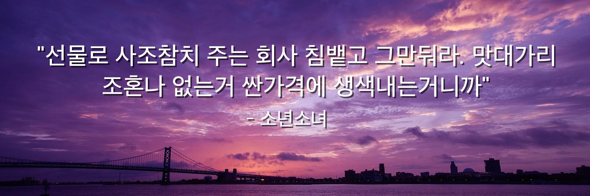 "선물로 사조참치 주는 회사 침뱉고 그만둬라. 맛대가리 조혼나 없는거 싼가격에 생색내는거니까"
