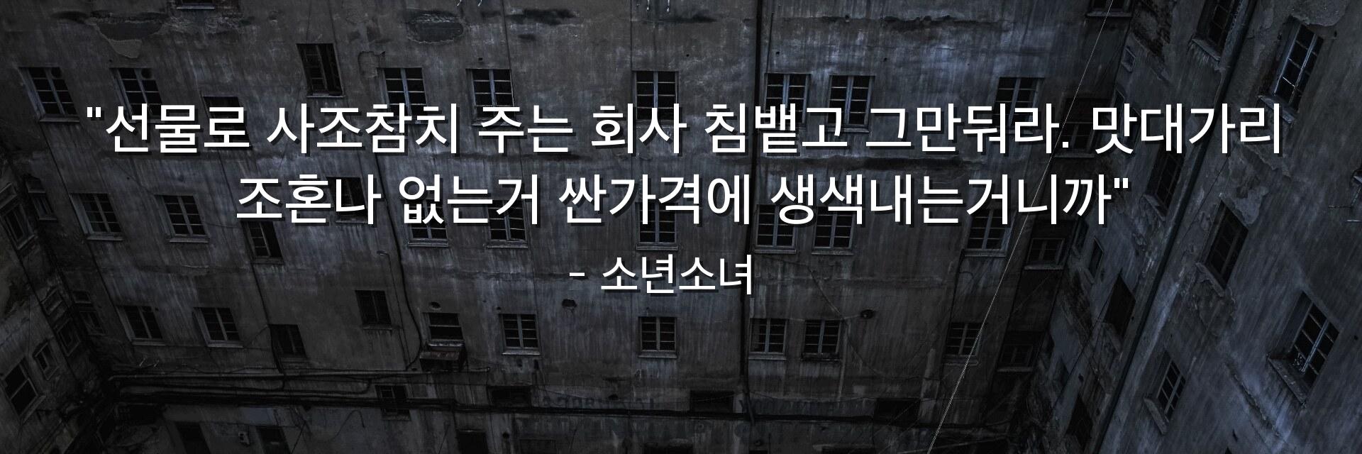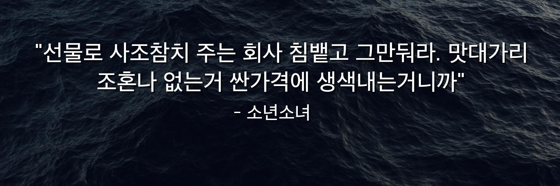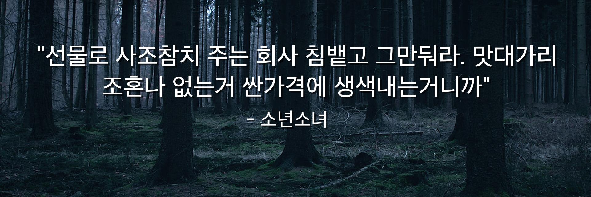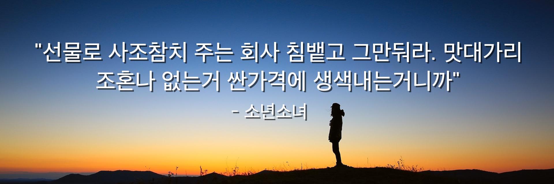 "선물로 사조참치 주는 회사 침뱉고 그만둬라. 맛대가리 조혼나 없는거 싼가격에 생색내는거니까"