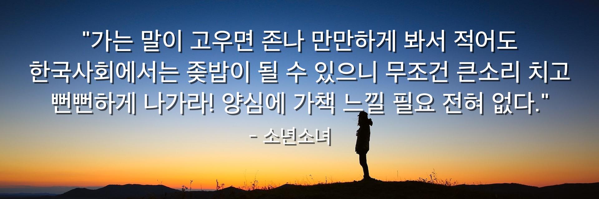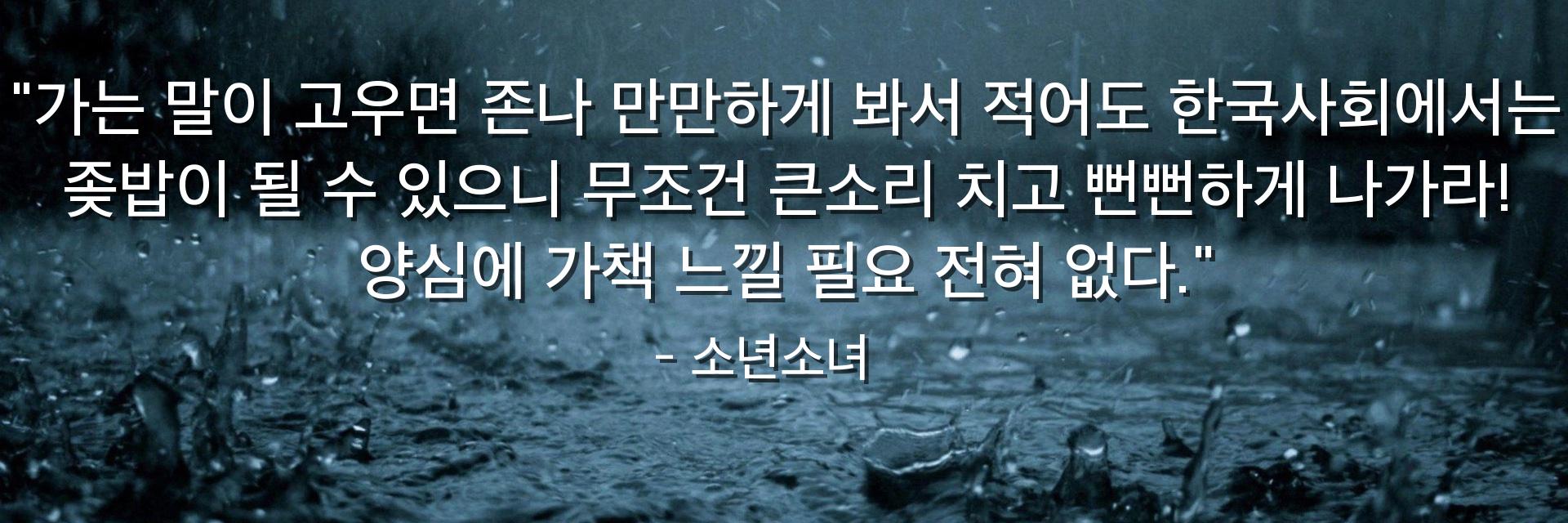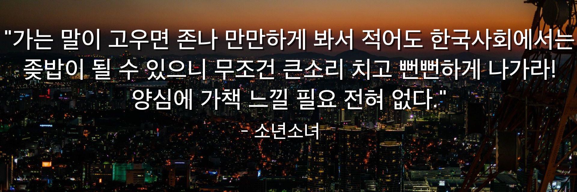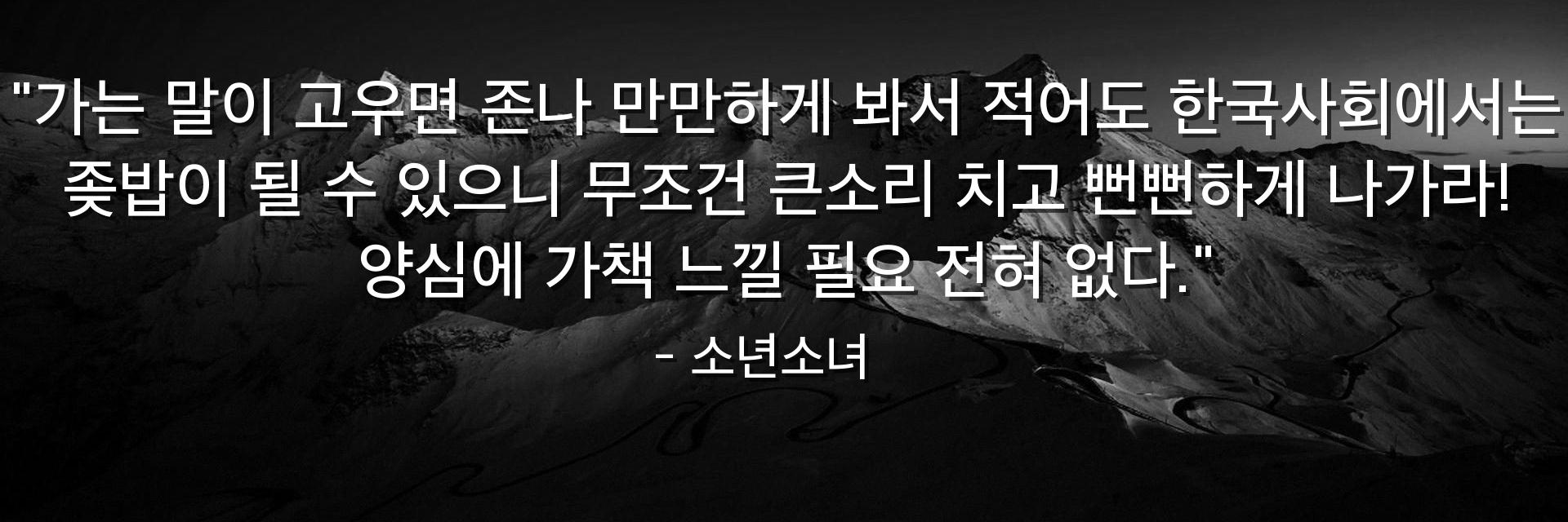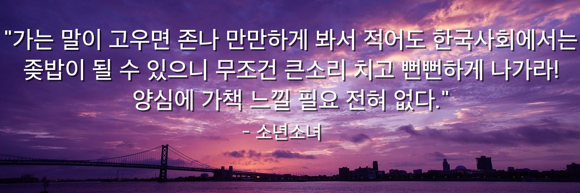 "가는 말이 고우면 존나 만만하게 봐서 적어도 한국사회에서는 좆밥이 될 수 있으니 무조건 큰소리 치고 뻔뻔하게 나가라! 양심에 가책 느낄 필요 전혀 없다."