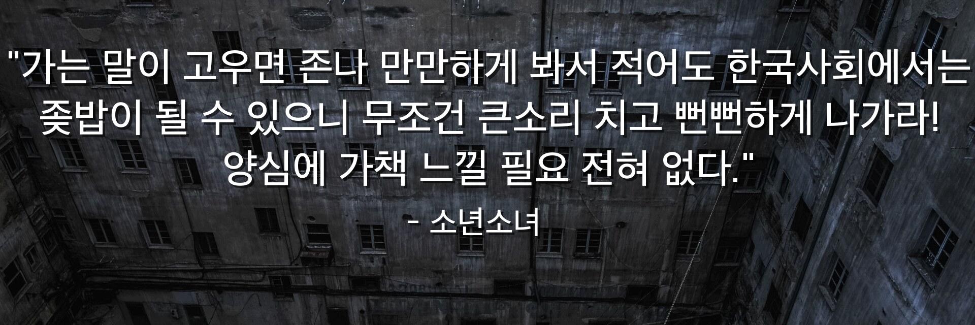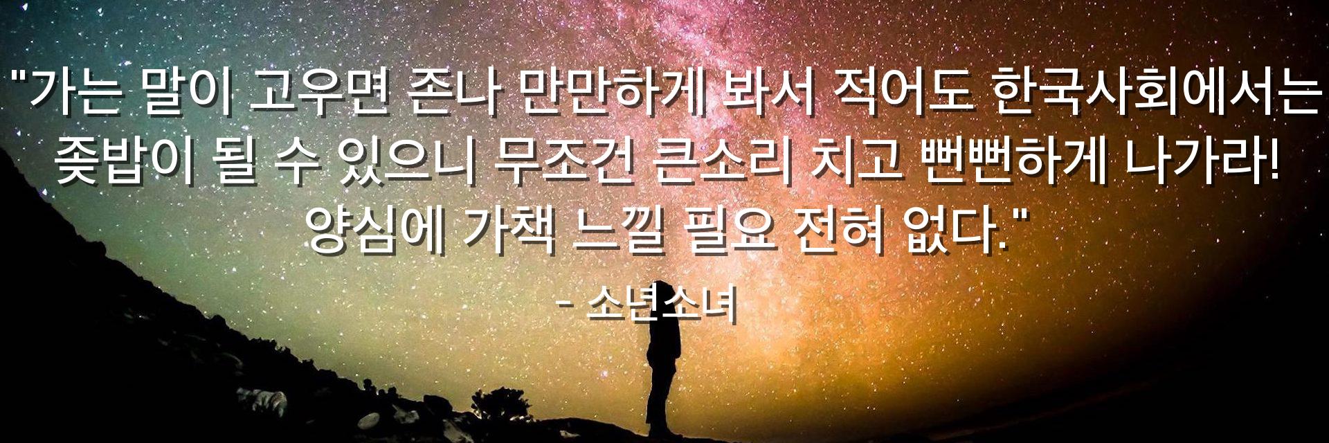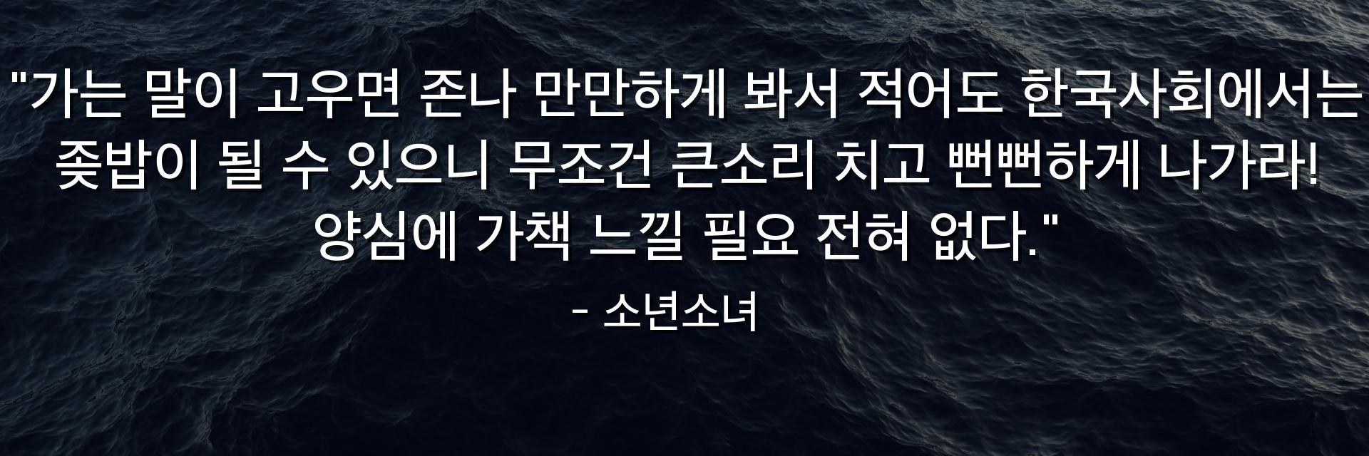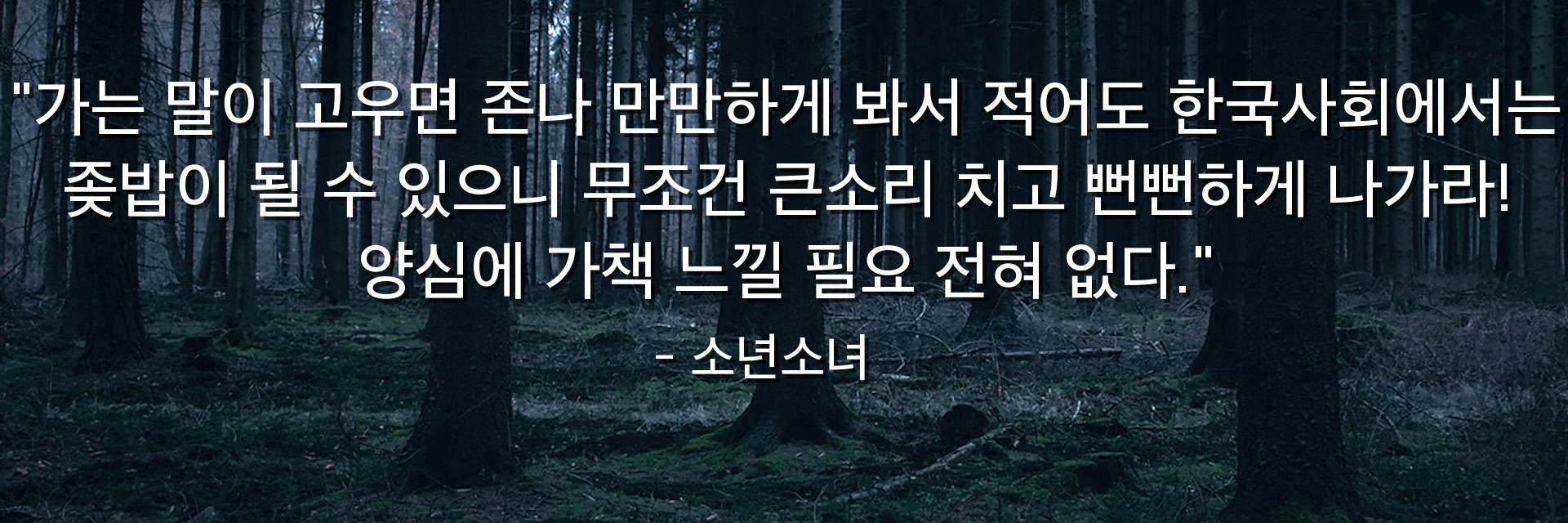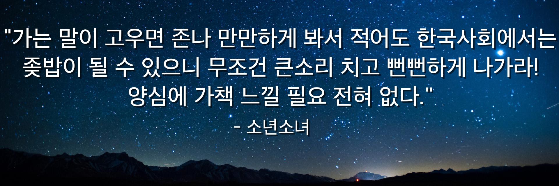 "가는 말이 고우면 존나 만만하게 봐서 적어도 한국사회에서는 좆밥이 될 수 있으니 무조건 큰소리 치고 뻔뻔하게 나가라! 양심에 가책 느낄 필요 전혀 없다."